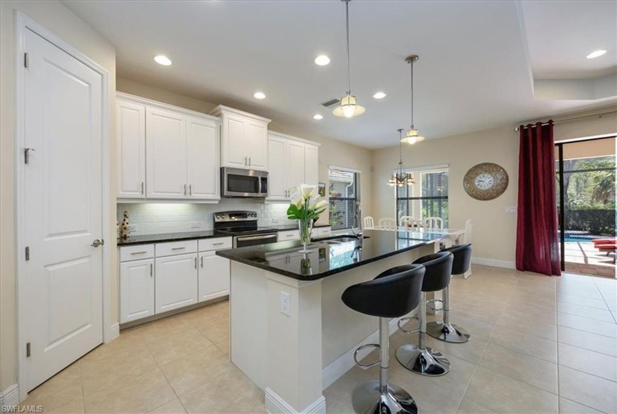 Welcome to your dream home! This beautifully maintained 3-bedroom + den, 2-bathroom residence offers the perfect blend of comfort and elegance. The open-concept floor plan features tile flooring throughout the living areas and laminate wood flooring in the bedrooms & den for easy maintenance and style. The heart of the home is the gorgeous kitchen, equipped with stainless steel appliances, white shaker-style cabinets, granite countertops, and a spacious center island with additional storage—perfect for meal prep and entertaining. Step outside to your private oasis—a large pavered lanai with a sparkling pool and a covered sitting area overlooking the peaceful, private preserve. It's the ideal spot to unwind and enjoy Florida’s beautiful weather year-round. Additional highlights include a newer AC, a 2-car garage, pavered driveway, a versatile den perfect for a home office or extra guest room, and a thoughtful layout designed for modern living. Located in the desirable Canopy community, just minutes from top rated schools, restaurants, shopping, entertainment and the sparkling Gulf beaches. Don’t miss out on this opportunity to enjoy the Florida lifestyle.
