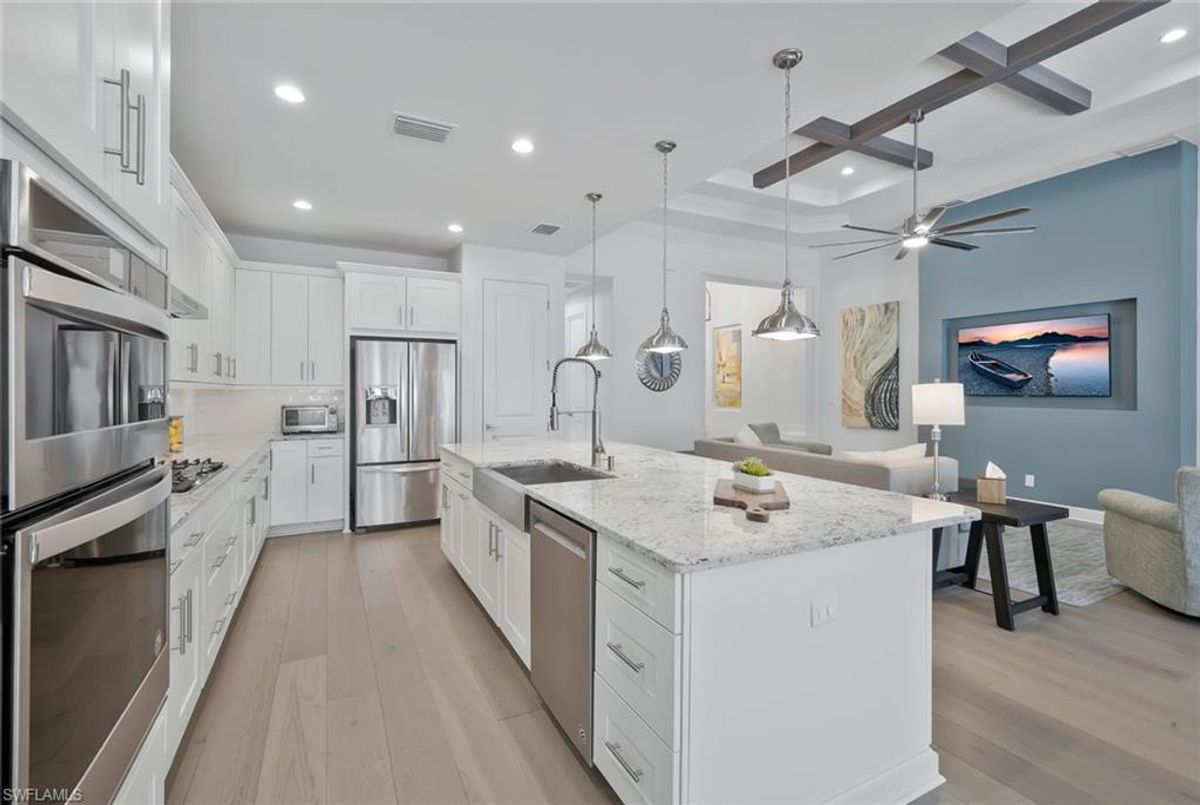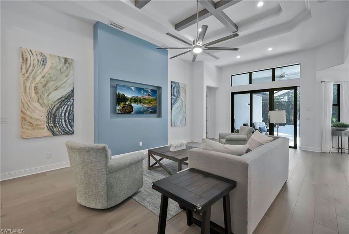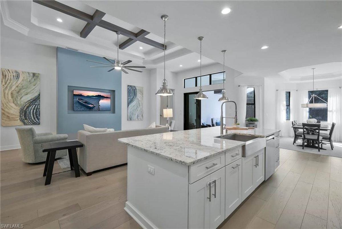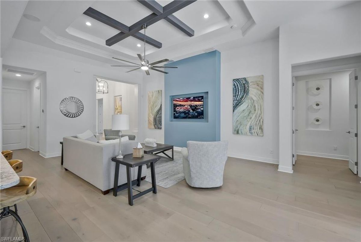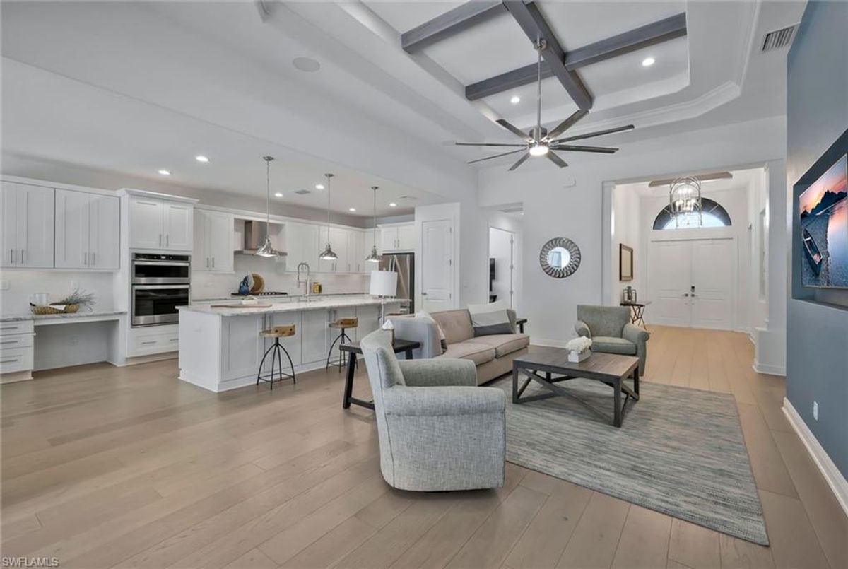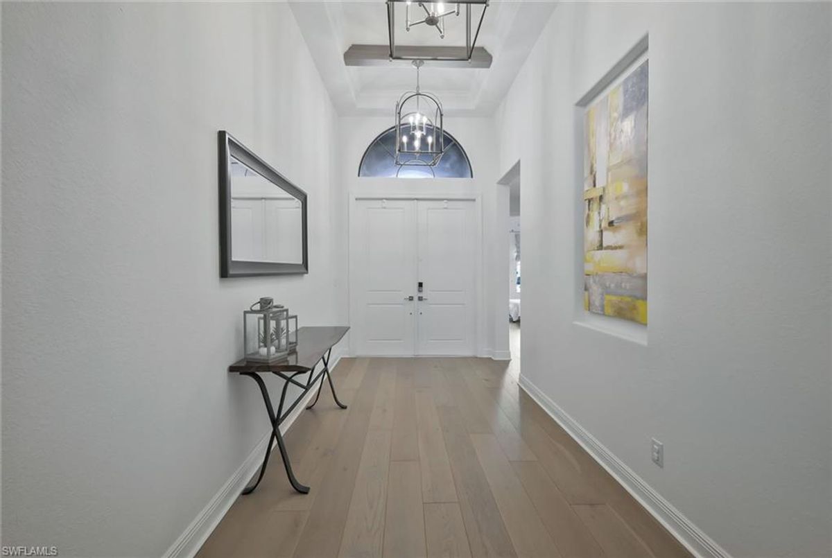 This stunning 3 bedroom plus den Serino model home built by Toll Brothers awaits in the prime location of North Naples. Conveniently located east of I-75 and Immokalee Rd. Palazzo at Naples is a gated boutique community with only 85 homes. This home features a columned entry ceiling with matching beams in the extended great room and hardwood floors throughout. The gourmet kitchen is a chef's dream with 42" cabinets topped with crown molding. It boasts an oversized island with cabinets on both sides, making for extra storage. A gorgeous farm style sink with a high quality faucet perfect for entertaining. Stainless steel appliances including a 36" gas cook top. The primary bath is a sanctuary of relaxation with a free standing tub, massive walk through shower, dual shower heads and exquisite tile. Enjoy the private outdoor area finished with a saltwater pool and spa. This home has so many great features including a drop zone in the laundry room and hurricane doors and windows throughout to name a few. Membership opportunities are available at neighboring Quail Creek and Longshore Lake. This natural gas community also features NO CDD ,low HOA fees and not in a flood zone ( Flood Zone X) adding to its appeal. Located just 6 miles to pristine beaches, 20 minutes to RSW airport, downtown 5th Ave's world class dining and shopping are just 25 minutes away. Don't miss the chance to call this one home!