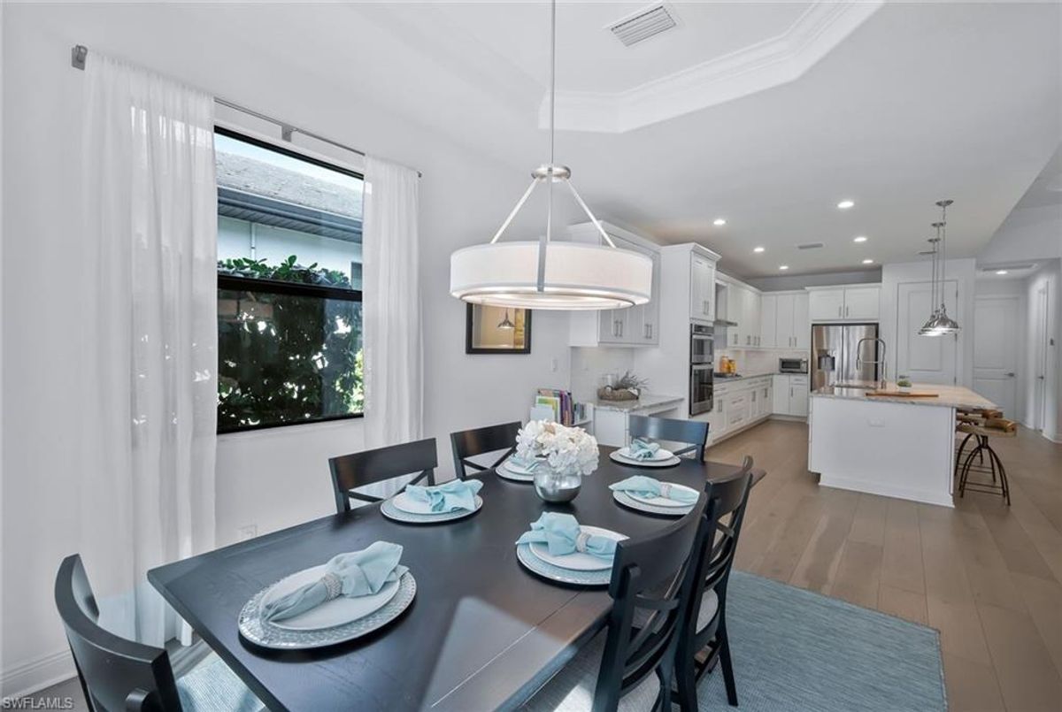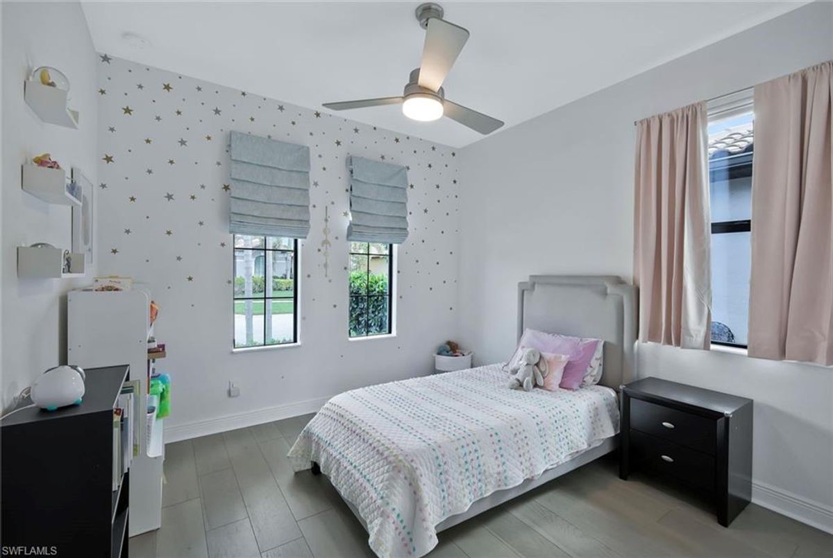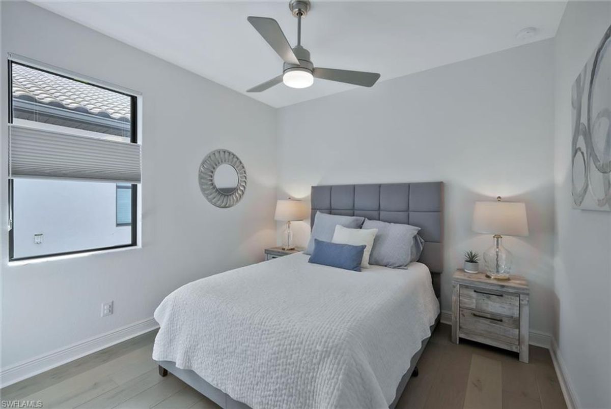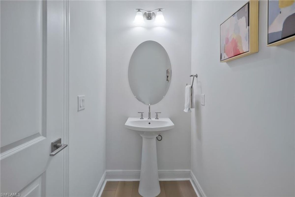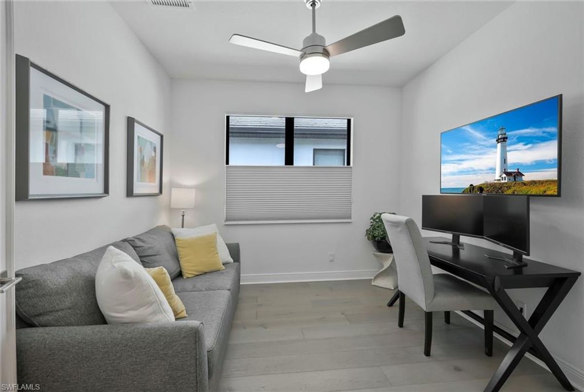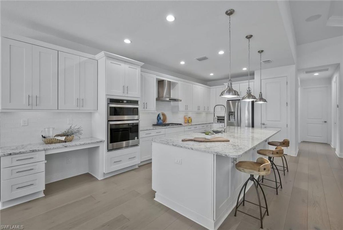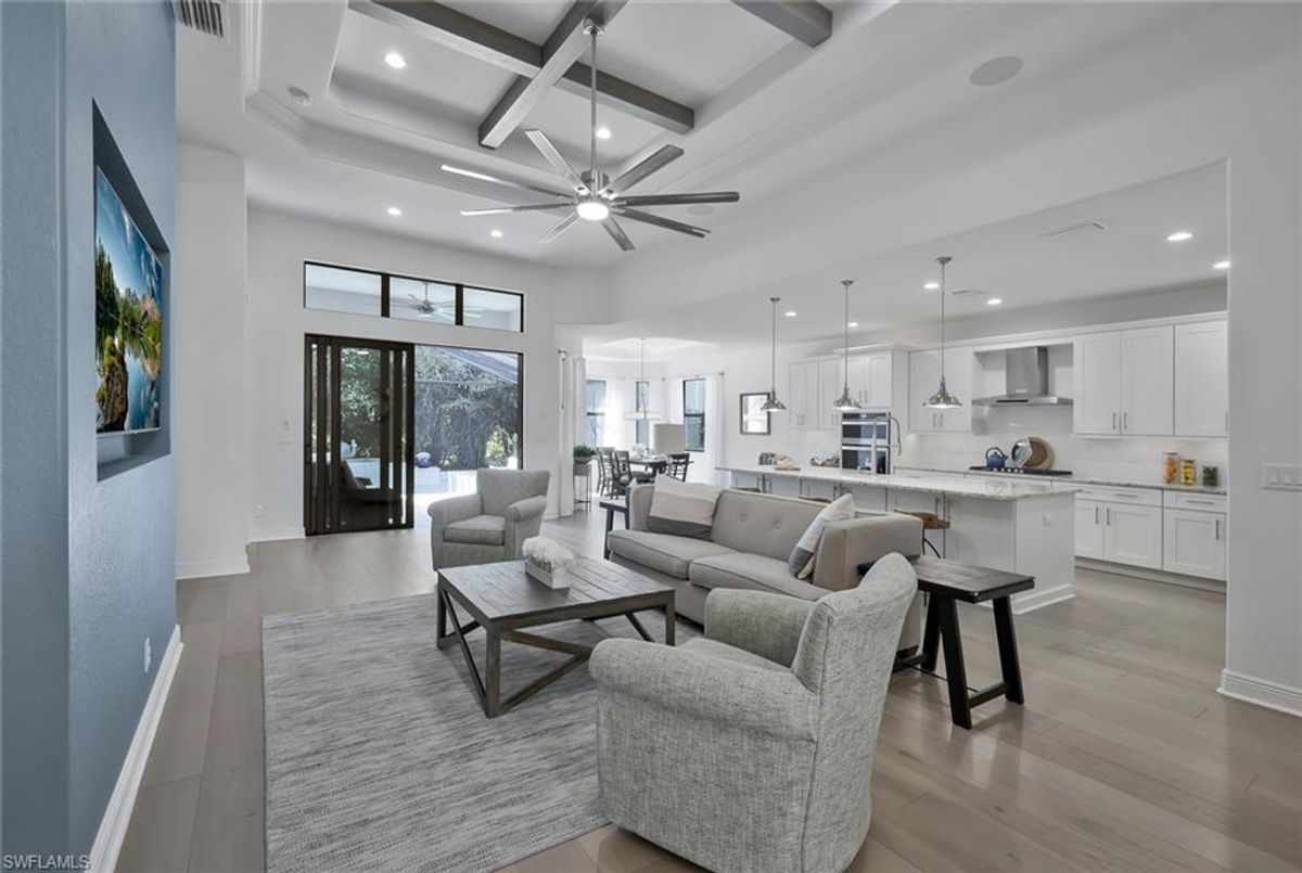This stunning 3 bedroom plus den Serino model home built by Toll Brothers awaits in the prime location of North Naples. Conveniently located east of I-75 and Immokalee Rd. Palazzo at Naples is a gated boutique community with only 85 homes. This home features a columned entry ceiling with matching beams in the extended great room and hardwood floors throughout. The gourmet kitchen is a chef's dream with 42" cabinets topped with crown molding. It boasts an oversized island with cabinets on both sides, making for extra storage. A gorgeous farm style sink with a high quality faucet perfect for entertaining. Stainless steel appliances including a 36" gas cook top. The primary bath is a sanctuary of relaxation with a free standing tub, massive walk through shower, dual shower heads and exquisite tile. Enjoy the private outdoor area finished with a saltwater pool and spa. This home has so many great features including a drop zone in the laundry room and hurricane doors and windows throughout to name a few. Membership opportunities are available at neighboring Quail Creek and Longshore Lake. This natural gas community also features NO CDD ,low HOA fees and not in a flood zone ( Flood Zone X) adding to its appeal. Located just 6 miles to pristine beaches, 20 minutes to RSW airport, downtown 5th Ave's world class dining and shopping are just 25 minutes away. Don't miss the chance to call this one home!