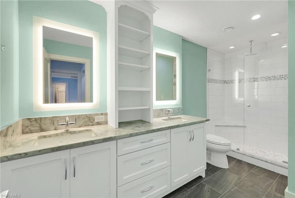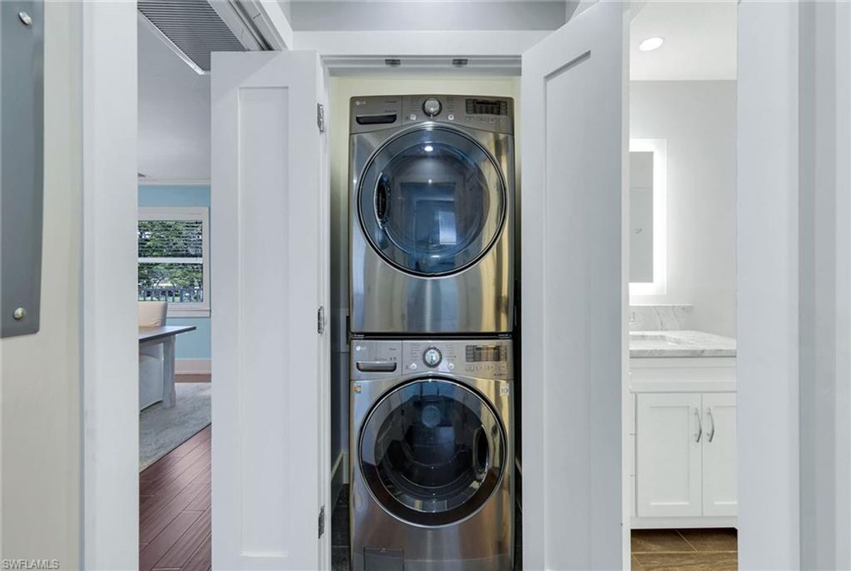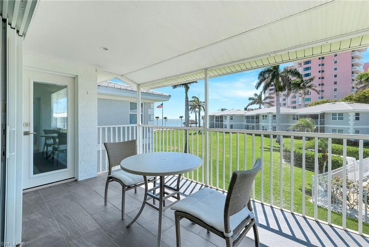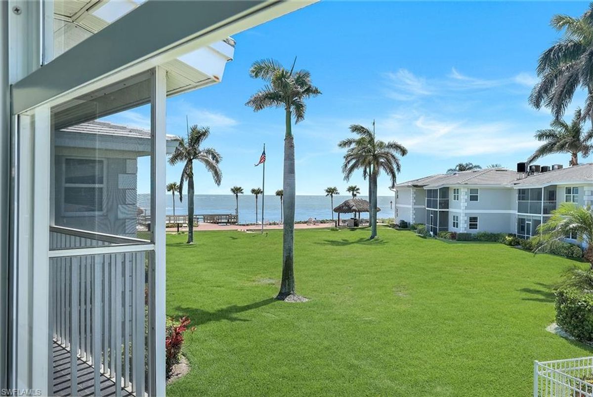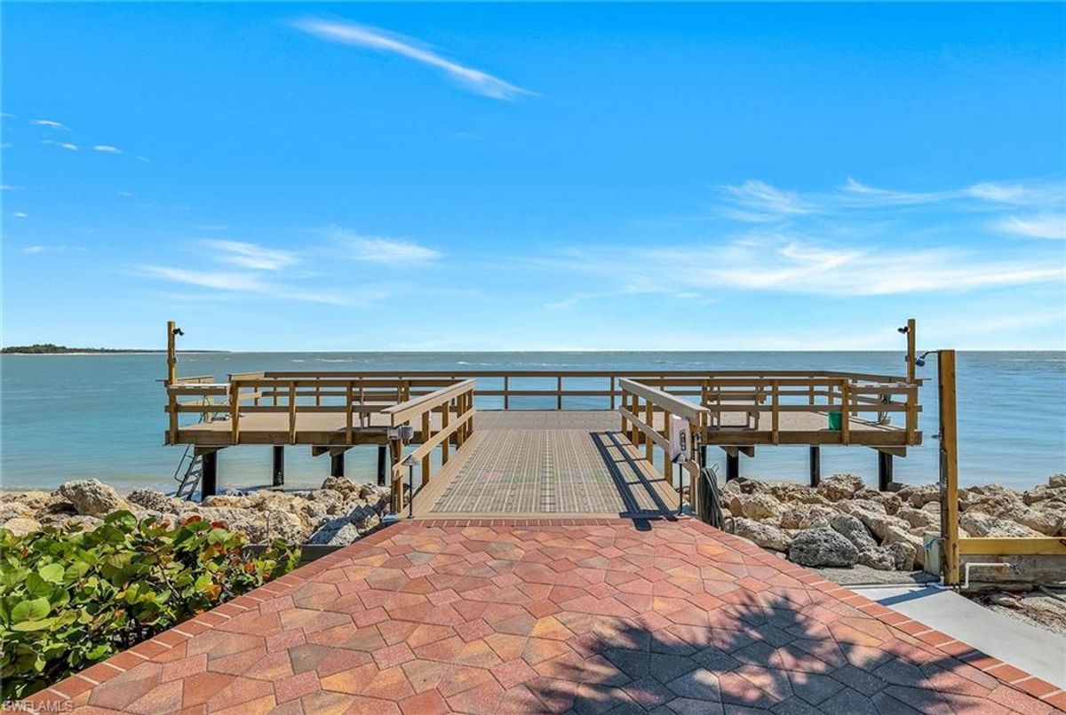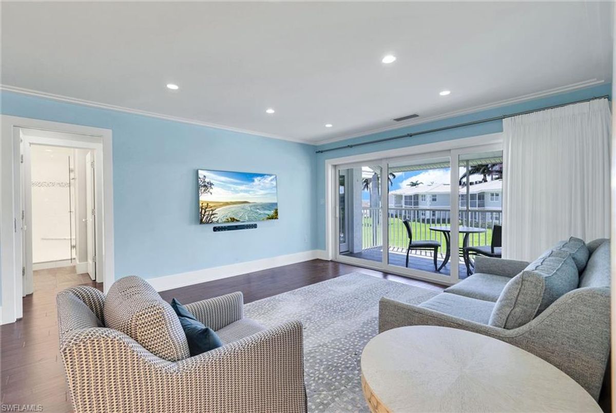 Experience coastal elegance in this beautifully renovated South End condominium, offering serene garden and Caxambas Pass views. The main living area features stunning Pacific Walnut Fiji hardwood flooring with a Pro-Flex 90 sound barrier, complemented by tile in the baths. Completely remodeled, this exceptional unit showcases a raised ceiling (now 8-foot-6-inches) with crown molding, customed closets, upgraded PEX plumbing, impact-resistant windows and sliders, new roof and newer air conditioner for peace of mind. The open-concept kitchen is a showstopper, with stone countertops, bar seating by the window, a stylish subway tile backsplash and crisp white shaker cabinetry. The primary bedroom offers a stunning custom closet. Both baths echo this sophisticated look with matching white shaker vanities, quartz counters, frameless glass shower enclosures, elegant white-and-gray tilework and lighted mirrors. Offered partially furnished in a calming coastal palette of soft neutrals and blues. Enjoy alfresco dining or simply unwind on the spacious screened lanai with southern exposure. This property has exterior elevator to access the second level on each end of the building.