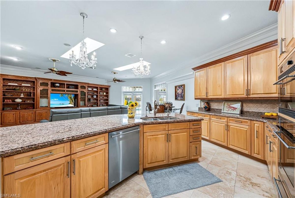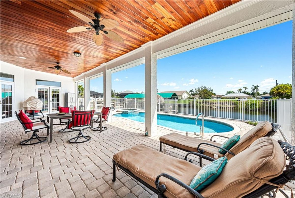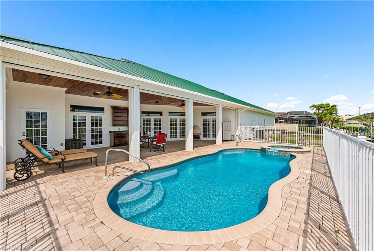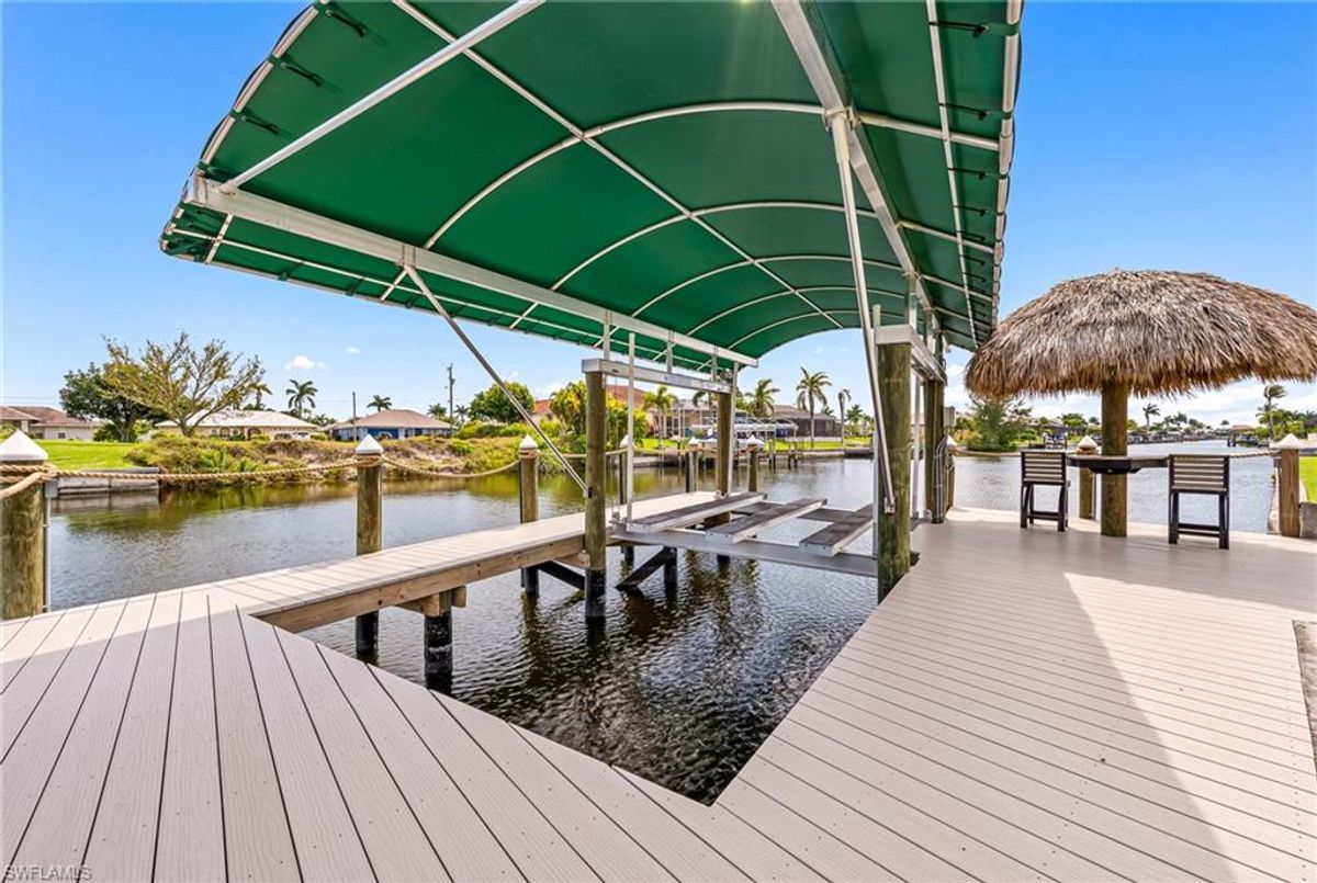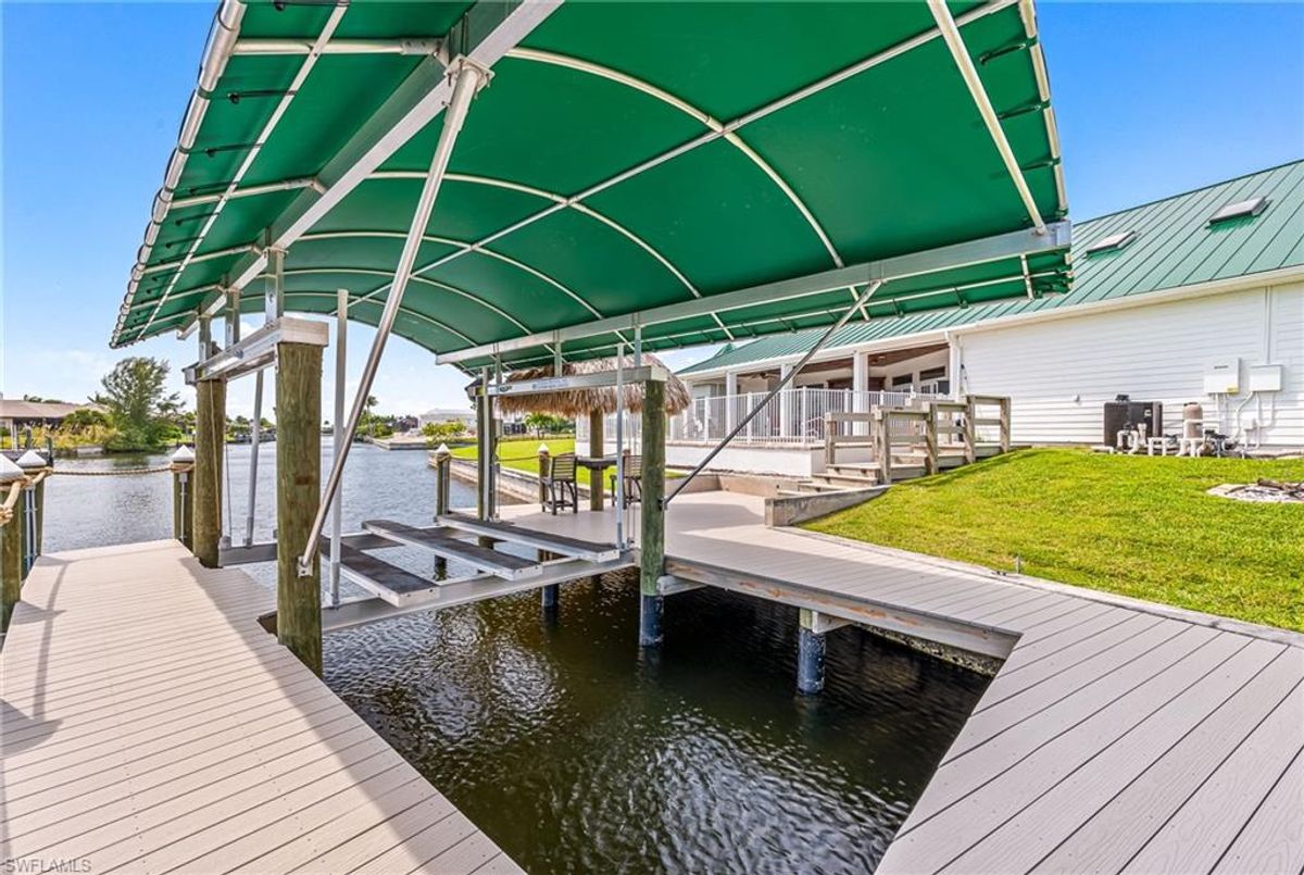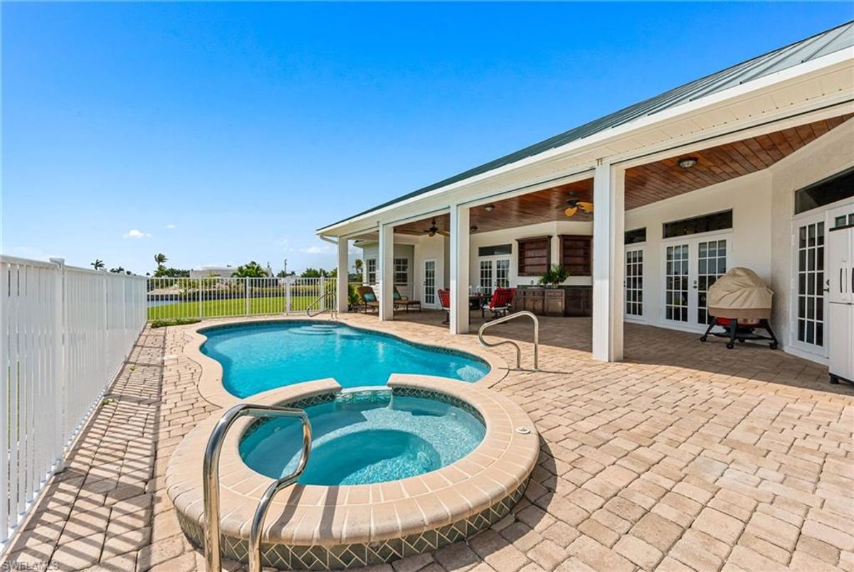Exceptional Gulf Access Waterfront Home – Elegant, Spacious & Built for the Florida Lifestyle. NO FLOODING with any of the Hurricanes. This beautifully crafted custom waterfront home sits on a rare oversized point lot with long intersecting canal views and direct Gulf access—perfect for boating enthusiasts seeking both luxury and convenience. With room to spare, this property also offers dedicated space alongside the dock for an additional large boat or vessel, making it a true boater’s dream.From the moment you arrive, the brick paver driveway and impressive double-door entry set the tone. Inside, you'll be welcomed by an open, light-filled layout with soaring coffered ceilings, elegant crown molding, and oversized rooms throughout. With over 4,100 sq ft under air, every space in this home feels grand, yet comfortable. The split floorplan offers excellent privacy, with two spacious primary suites, each with luxurious en-suite bathrooms and plenty of room to unwind.The gourmet kitchen is both stylish and functional, featuring light wood cabinetry, skylights, high-end Monogram appliances, and a large central island that flows into the expansive living and family rooms. Whether you’re hosting a holiday dinner or enjoying a quiet breakfast in the nook, the layout is designed for both entertaining and everyday ease.Along the backside of the home, you'll find multiple French doors leading out to the patio, showcasing gorgeous views of the pool, tropical landscaping, and the serene canal beyond. Step outside to your private resort-style lanai, complete with a tongue-and-groove wood ceiling, heated pool and spa, and ample space for relaxing or entertaining.The composite dock boasts a new boat lift with a custom canopy that matches the home’s 2024 metal roof, plus ambient lighting on the pilings and room for a larger vessel alongside. The property also features a 200-foot concrete seawall, offering both peace of mind and extensive water frontage.This home is built for peace of mind with impact-resistant windows and doors, electric roll-down shutters, dual electric panels wired for a generator, and a new pool pump. Additional features include custom chandeliers and ceiling fans, built-in-style cabinetry, and even an in-ground pet fence.If you're searching for spacious luxury with exceptional waterfront access, this home truly has it all. It’s more than a residence—it’s a statement in Florida living.