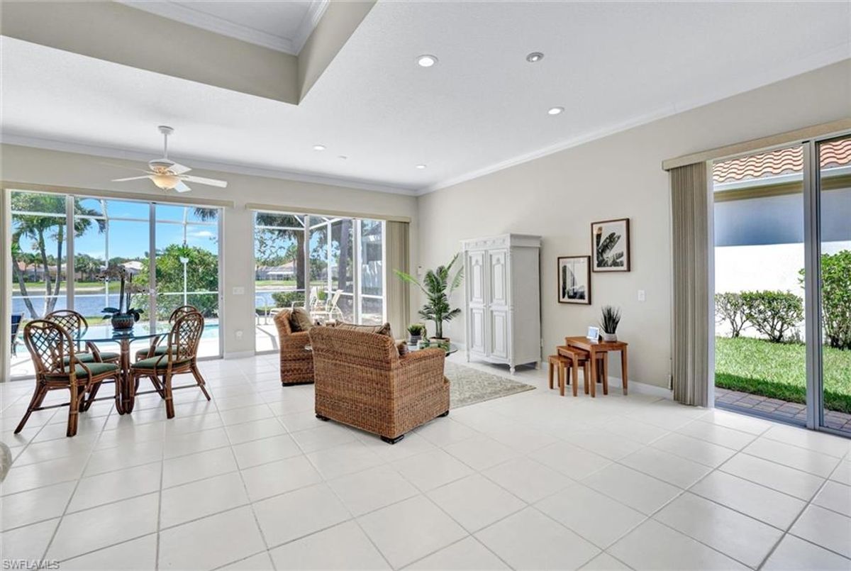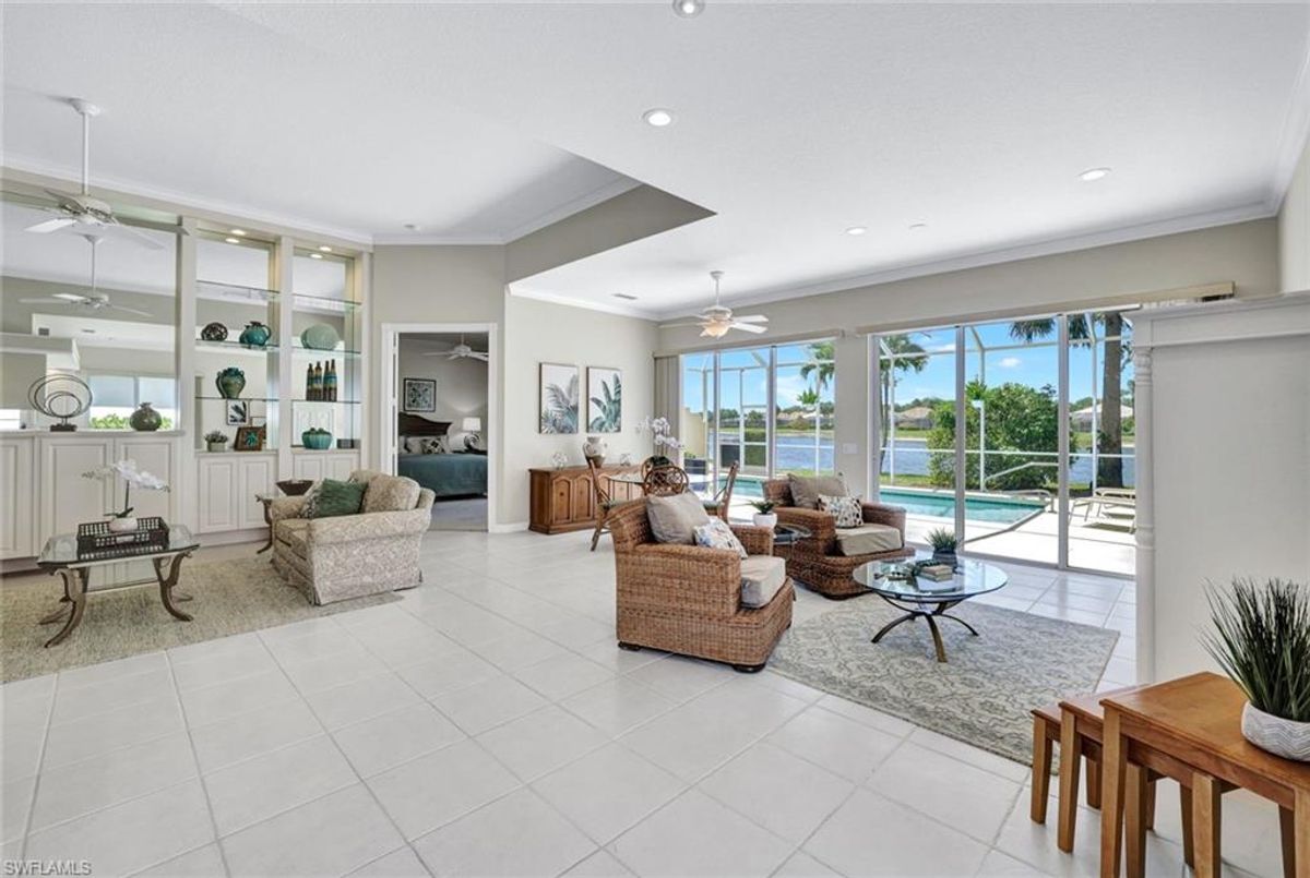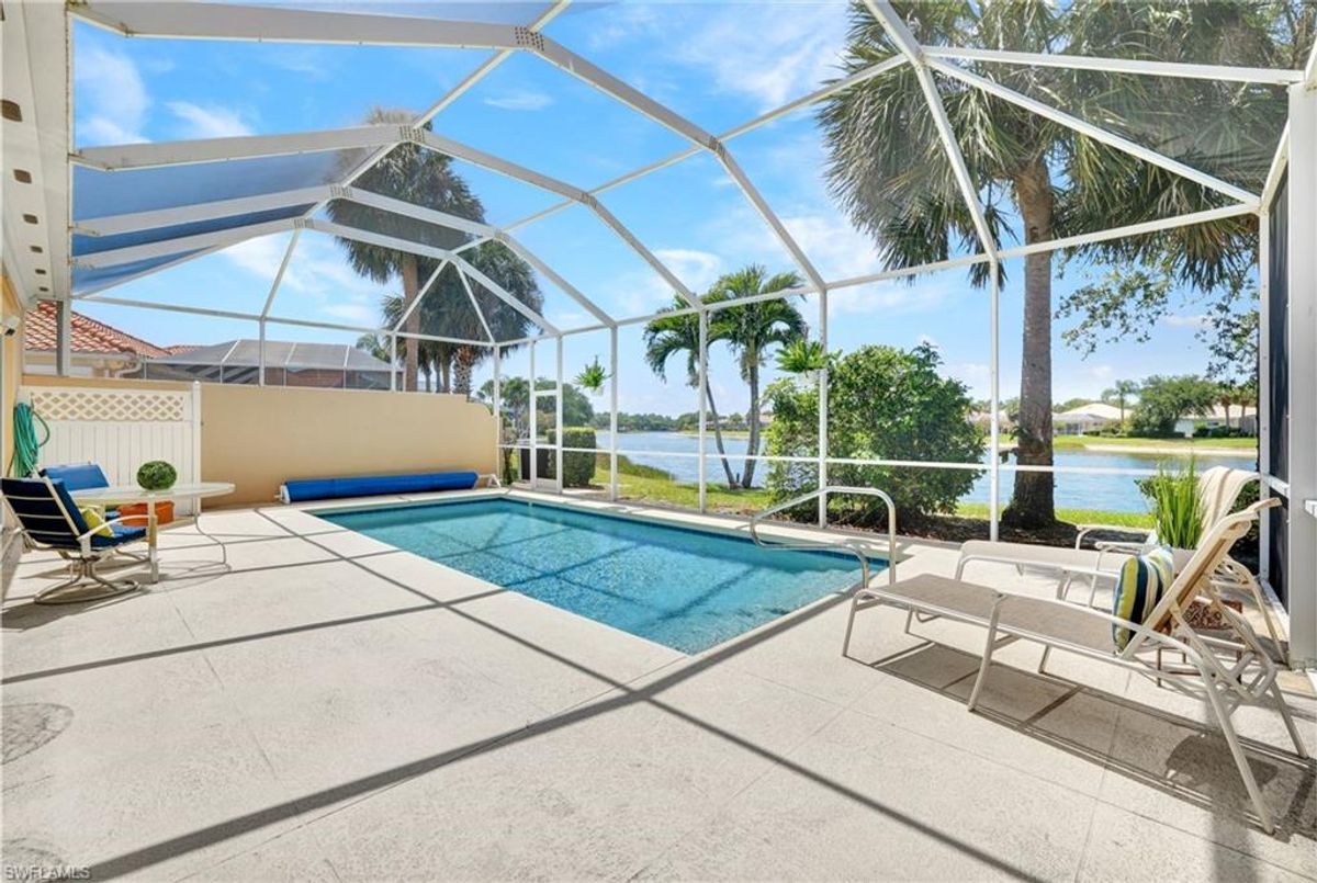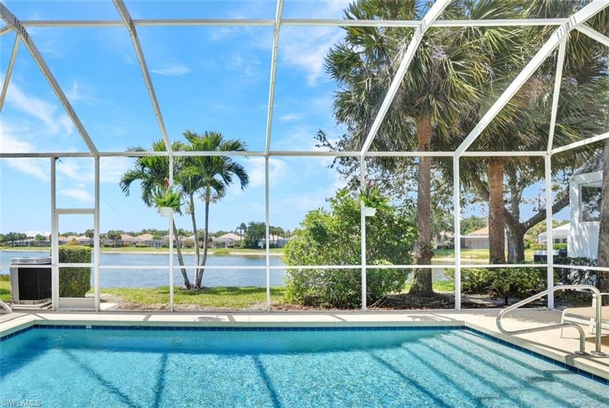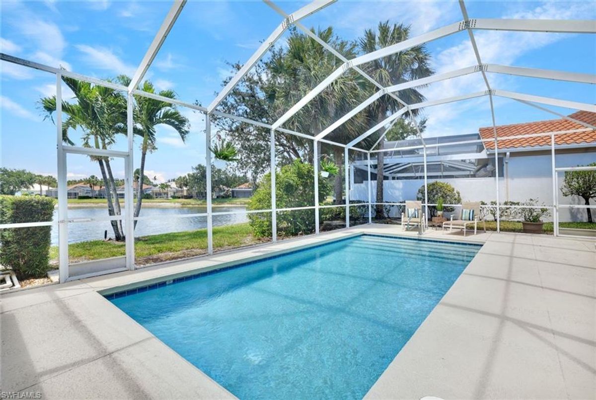 Discover this beautifully maintained extended Oakmont model in Island Walk—offering a NEW ROOF (2023), RE-SURFACED POOL AND POOL DECK, NEWER HEATER, and N.WESTERN LONG LAKE VIEWS. This 2,181 sq. ft. DiVosta-built poured concrete home sits on a 0.19-acre lot with larger side yards for privacy. With hurricane shutters all-around, a 2017 installed AC and a 2018 renewed screen enclosure, this home provides year-round enjoyment. Inside, enjoy crown molding, ceiling fans in every room, white tile in living areas and den, and a freshly painted living room. The kitchen features appliances (all 4 years or newer), and the 2023 washer & dryer add convenience. A den with built-in desk offers flexible space for work or hobbies. The side-entry garage includes added storage and a resurfaced floor. With its serene setting, thoughtful upgrades, and meticulously cared-for features, this one-owner home is the perfect Florida retreat. Island Walk is renowned for its amenities, including a community center with a bustling activities calendar, lap and resort-style pools, a restaurant with rave reviews, gas station, car wash, nail and hair salon, and post office. Sports enthusiasts will appreciate the state-of the art gym, clay tennis courts, pickleball, basketball, and bocce ball courts. Experience the best of Naples living in this exceptional home in Island Walk.