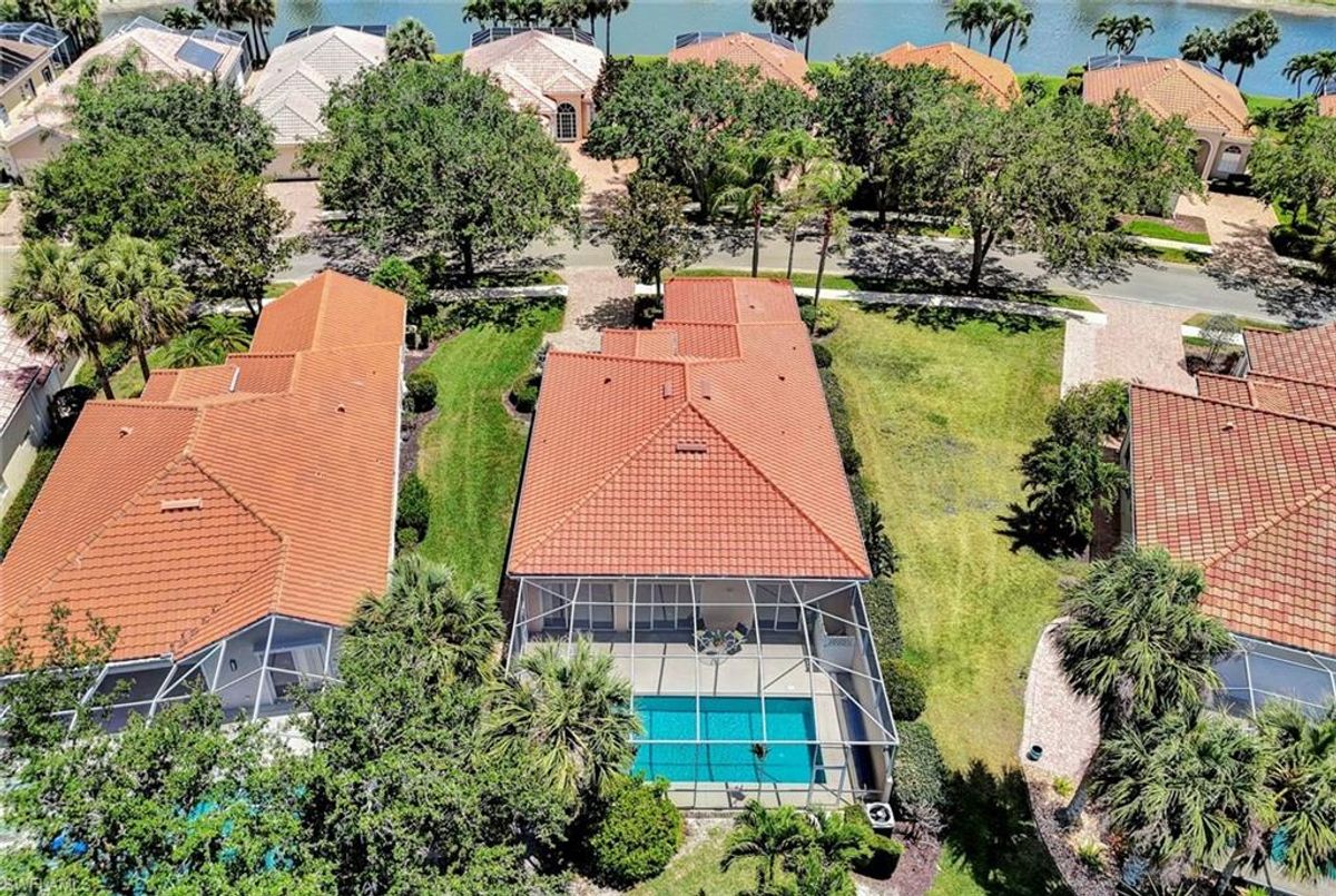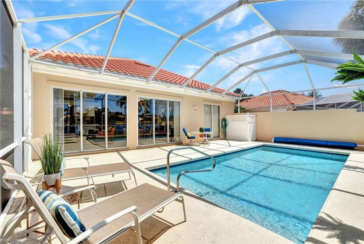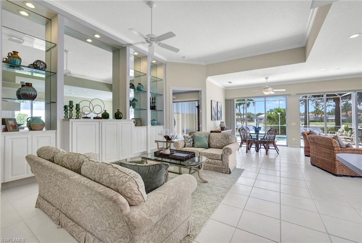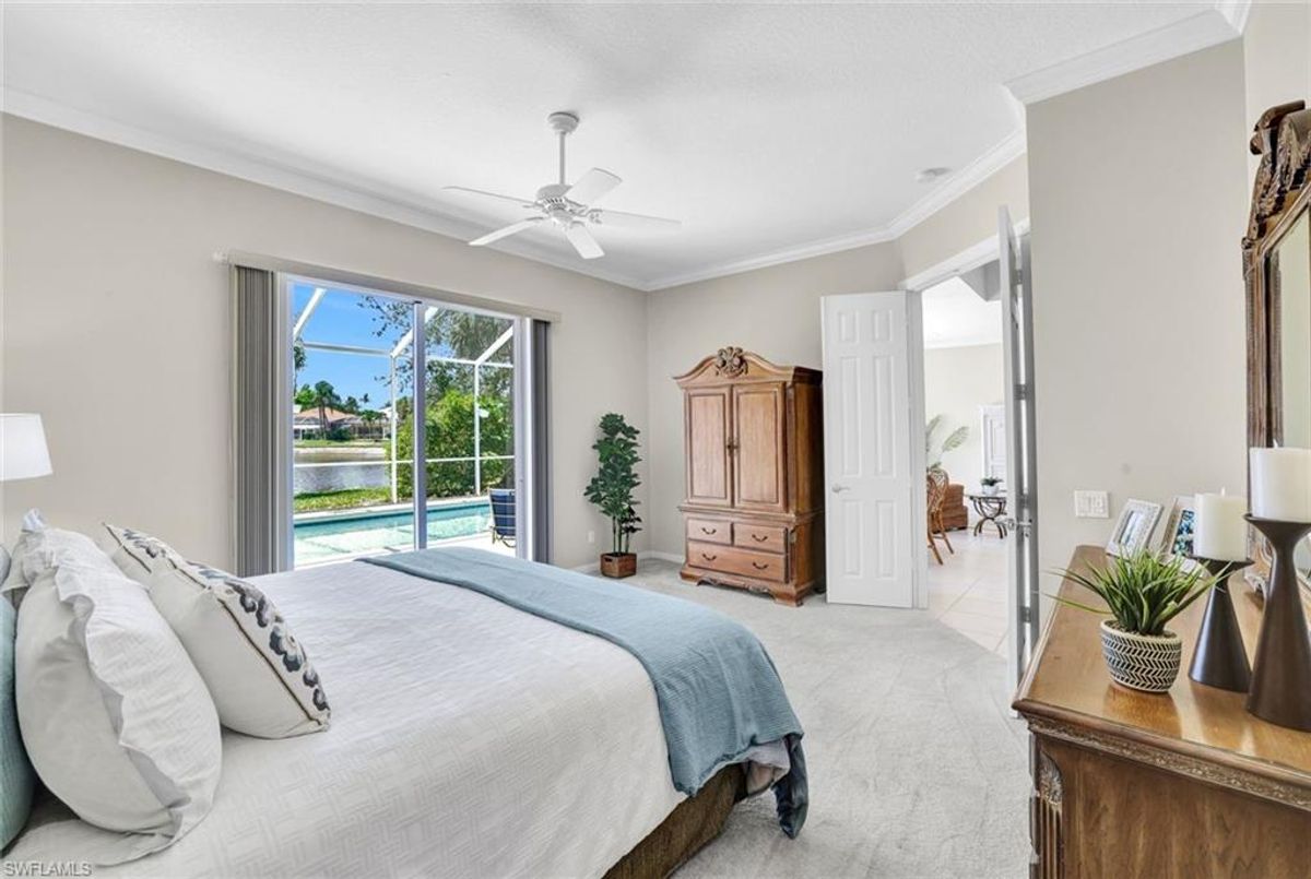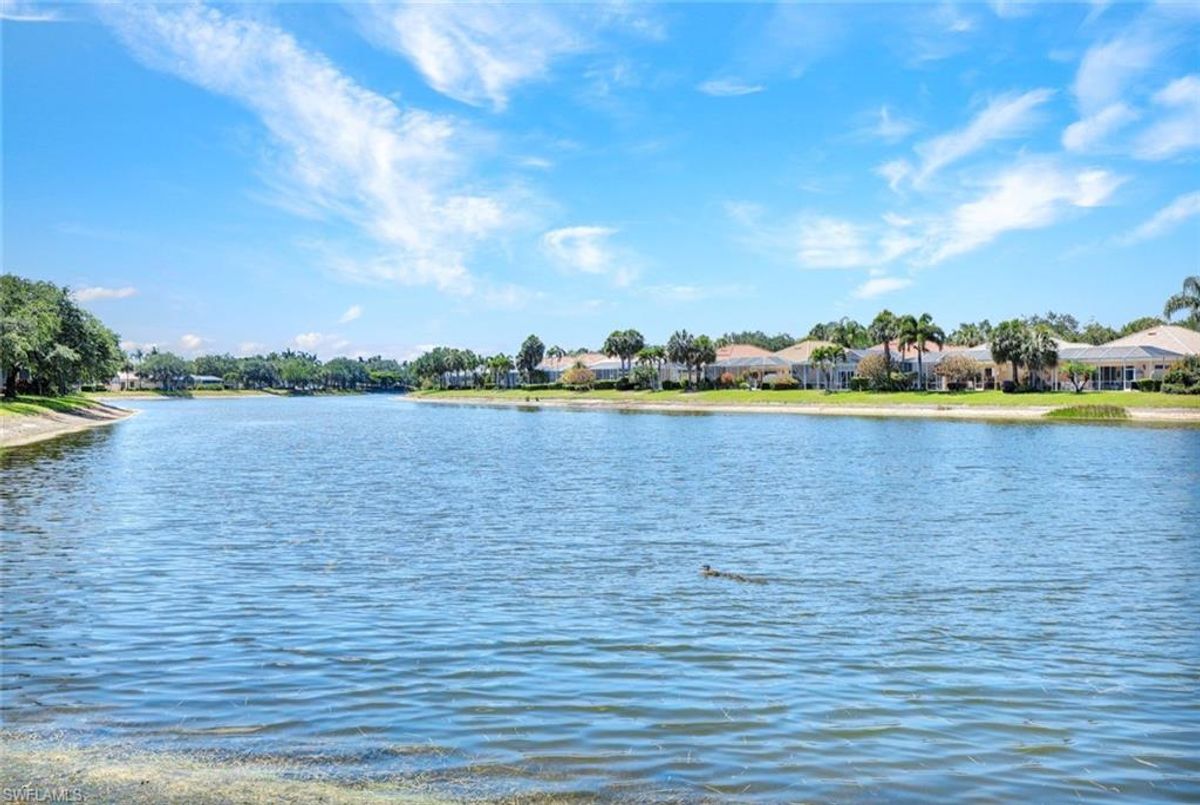 Discover this beautifully maintained extended Oakmont model in Island Walk—offering a NEW ROOF (2023), RE-SURFACED POOL AND POOL DECK, NEWER HEATER, and N.WESTERN LONG LAKE VIEWS. This 2,181 sq. ft. DiVosta-built poured concrete home sits on a 0.19-acre lot with larger side yards for privacy. With hurricane shutters all-around, a 2017 installed AC and a 2018 renewed screen enclosure, this home provides year-round enjoyment. Inside, enjoy crown molding, ceiling fans in every room, white tile in living areas and den, and a freshly painted living room. The kitchen features appliances (all 4 years or newer), and the 2023 washer & dryer add convenience. A den with built-in desk offers flexible space for work or hobbies. The side-entry garage includes added storage and a resurfaced floor. With its serene setting, thoughtful upgrades, and meticulously cared-for features, this one-owner home is the perfect Florida retreat. Island Walk is renowned for its amenities, including a community center with a bustling activities calendar, lap and resort-style pools, a restaurant with rave reviews, gas station, car wash, nail and hair salon, and post office. Sports enthusiasts will appreciate the state-of the art gym, clay tennis courts, pickleball, basketball, and bocce ball courts. Experience the best of Naples living in this exceptional home in Island Walk.