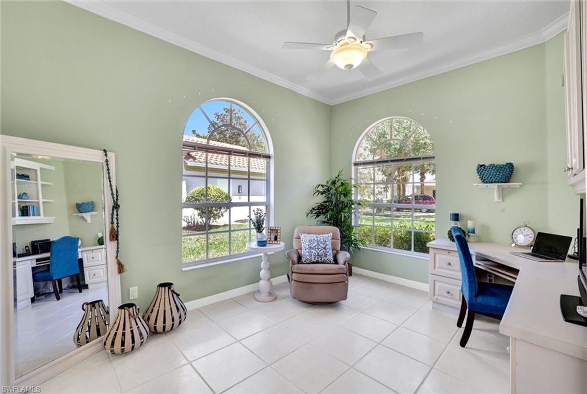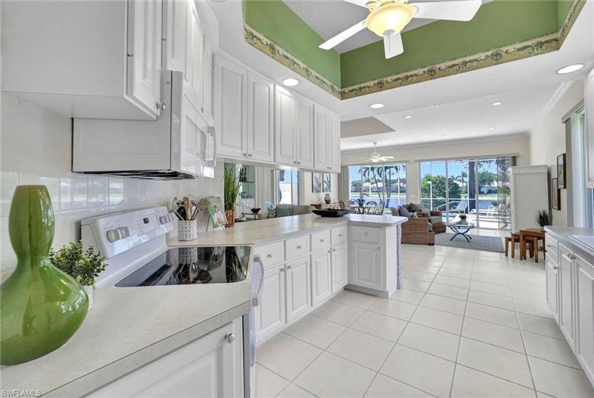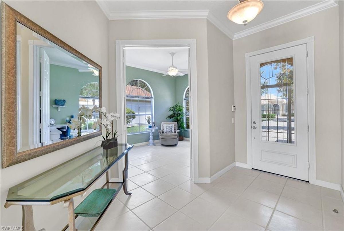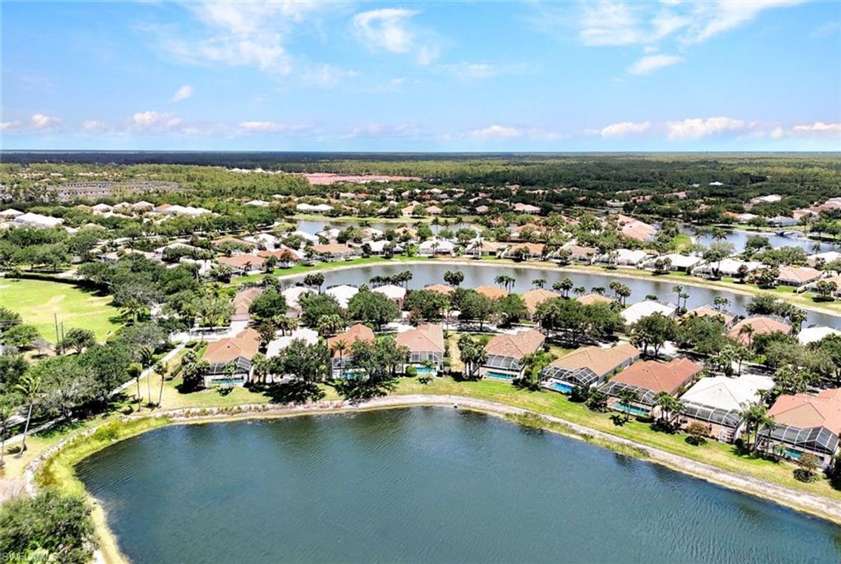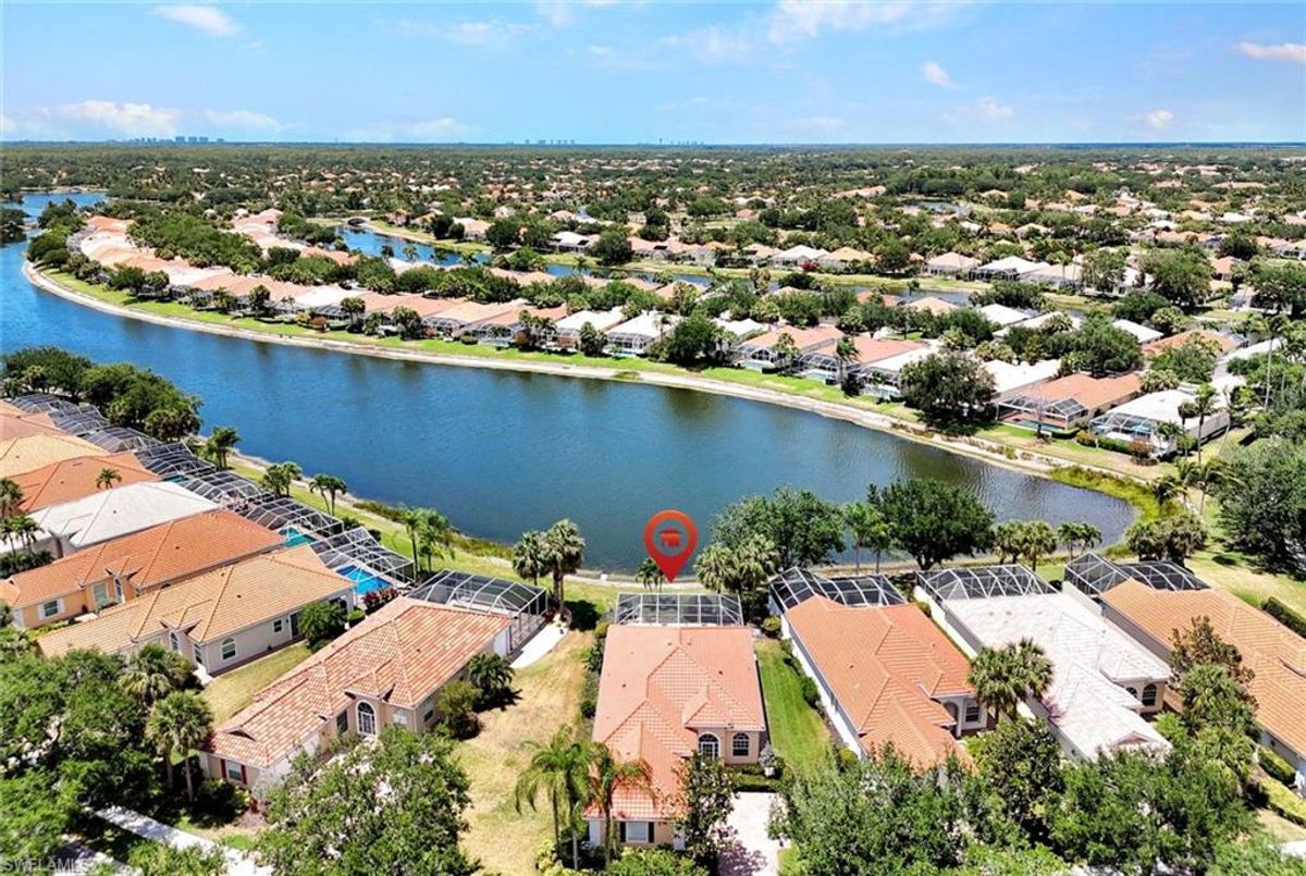 Discover this beautifully maintained extended Oakmont model in Island Walk—offering a NEW ROOF (2023), RE-SURFACED POOL AND POOL DECK, NEWER HEATER, and N.WESTERN LONG LAKE VIEWS. This 2,181 sq. ft. DiVosta-built poured concrete home sits on a 0.19-acre lot with larger side yards for privacy. With hurricane shutters all-around, a 2017 installed AC and a 2018 renewed screen enclosure, this home provides year-round enjoyment. Inside, enjoy crown molding, ceiling fans in every room, white tile in living areas and den, and a freshly painted living room. The kitchen features appliances (all 4 years or newer), and the 2023 washer & dryer add convenience. A den with built-in desk offers flexible space for work or hobbies. The side-entry garage includes added storage and a resurfaced floor. With its serene setting, thoughtful upgrades, and meticulously cared-for features, this one-owner home is the perfect Florida retreat. Island Walk is renowned for its amenities, including a community center with a bustling activities calendar, lap and resort-style pools, a restaurant with rave reviews, gas station, car wash, nail and hair salon, and post office. Sports enthusiasts will appreciate the state-of the art gym, clay tennis courts, pickleball, basketball, and bocce ball courts. Experience the best of Naples living in this exceptional home in Island Walk.