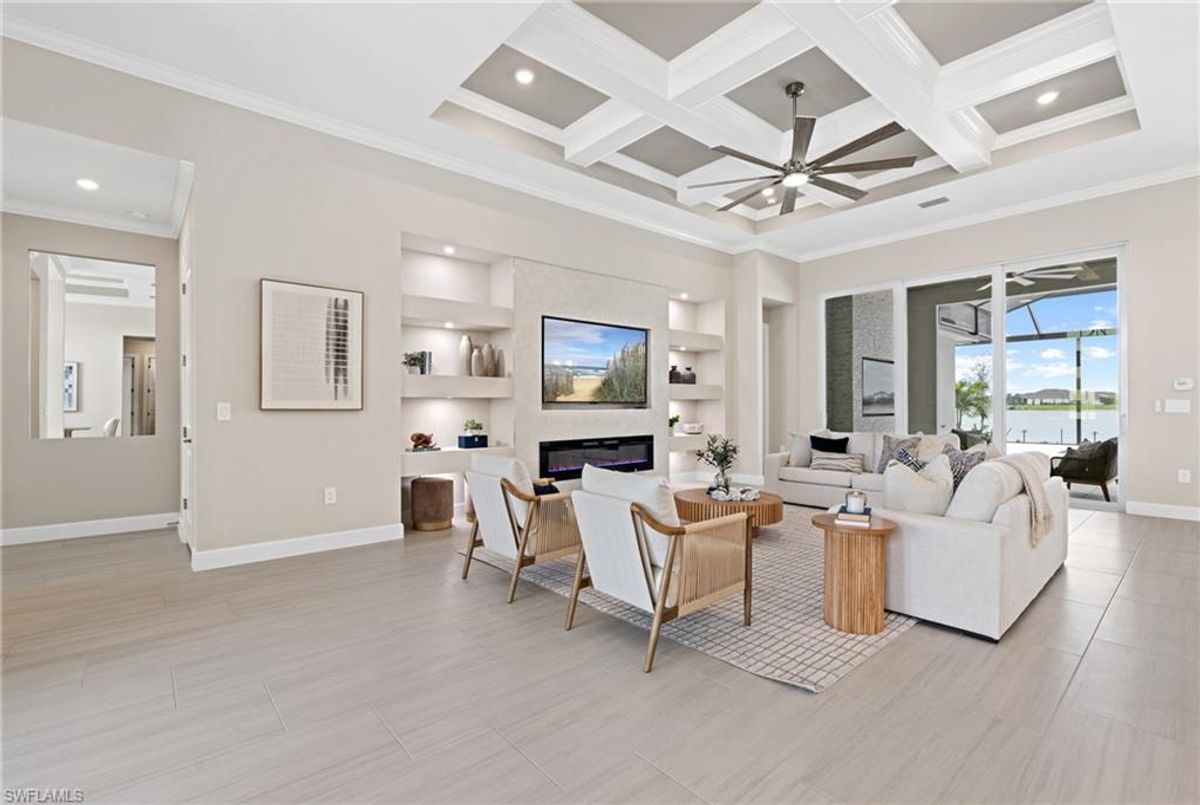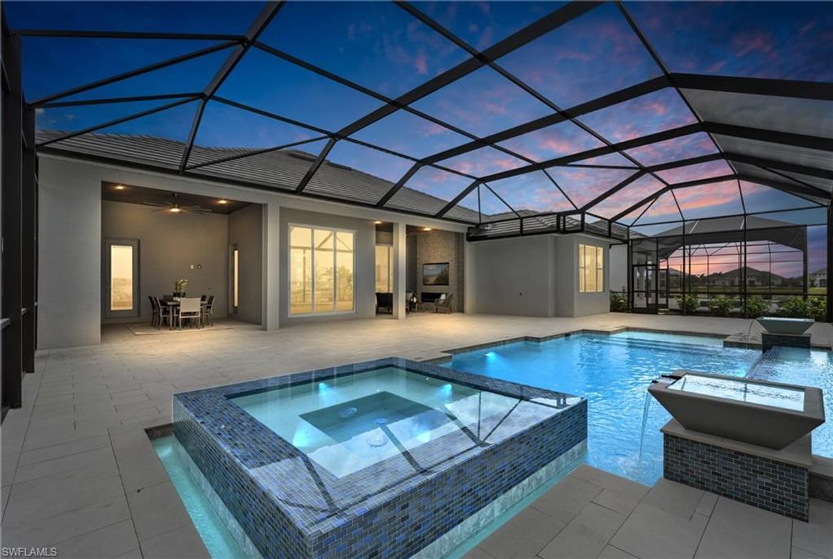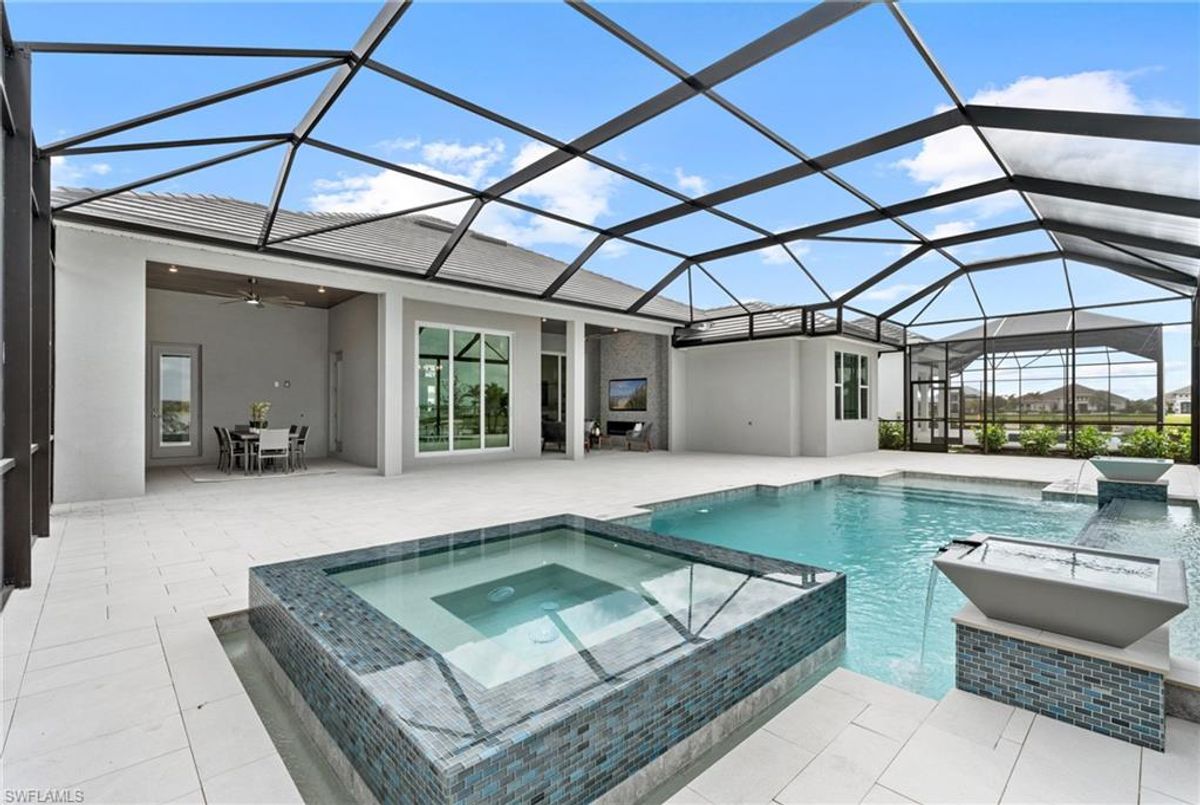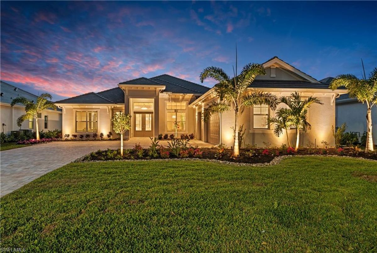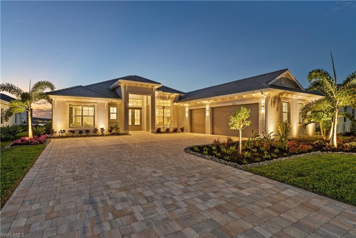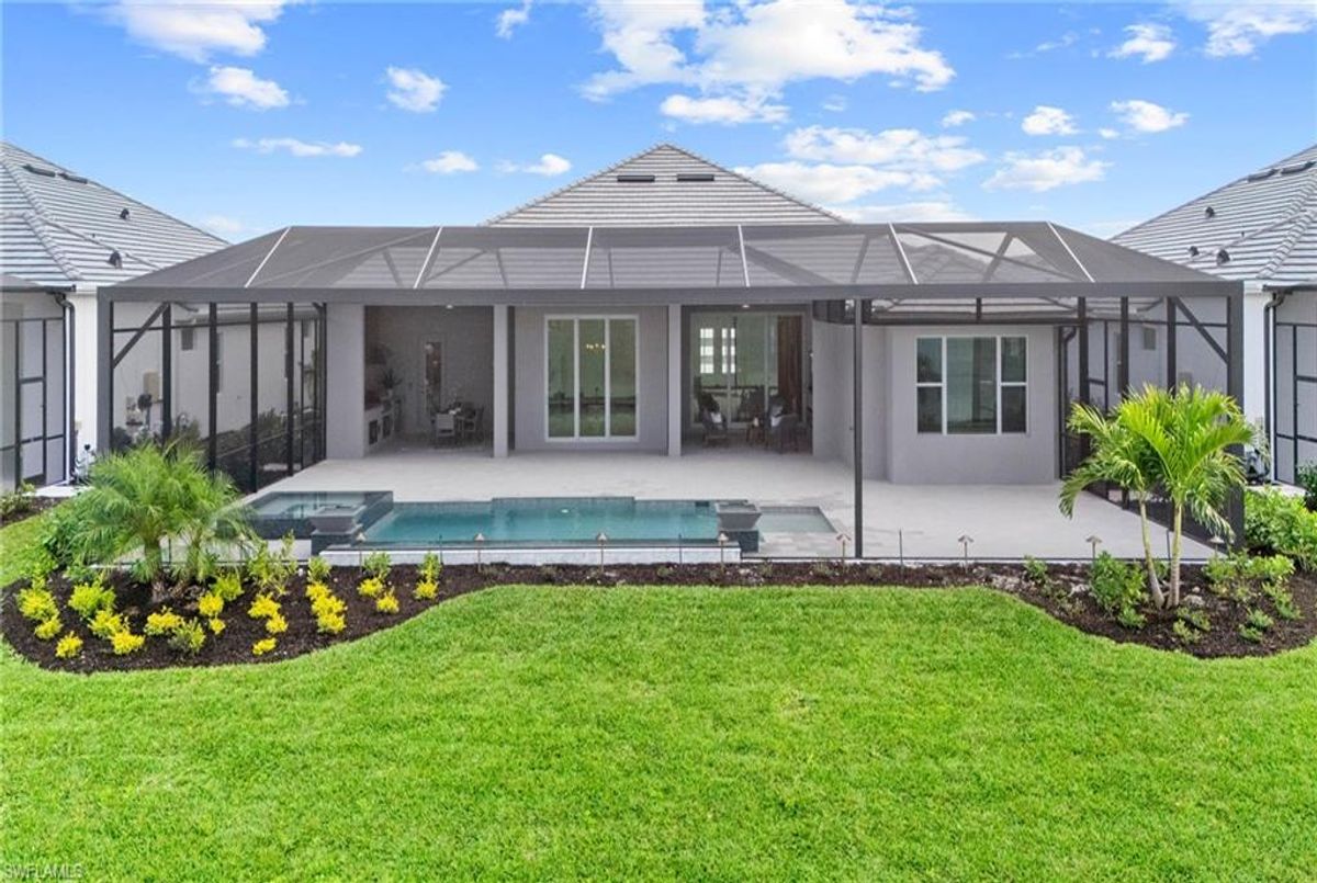 Now fully furnished – move-in ready with designer-selected pieces throughout!Welcome to a distinguished home at 17346 Blue Sapphire Drive, located in the exclusive community of Wildblue, Fort Myers, FL. This immaculate, newly built residence embodies refined elegance and offers an unparalleled living experience. The sophisticated WCI Luxury Baneberry floor plan features four spacious bedrooms, three and a half exquisite baths, and an ample three-car garage, encompassing 3,178 square feet of pristine living area. Set on a sprawling 14,211-square-foot estate lot, this property provides a sense of grandeur and privacy.Upon entry, you are welcomed by custom trim woodworking adorning the tray ceilings, adding an artistic flair to the ambiance. The living room is a testament to luxury, with a custom-designed entertainment center complete with a fireplace, extending seamlessly to the lanai for harmonious indoor-outdoor living. Over $250,000 in custom upgrades have been meticulously integrated throughout the home, enhancing its sophistication and comfort. This residence is adorned with a tailored lighting and mirror package, elevating the home's inherent elegance.Step outside to find custom landscaping and ambient lighting that enhance the pool deck, perfect for savoring the tranquil southwest views. Additionally, the garage is air-conditioned with a mini-split system, providing a comfortable environment for your vehicles and storage needs.This home offers not only a picturesque long water view but also access to The Cove at Wildblue's exceptional boating and lifestyle amenities. Enjoy the resort-style pool equipped with an outdoor bar and grill, as well as fine dining indoors. For those seeking an active lifestyle, Wildblue provides a fitness center complete with a day spa, along with pickleball, tennis, bocce, and horseshoe courts. Don't forget the exercise pool and members' locker rooms for a comprehensive wellness experience.Never lived in, this home awaits discerning buyers ready to indulge in its beauty and sophistication. The home is professionally staged, further enhancing its appeal and readiness for its fortunate new owners. Experience the unique charm and serenity of this magnificent estate, where luxury is redefined.