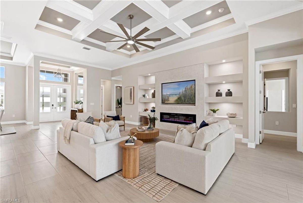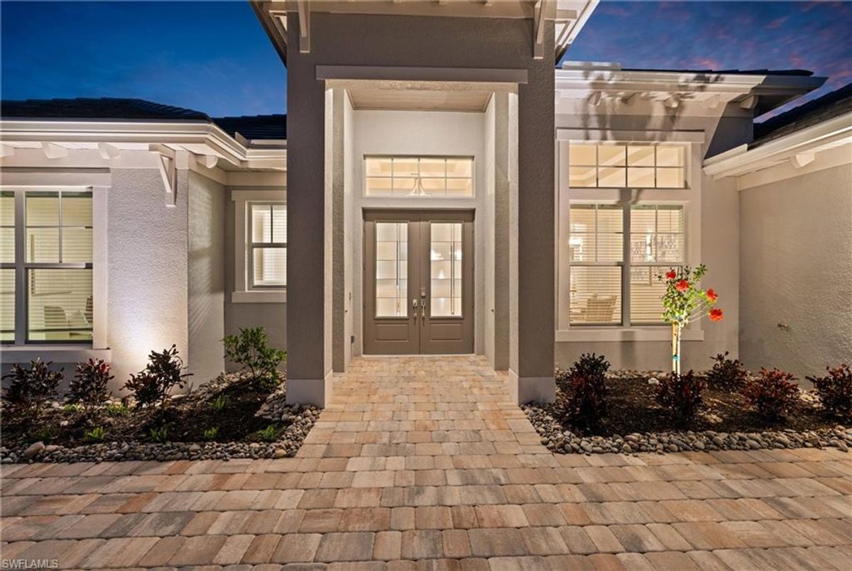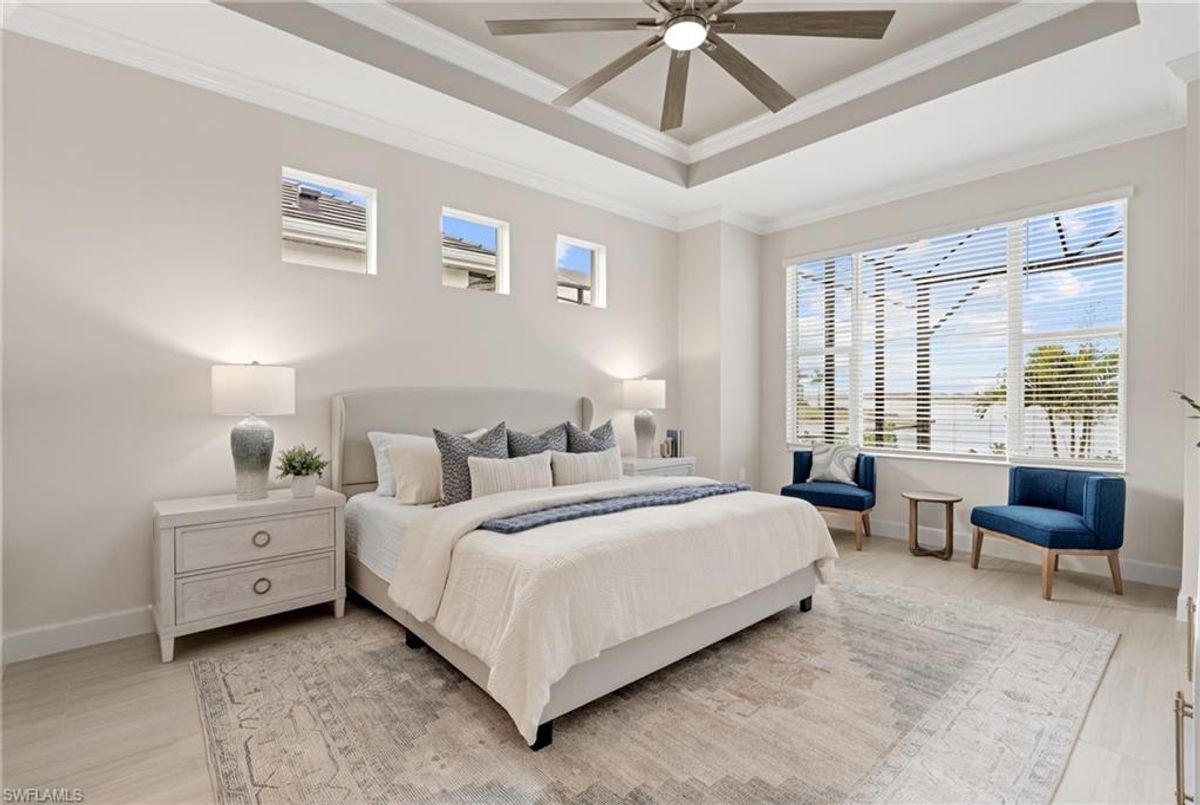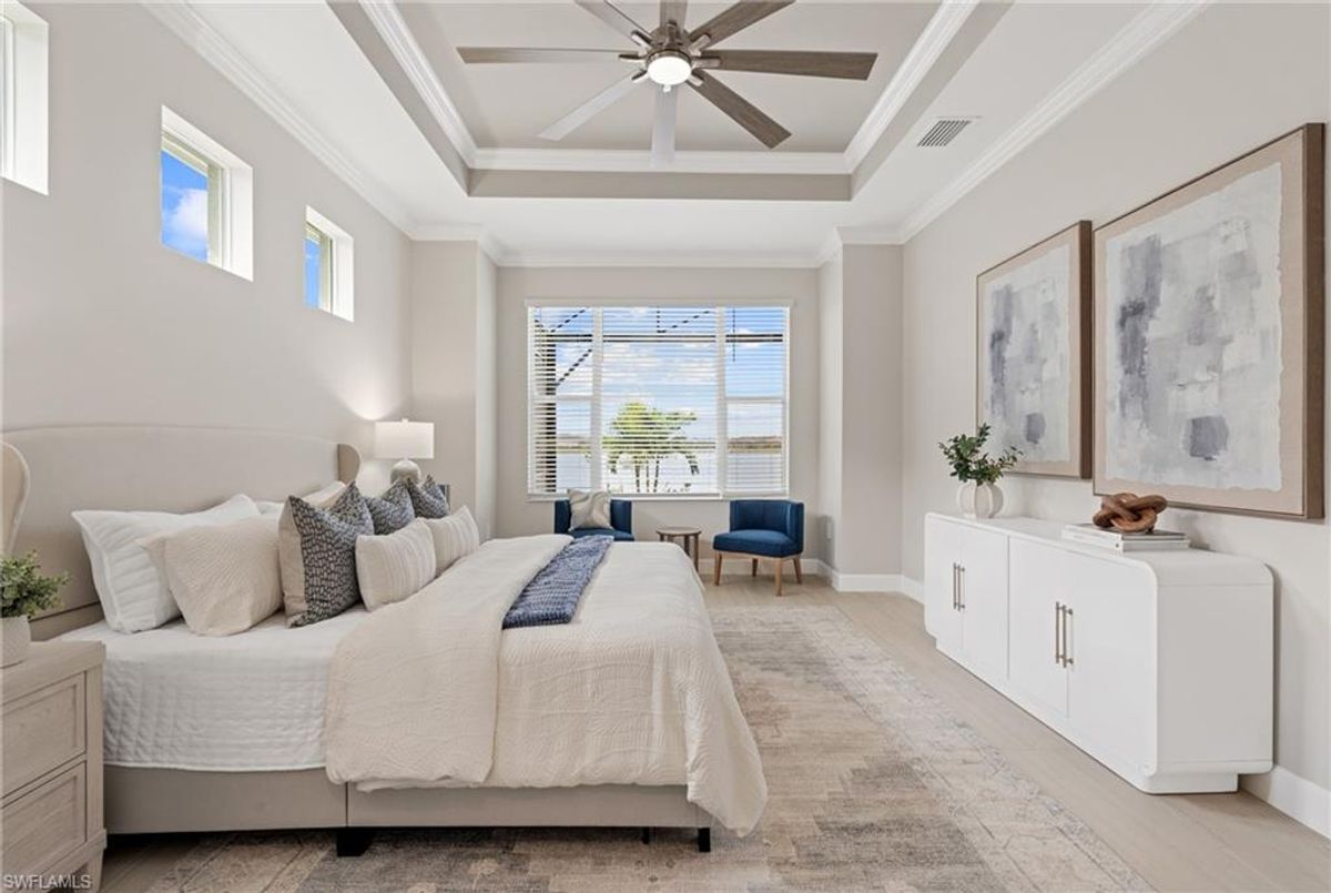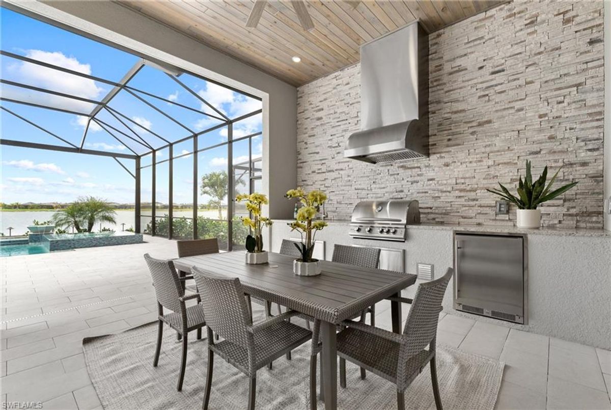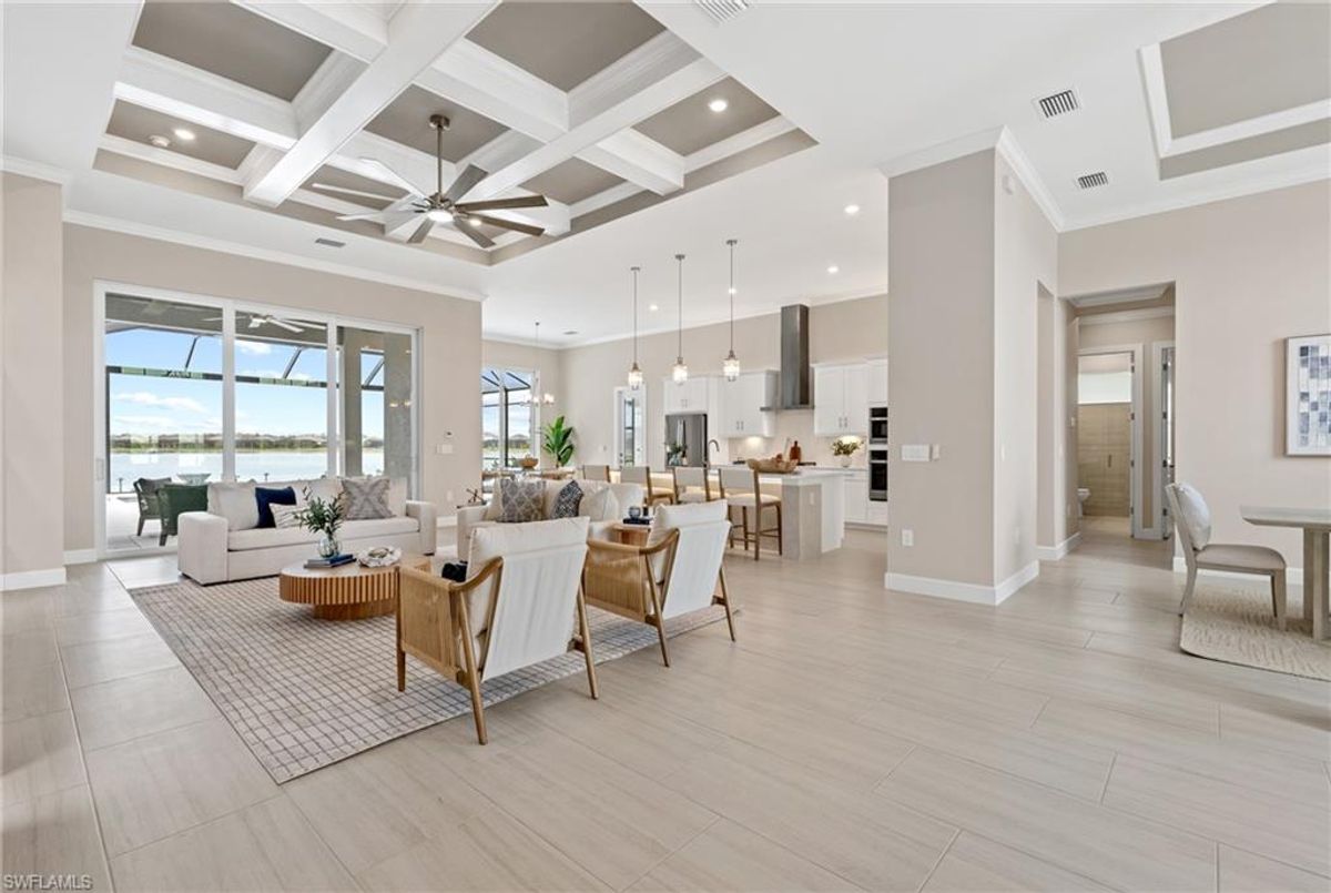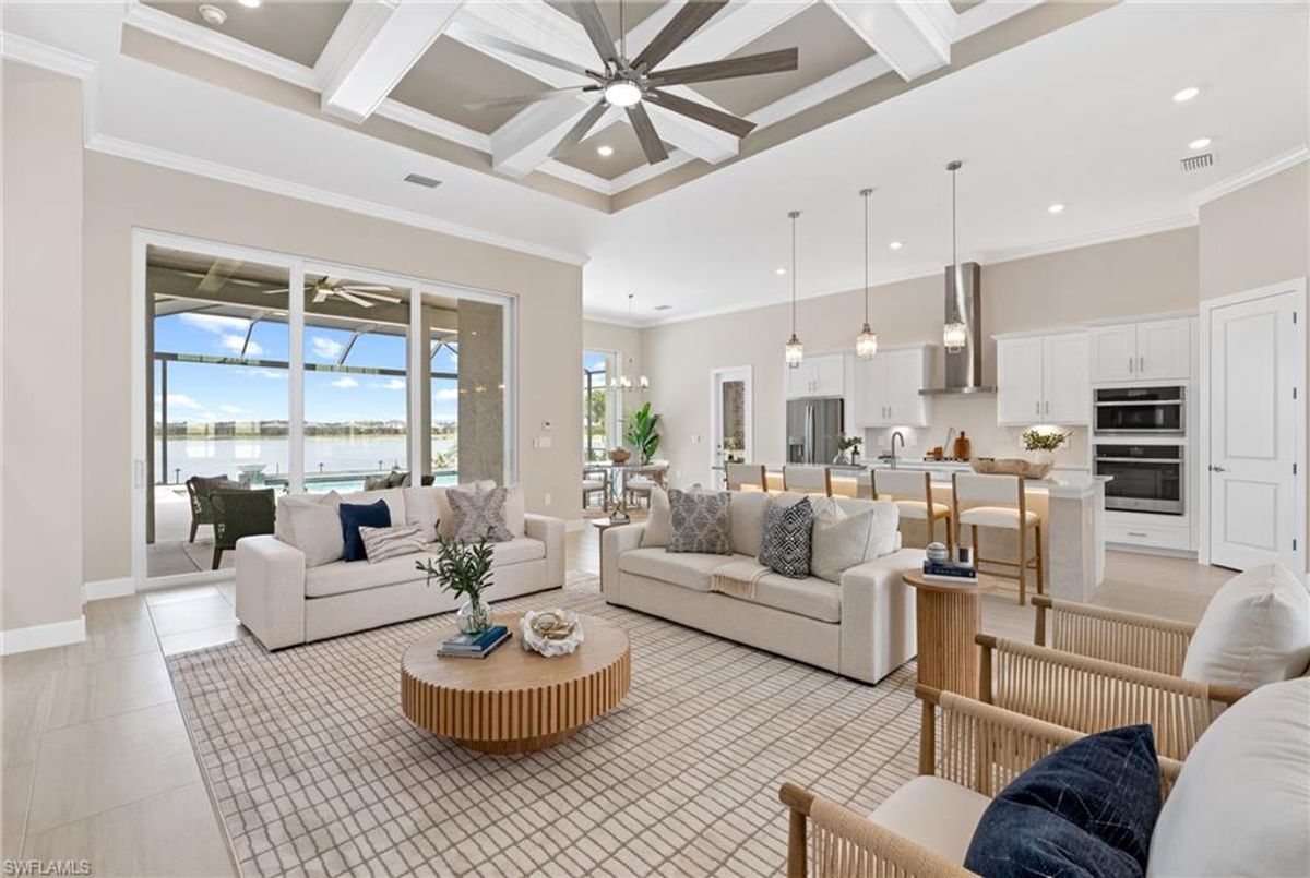 Now fully furnished – move-in ready with designer-selected pieces throughout!Welcome to a distinguished home at 17346 Blue Sapphire Drive, located in the exclusive community of Wildblue, Fort Myers, FL. This immaculate, newly built residence embodies refined elegance and offers an unparalleled living experience. The sophisticated WCI Luxury Baneberry floor plan features four spacious bedrooms, three and a half exquisite baths, and an ample three-car garage, encompassing 3,178 square feet of pristine living area. Set on a sprawling 14,211-square-foot estate lot, this property provides a sense of grandeur and privacy.Upon entry, you are welcomed by custom trim woodworking adorning the tray ceilings, adding an artistic flair to the ambiance. The living room is a testament to luxury, with a custom-designed entertainment center complete with a fireplace, extending seamlessly to the lanai for harmonious indoor-outdoor living. Over $250,000 in custom upgrades have been meticulously integrated throughout the home, enhancing its sophistication and comfort. This residence is adorned with a tailored lighting and mirror package, elevating the home's inherent elegance.Step outside to find custom landscaping and ambient lighting that enhance the pool deck, perfect for savoring the tranquil southwest views. Additionally, the garage is air-conditioned with a mini-split system, providing a comfortable environment for your vehicles and storage needs.This home offers not only a picturesque long water view but also access to The Cove at Wildblue's exceptional boating and lifestyle amenities. Enjoy the resort-style pool equipped with an outdoor bar and grill, as well as fine dining indoors. For those seeking an active lifestyle, Wildblue provides a fitness center complete with a day spa, along with pickleball, tennis, bocce, and horseshoe courts. Don't forget the exercise pool and members' locker rooms for a comprehensive wellness experience.Never lived in, this home awaits discerning buyers ready to indulge in its beauty and sophistication. The home is professionally staged, further enhancing its appeal and readiness for its fortunate new owners. Experience the unique charm and serenity of this magnificent estate, where luxury is redefined.