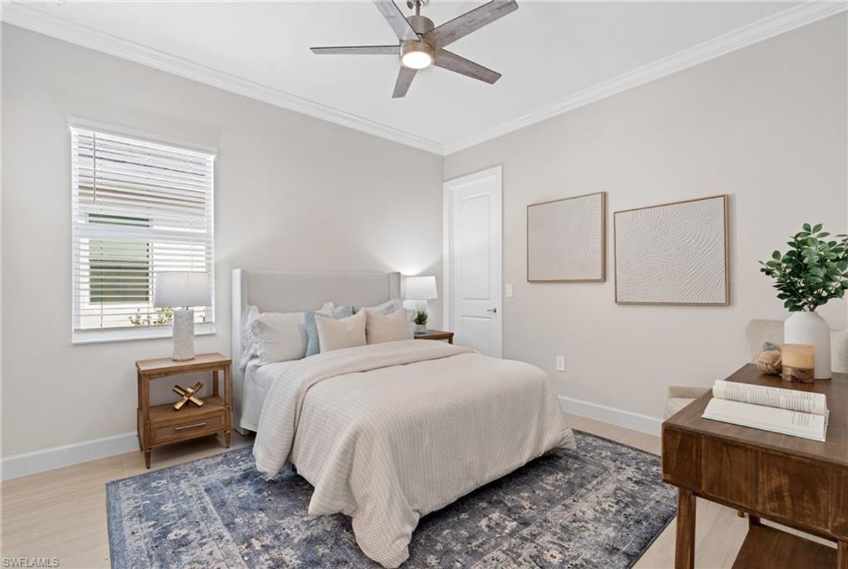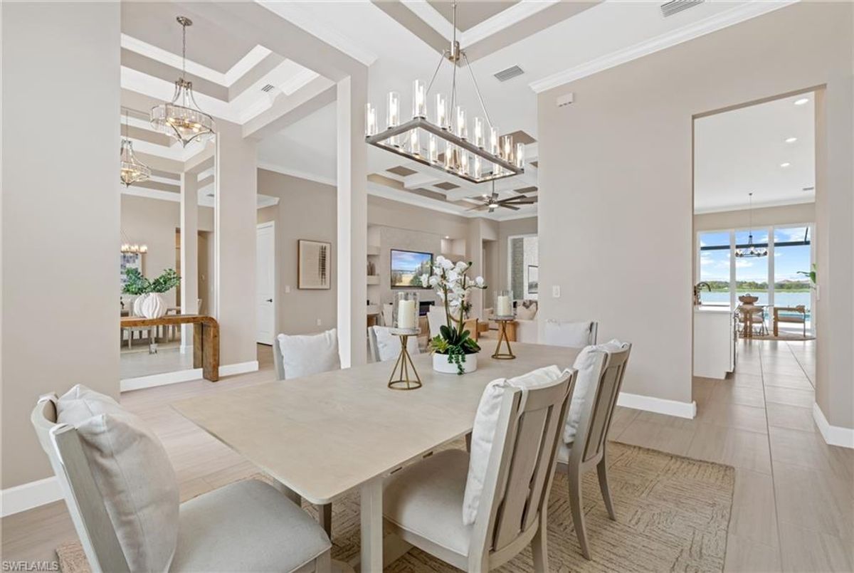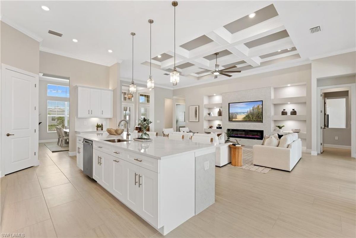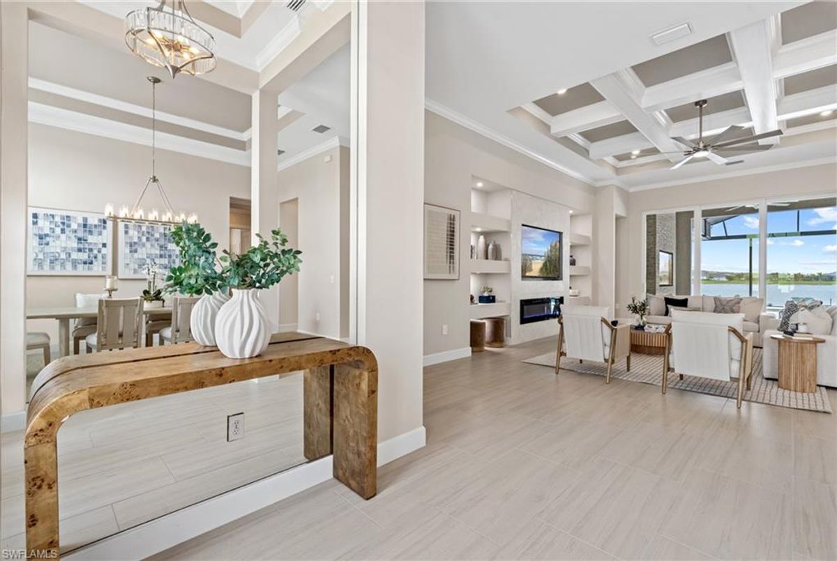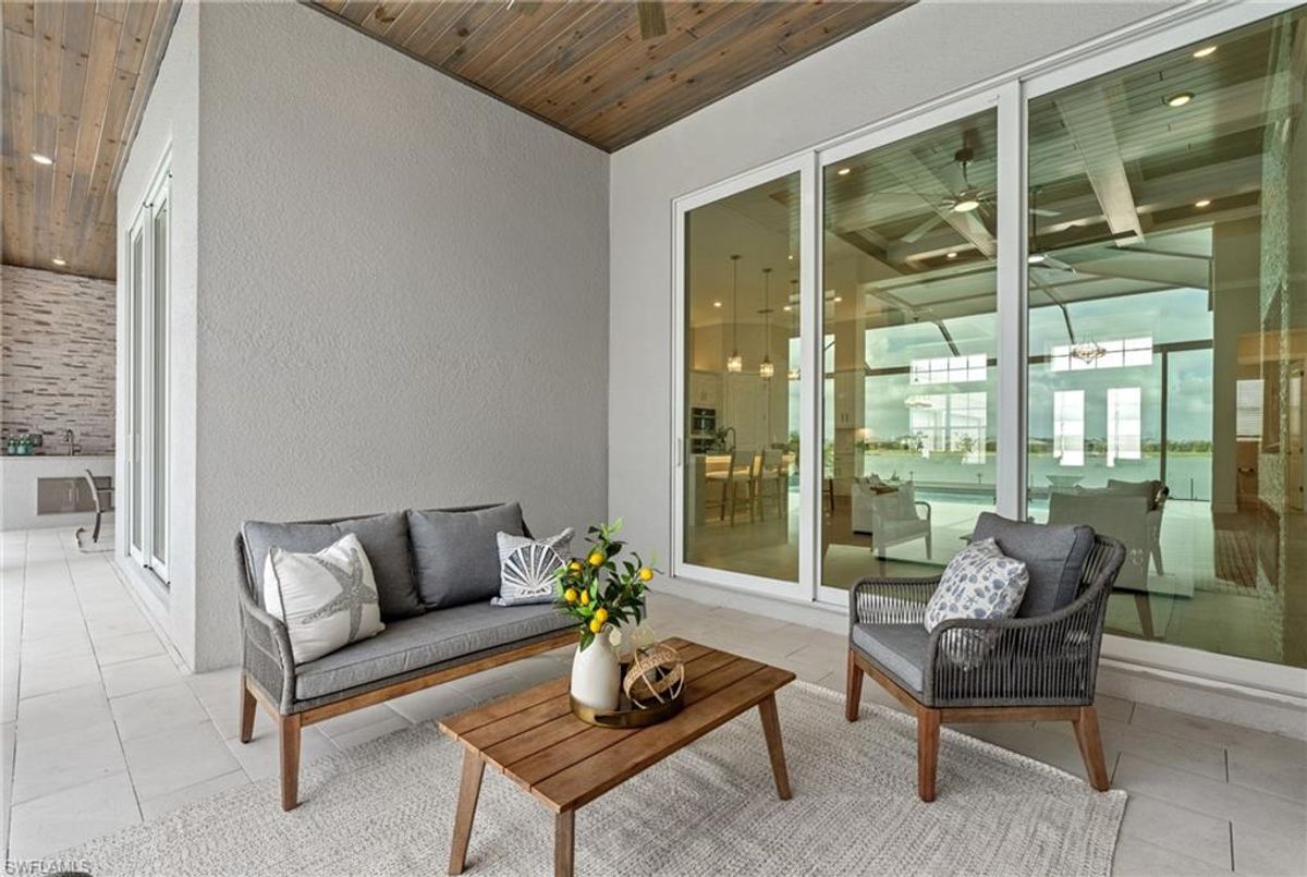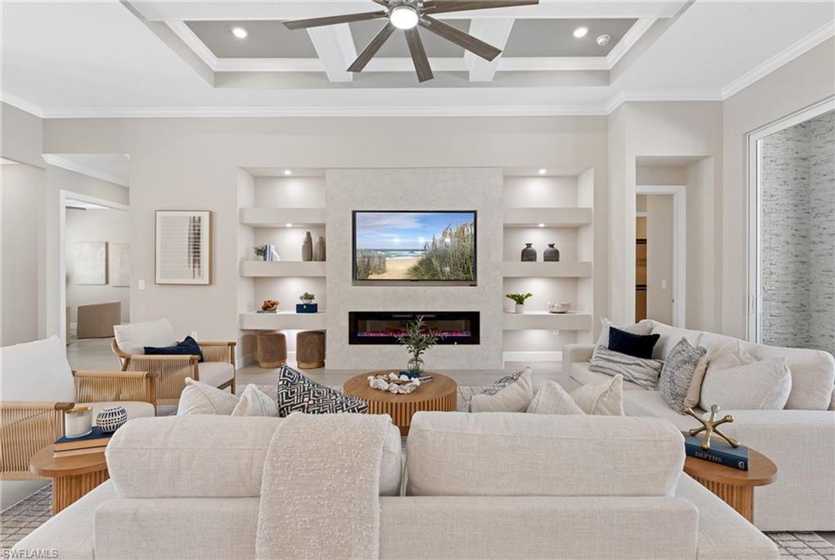 Now fully furnished – move-in ready with designer-selected pieces throughout!Welcome to a distinguished home at 17346 Blue Sapphire Drive, located in the exclusive community of Wildblue, Fort Myers, FL. This immaculate, newly built residence embodies refined elegance and offers an unparalleled living experience. The sophisticated WCI Luxury Baneberry floor plan features four spacious bedrooms, three and a half exquisite baths, and an ample three-car garage, encompassing 3,178 square feet of pristine living area. Set on a sprawling 14,211-square-foot estate lot, this property provides a sense of grandeur and privacy.Upon entry, you are welcomed by custom trim woodworking adorning the tray ceilings, adding an artistic flair to the ambiance. The living room is a testament to luxury, with a custom-designed entertainment center complete with a fireplace, extending seamlessly to the lanai for harmonious indoor-outdoor living. Over $250,000 in custom upgrades have been meticulously integrated throughout the home, enhancing its sophistication and comfort. This residence is adorned with a tailored lighting and mirror package, elevating the home's inherent elegance.Step outside to find custom landscaping and ambient lighting that enhance the pool deck, perfect for savoring the tranquil southwest views. Additionally, the garage is air-conditioned with a mini-split system, providing a comfortable environment for your vehicles and storage needs.This home offers not only a picturesque long water view but also access to The Cove at Wildblue's exceptional boating and lifestyle amenities. Enjoy the resort-style pool equipped with an outdoor bar and grill, as well as fine dining indoors. For those seeking an active lifestyle, Wildblue provides a fitness center complete with a day spa, along with pickleball, tennis, bocce, and horseshoe courts. Don't forget the exercise pool and members' locker rooms for a comprehensive wellness experience.Never lived in, this home awaits discerning buyers ready to indulge in its beauty and sophistication. The home is professionally staged, further enhancing its appeal and readiness for its fortunate new owners. Experience the unique charm and serenity of this magnificent estate, where luxury is redefined.