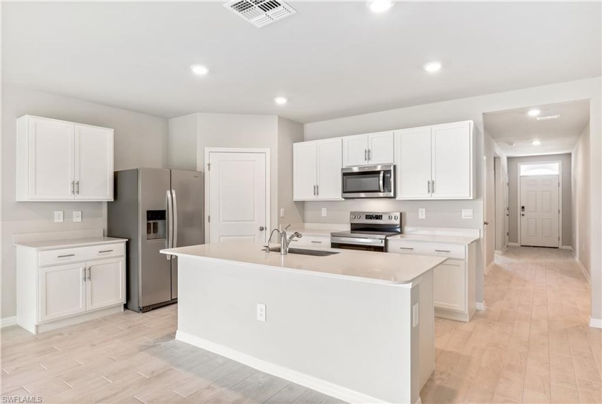 Under Construction. The appealing one-story home includes many contemporary features, and an open-concept design with 8’8" ceilings that enhance the wonderful feel of this home. The well-appointed kitchen includes a large island perfect for bar-style eating or entertaining, a walk-in pantry, and plenty of cabinets and counter space. The dining room and living room both overlook the covered lanai, which is a great area for relaxing and dining al fresco. The large primary bedroom located at the back of the home for privacy, can comfortably fit a king-size bed, and includes an En Suite bathroom with double vanity, big walk-in closet, and separate linen closet. This open concept Home comes with designer cabinets and hardware, 6”x24” Plank tile through, 18” tiled showers, Quartz counters throughout, all Stainless Steel kitchen appliances, Washer/Dryer, blinds on all windows, Storm Shutters, and the latest Smart Home technology with a smart thermostat, smart door lock, video doorbell, smart garage controller, hands free commands and more. We also provide your homesite fully sodded and landscaped. These homes move quick so don’t miss out!