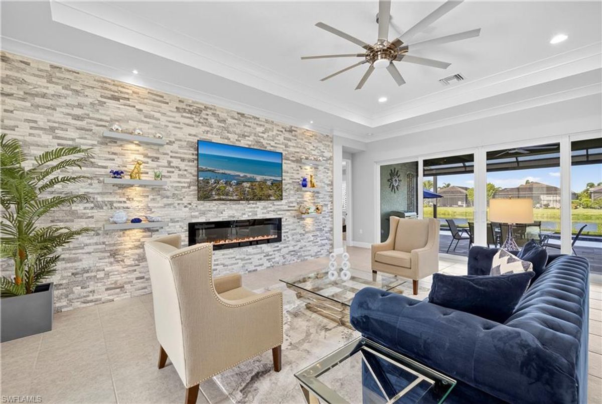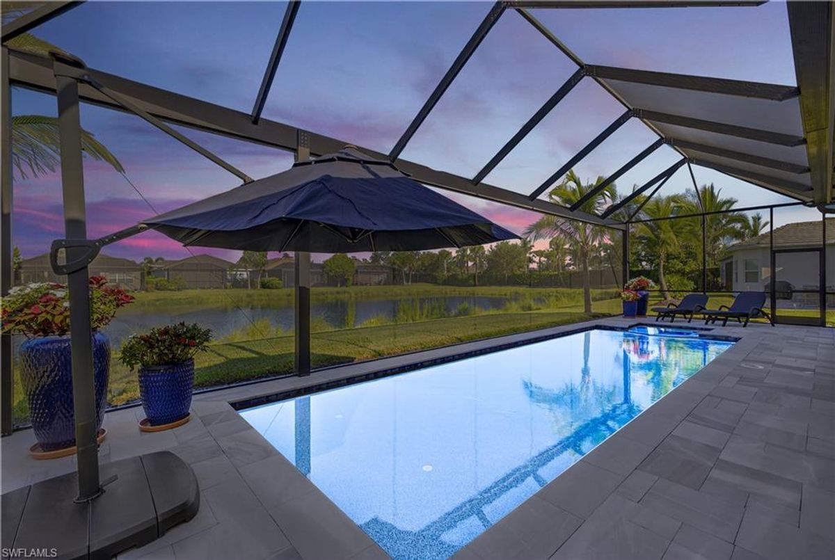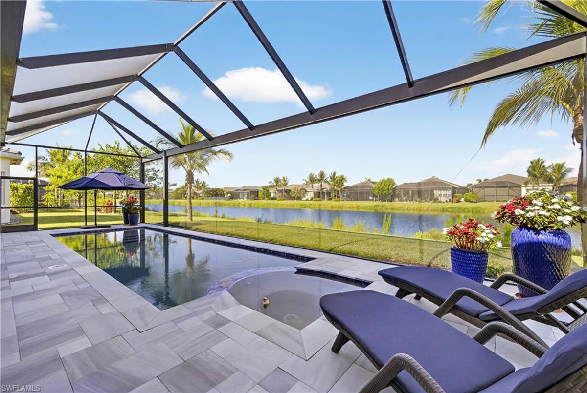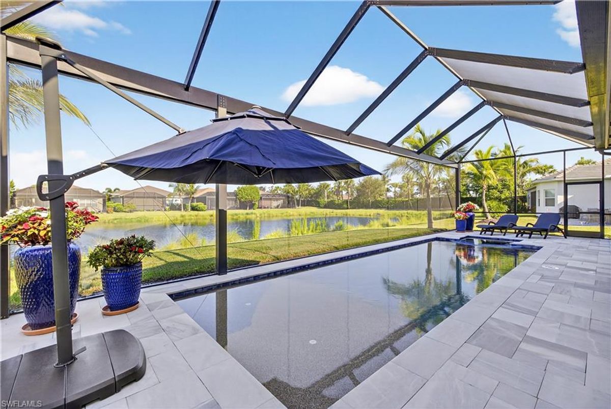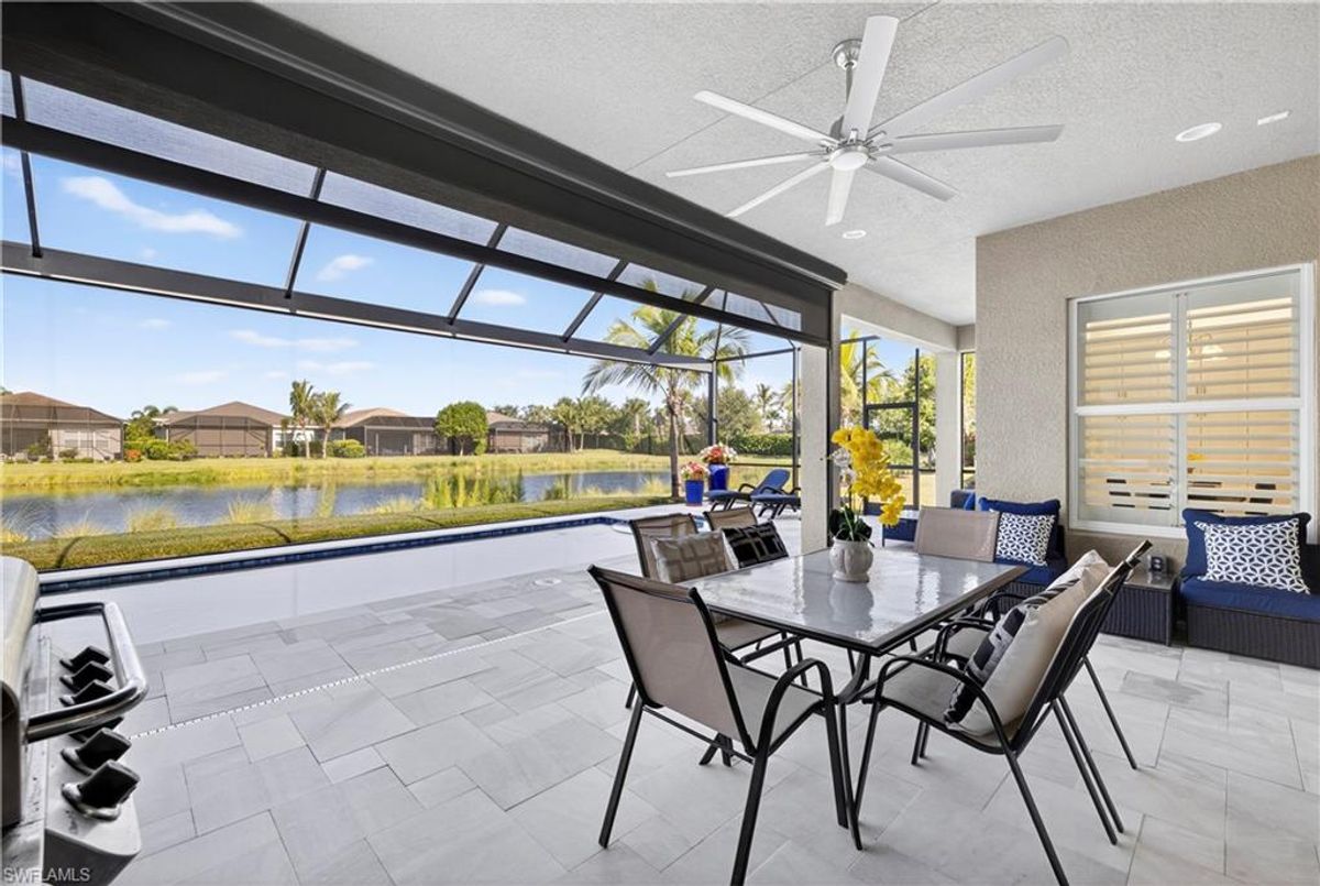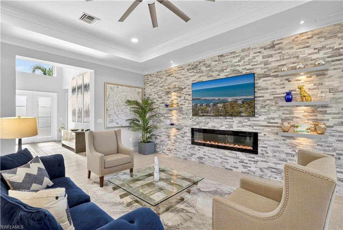 If Valencia Bonita is on your list, this is the one you’ve been waiting for! Welcome to this exquisite, fully furnished move-in-ready Caroline model home in Valencia Bonita, where timeless design has met modern luxury. From the moment you arrive, the lush tropical landscaping and private courtyard entry create a striking first impression. Step inside the expansive foyer with soaring ceilings and designer lighting, and you’ll immediately sense the elegance carried throughout. The great room is a true showpiece, featuring a custom stacked-stone wall with floating shelves, a linear decorative fireplace, and expansive sliders that frame serene lake views. The gourmet kitchen is a chef’s dream, with an oversized quartz island, stainless steel appliance suite including an upgraded gas range, wine cooler, and abundant pantry-style cabinetry, all seamlessly connected to a bright breakfast nook with plantation shutters and tranquil outdoor lake views. An elegant formal dining room with tray ceilings and a beautiful pendant chandelier provides the perfect setting for entertaining. The spacious primary suite is a private retreat complete with designer chandelier, plantation shutters, and two walk-in closets, while the spa-inspired bath offers a soothing peninsula tub, large walk-in shower with upgraded dual shower heads, and two extended double vanities. An additional en-suite bedroom and an oversized den/media room with French doors and private entry from the exterior add comfort and flexibility. Step outside to discover a full outdoor paradise featuring a screened lanai with a gorgeous pool and spa, electronic storm screens, and sunset lake views. Additional features include a 3-car garage with premium epoxy finishes (ideal for a golf cart or workshop), solar panels keeping energy costs at approximately $30/month, a tankless water heater, and sophisticated upgrades throughout. This is your chance to begin enjoying the best of Valencia Bonita immediately. Residents of this sought-after 55+ community also enjoy world-class amenities, including a resort-style pool, clubhouse with dining, fitness center, tennis and pickleball courts, and a vibrant calendar of social activities. This residence is the perfect blend of modern sophistication, energy efficiency, and the quintessential Florida lifestyle.