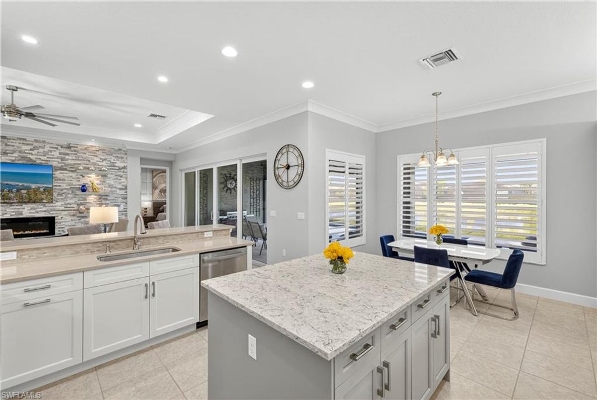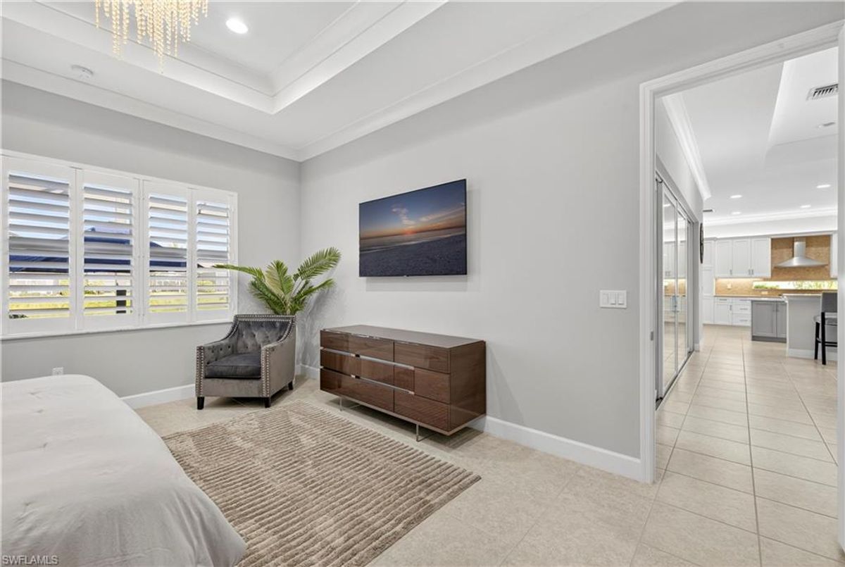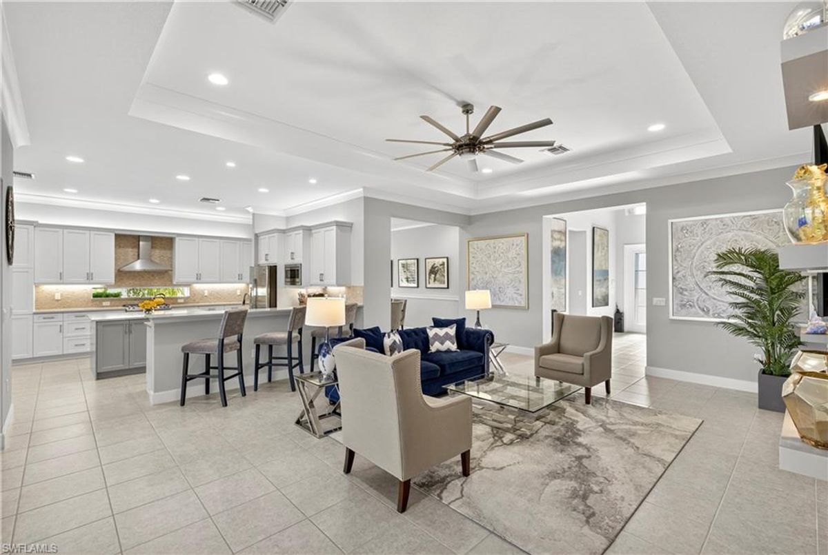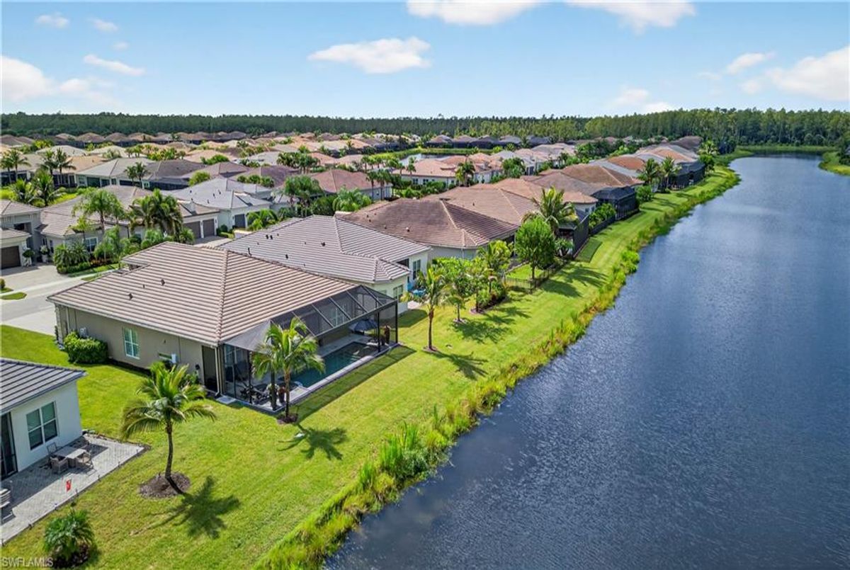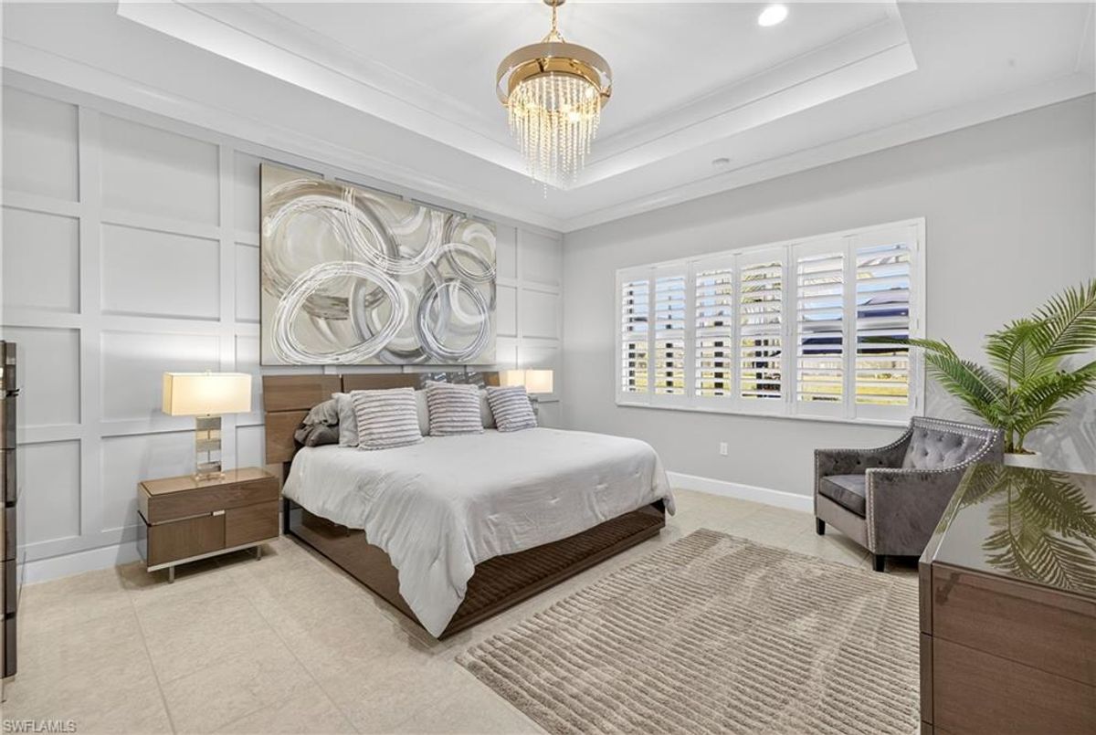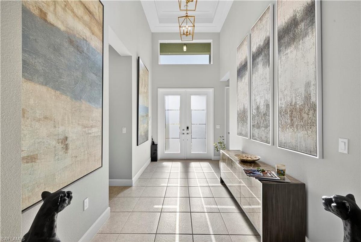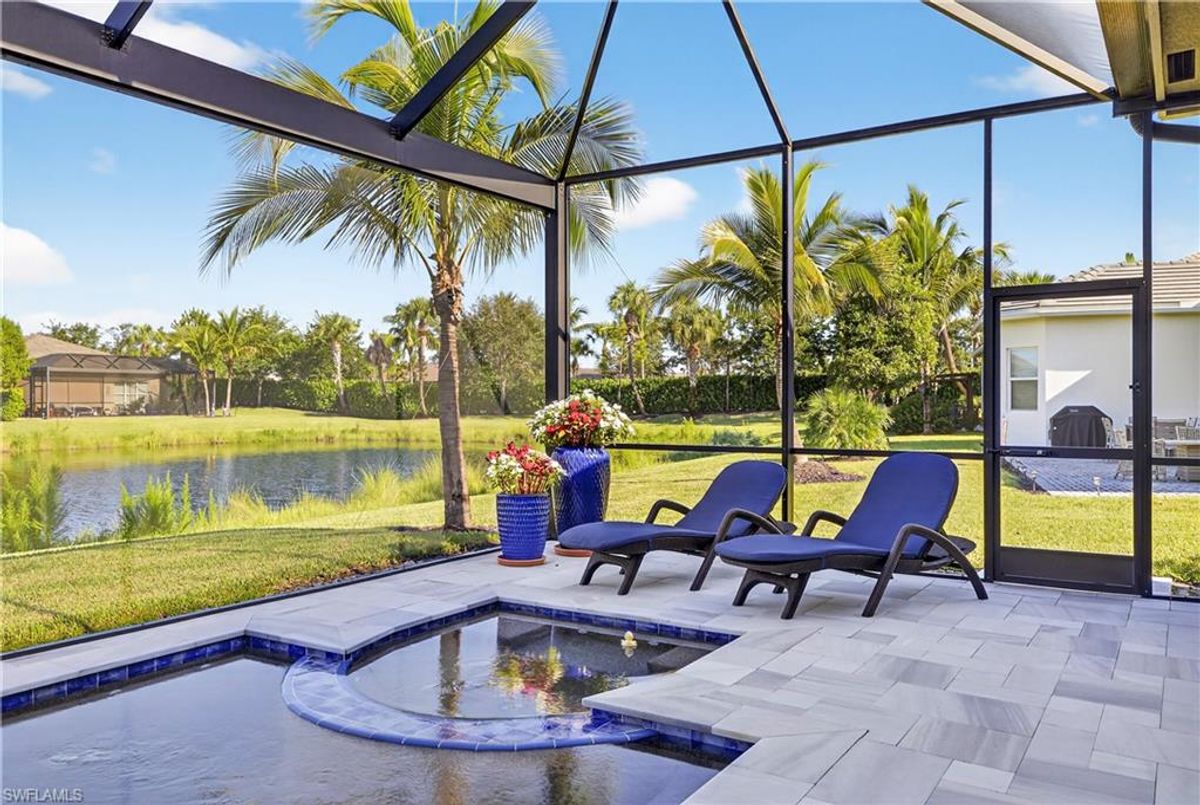 If Valencia Bonita is on your list, this is the one you’ve been waiting for! Welcome to this exquisite, fully furnished move-in-ready Caroline model home in Valencia Bonita, where timeless design has met modern luxury. From the moment you arrive, the lush tropical landscaping and private courtyard entry create a striking first impression. Step inside the expansive foyer with soaring ceilings and designer lighting, and you’ll immediately sense the elegance carried throughout. The great room is a true showpiece, featuring a custom stacked-stone wall with floating shelves, a linear decorative fireplace, and expansive sliders that frame serene lake views. The gourmet kitchen is a chef’s dream, with an oversized quartz island, stainless steel appliance suite including an upgraded gas range, wine cooler, and abundant pantry-style cabinetry, all seamlessly connected to a bright breakfast nook with plantation shutters and tranquil outdoor lake views. An elegant formal dining room with tray ceilings and a beautiful pendant chandelier provides the perfect setting for entertaining. The spacious primary suite is a private retreat complete with designer chandelier, plantation shutters, and two walk-in closets, while the spa-inspired bath offers a soothing peninsula tub, large walk-in shower with upgraded dual shower heads, and two extended double vanities. An additional en-suite bedroom and an oversized den/media room with French doors and private entry from the exterior add comfort and flexibility. Step outside to discover a full outdoor paradise featuring a screened lanai with a gorgeous pool and spa, electronic storm screens, and sunset lake views. Additional features include a 3-car garage with premium epoxy finishes (ideal for a golf cart or workshop), solar panels keeping energy costs at approximately $30/month, a tankless water heater, and sophisticated upgrades throughout. This is your chance to begin enjoying the best of Valencia Bonita immediately. Residents of this sought-after 55+ community also enjoy world-class amenities, including a resort-style pool, clubhouse with dining, fitness center, tennis and pickleball courts, and a vibrant calendar of social activities. This residence is the perfect blend of modern sophistication, energy efficiency, and the quintessential Florida lifestyle.