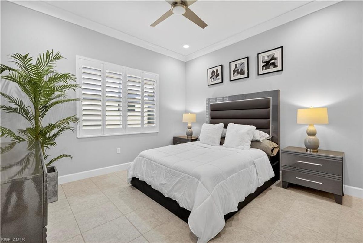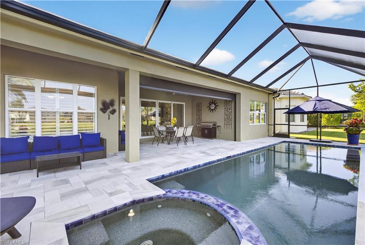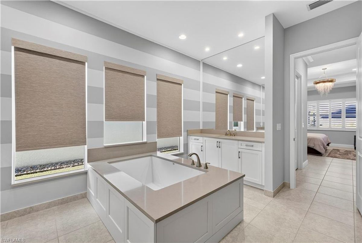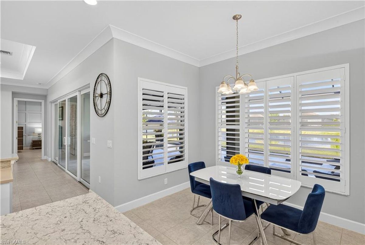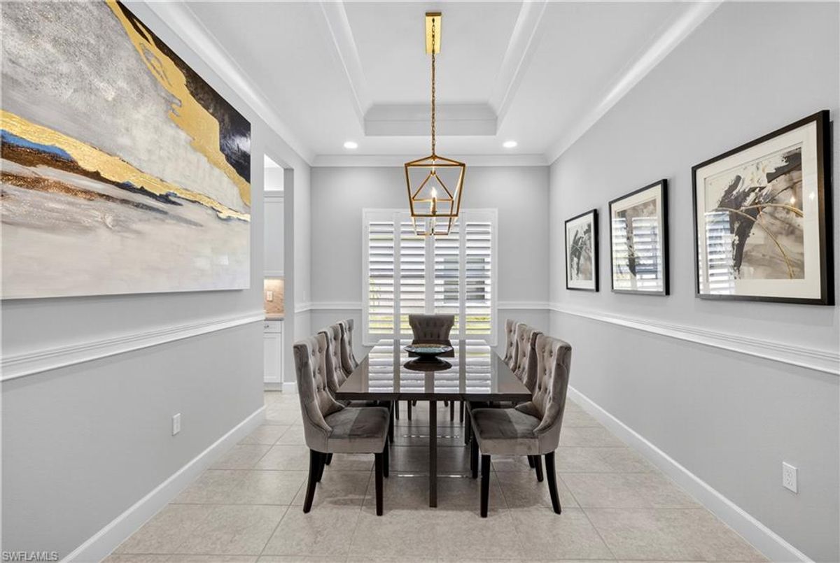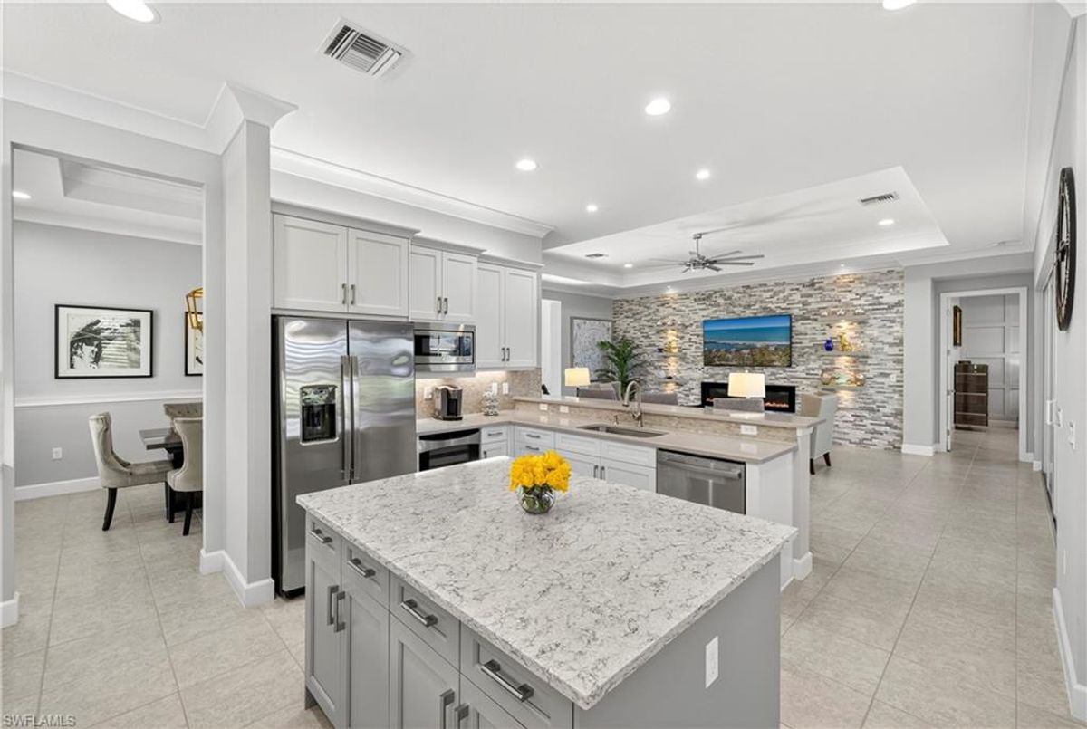 If Valencia Bonita is on your list, this is the one you’ve been waiting for! Welcome to this exquisite, fully furnished move-in-ready Caroline model home in Valencia Bonita, where timeless design has met modern luxury. From the moment you arrive, the lush tropical landscaping and private courtyard entry create a striking first impression. Step inside the expansive foyer with soaring ceilings and designer lighting, and you’ll immediately sense the elegance carried throughout. The great room is a true showpiece, featuring a custom stacked-stone wall with floating shelves, a linear decorative fireplace, and expansive sliders that frame serene lake views. The gourmet kitchen is a chef’s dream, with an oversized quartz island, stainless steel appliance suite including an upgraded gas range, wine cooler, and abundant pantry-style cabinetry, all seamlessly connected to a bright breakfast nook with plantation shutters and tranquil outdoor lake views. An elegant formal dining room with tray ceilings and a beautiful pendant chandelier provides the perfect setting for entertaining. The spacious primary suite is a private retreat complete with designer chandelier, plantation shutters, and two walk-in closets, while the spa-inspired bath offers a soothing peninsula tub, large walk-in shower with upgraded dual shower heads, and two extended double vanities. An additional en-suite bedroom and an oversized den/media room with French doors and private entry from the exterior add comfort and flexibility. Step outside to discover a full outdoor paradise featuring a screened lanai with a gorgeous pool and spa, electronic storm screens, and sunset lake views. Additional features include a 3-car garage with premium epoxy finishes (ideal for a golf cart or workshop), solar panels keeping energy costs at approximately $30/month, a tankless water heater, and sophisticated upgrades throughout. This is your chance to begin enjoying the best of Valencia Bonita immediately. Residents of this sought-after 55+ community also enjoy world-class amenities, including a resort-style pool, clubhouse with dining, fitness center, tennis and pickleball courts, and a vibrant calendar of social activities. This residence is the perfect blend of modern sophistication, energy efficiency, and the quintessential Florida lifestyle.