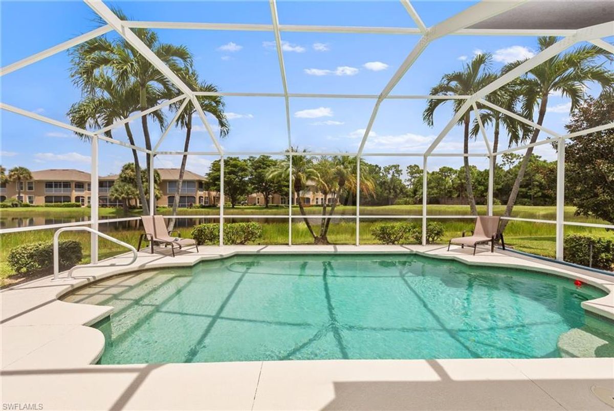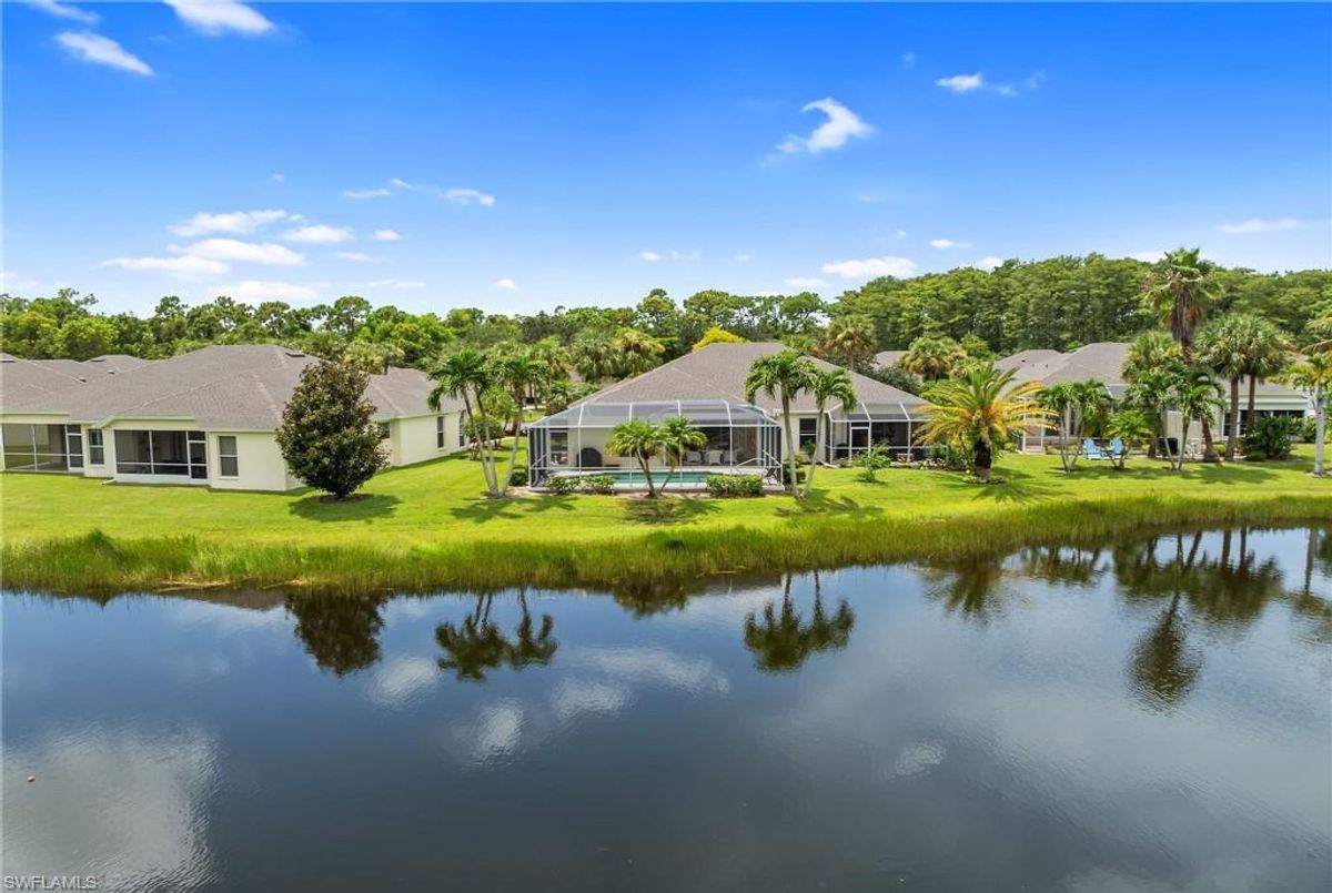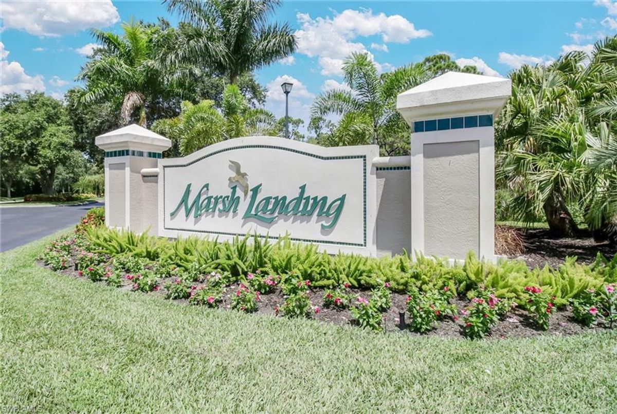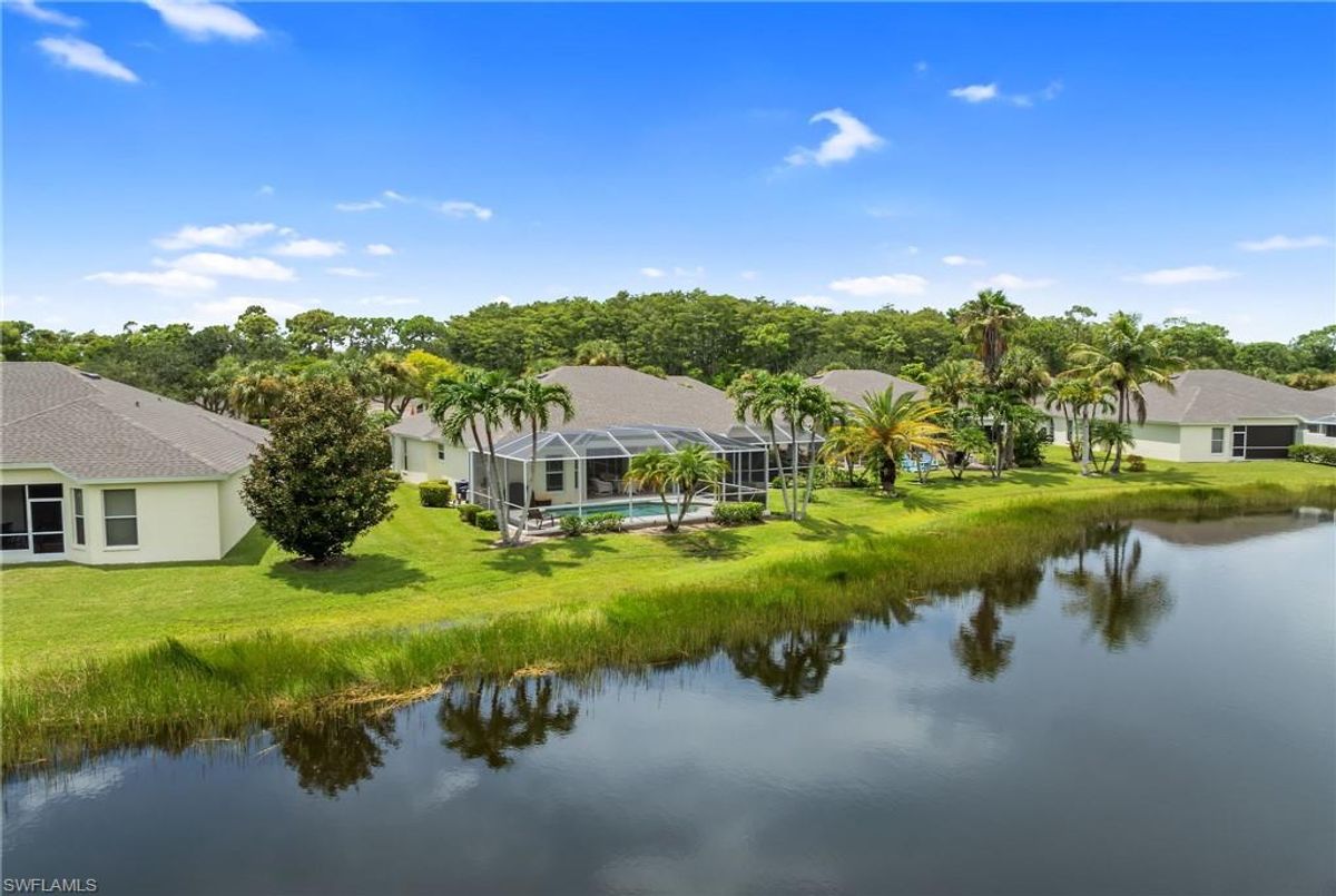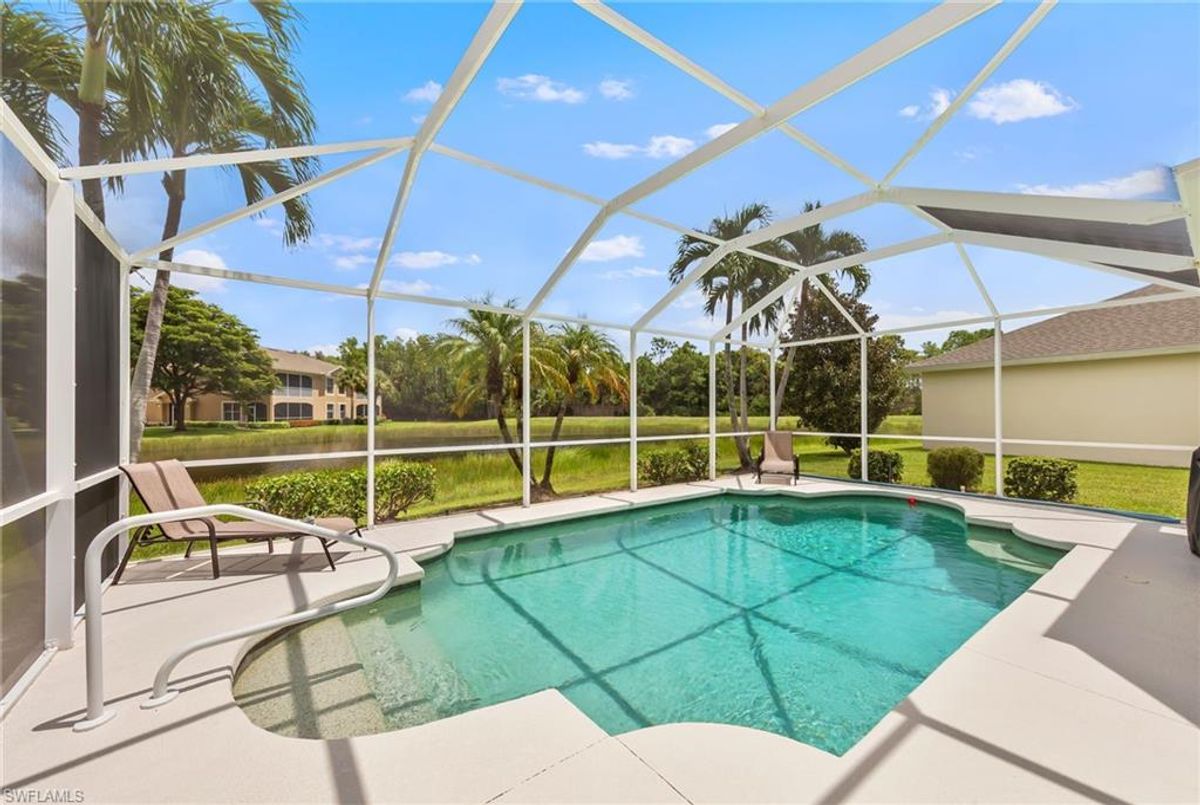 Welcome to this immaculately maintained lakefront pool home and light-filled villa, with 2 bedrooms & Den, 2 baths and 2 car garage. Perfectly positioned to capture serene lake views with an open, airy floor plan that instantly feels like home. From the moment you step into the spacious Great Room, you’ll notice the plush carpeting, soaring vaulted ceilings, and an abundance of natural light enhanced by fresh white paint—creating a clean canvas ready for your personal touch. Beautiful Mahogany wood flooring in both the entry and kitchen. The updated kitchen is a chef’s delight, featuring sleek stainless steel appliances, elegant countertops, and two separate dining areas—ideal for both entertaining and casual meals. The generous primary suite serves as a private retreat, complete with a luxurious spa like ensuite bathroom offering dual sinks, a walk-in shower with custom tile, and a separate stand alone soaking tub for the ultimate relaxation experience. A versatile den provides the perfect space for a home office, guest room, or cozy reading nook. Step outside to your private screened-in lanai with pool, where you can enjoy peaceful lake views and gentle Florida breezes. For added comfort and peace of mind, the lanai includes a hurricane-rated, remote-operated shade. A/C was replaced in 2022, water heater 2024. New roofs were just installed and exteriors painted this year! Hurricane windows on the rear of the home and side bathroom, other openings have metal shutters. The home is even nicer in person than the pictures show! Located in the highly sought-after Marsh Landing community, residents enjoy access to exceptional amenities including a heated pool and spa, tennis courts, four pickleball courts, basketball, bocce ball, a fitness center, and a welcoming clubhouse. Just across the street from Coconut Point Mall, you're minutes from top-tier shopping, dining, and entertainment, as well as RSW International Airport and the stunning Gulf beaches. Don’t miss this opportunity to live the Southwest Florida lifestyle you’ve been dreaming of! ...