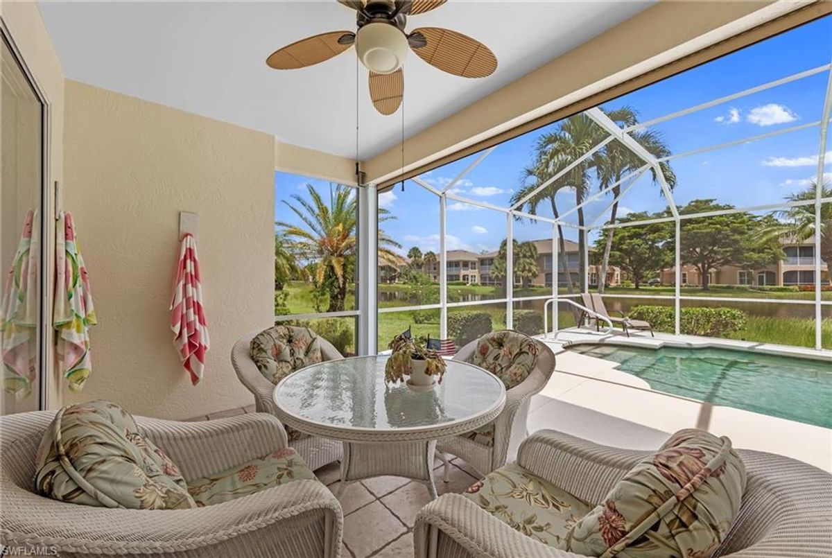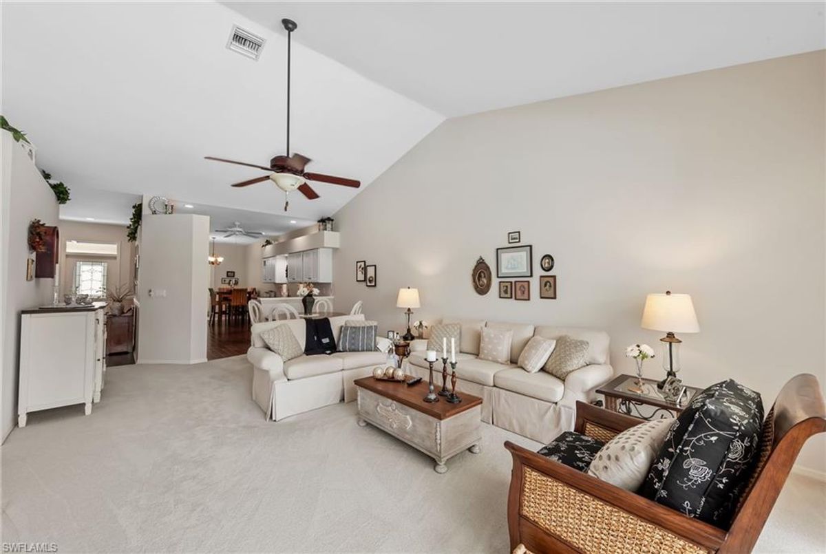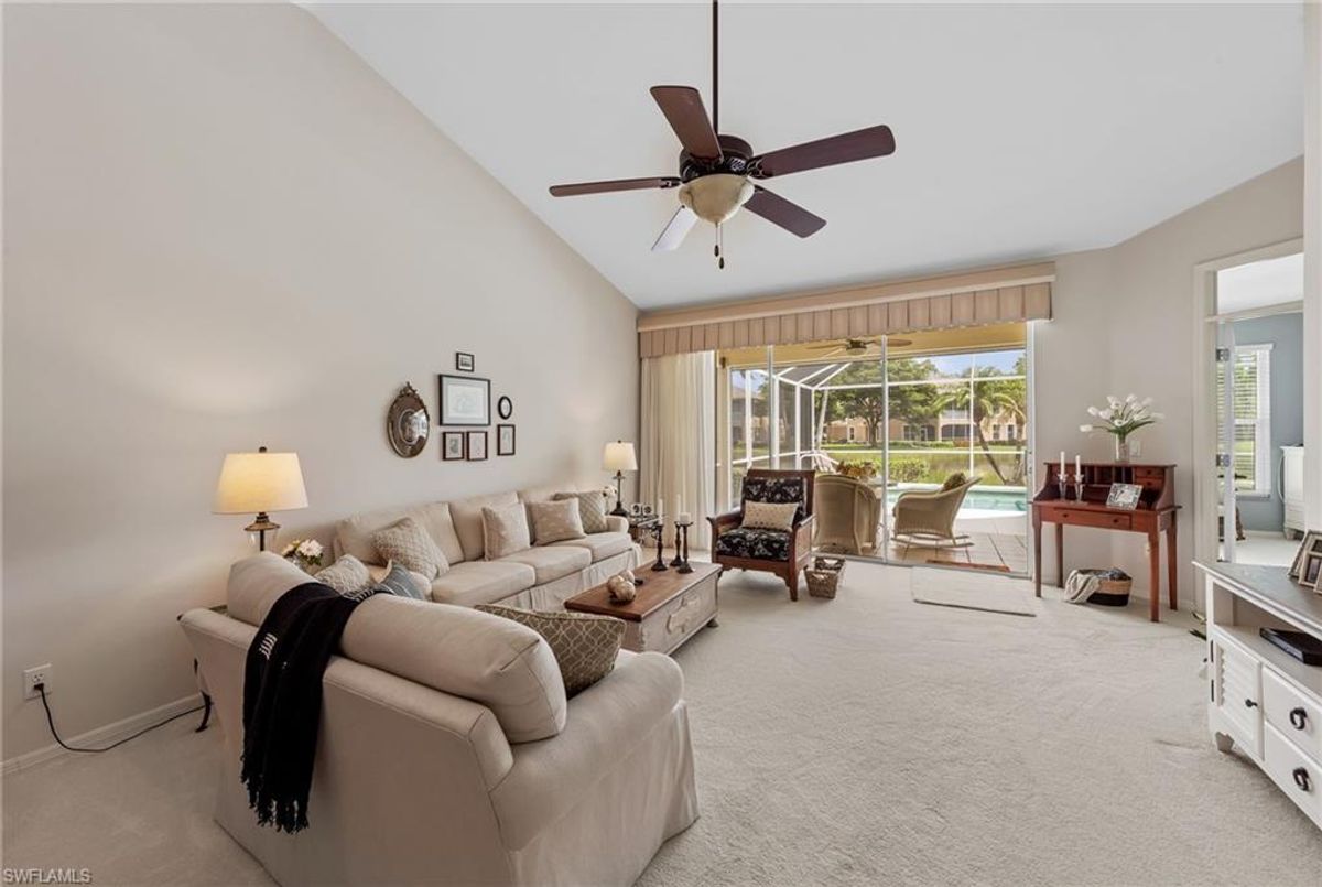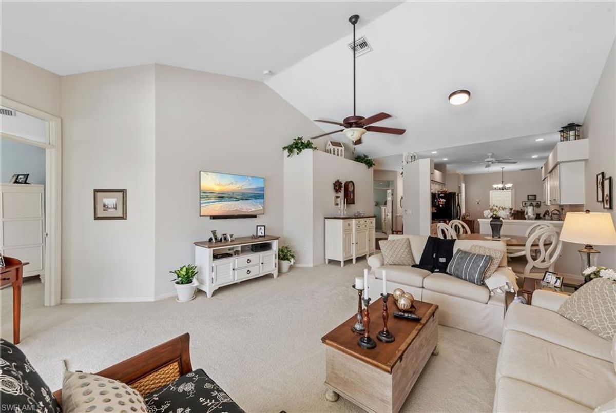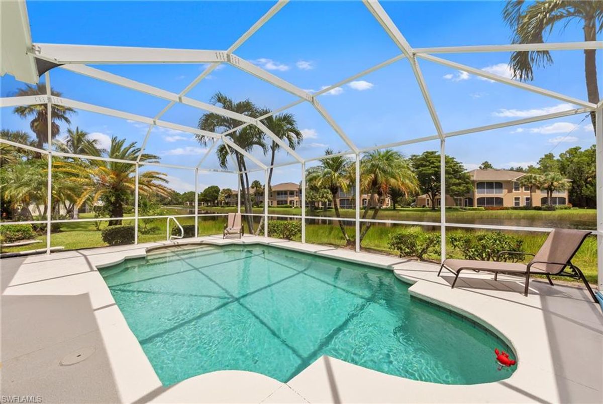 Welcome to this immaculately maintained lakefront pool home and light-filled villa, with 2 bedrooms & Den, 2 baths and 2 car garage. Perfectly positioned to capture serene lake views with an open, airy floor plan that instantly feels like home. From the moment you step into the spacious Great Room, you’ll notice the plush carpeting, soaring vaulted ceilings, and an abundance of natural light enhanced by fresh white paint—creating a clean canvas ready for your personal touch. Beautiful Mahogany wood flooring in both the entry and kitchen. The updated kitchen is a chef’s delight, featuring sleek stainless steel appliances, elegant countertops, and two separate dining areas—ideal for both entertaining and casual meals. The generous primary suite serves as a private retreat, complete with a luxurious spa like ensuite bathroom offering dual sinks, a walk-in shower with custom tile, and a separate stand alone soaking tub for the ultimate relaxation experience. A versatile den provides the perfect space for a home office, guest room, or cozy reading nook. Step outside to your private screened-in lanai with pool, where you can enjoy peaceful lake views and gentle Florida breezes. For added comfort and peace of mind, the lanai includes a hurricane-rated, remote-operated shade. A/C was replaced in 2022, water heater 2024. New roofs were just installed and exteriors painted this year! Hurricane windows on the rear of the home and side bathroom, other openings have metal shutters. The home is even nicer in person than the pictures show! Located in the highly sought-after Marsh Landing community, residents enjoy access to exceptional amenities including a heated pool and spa, tennis courts, four pickleball courts, basketball, bocce ball, a fitness center, and a welcoming clubhouse. Just across the street from Coconut Point Mall, you're minutes from top-tier shopping, dining, and entertainment, as well as RSW International Airport and the stunning Gulf beaches. Don’t miss this opportunity to live the Southwest Florida lifestyle you’ve been dreaming of! ...