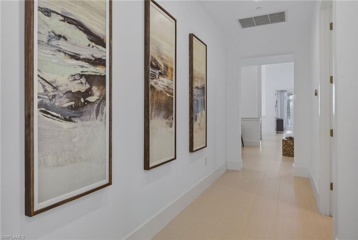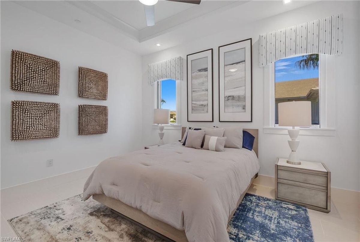 Discover tranquil lake and lush palm views from this beautifully furnished, light and bright Magnolia floorplan residence, quality built in 2020 by Gulf Bay Homes in the exclusive village of Dorado at Fiddler’s Creek. With eastern exposure for gorgeous sunrises and a design that lives like a single-family home, this second-floor retreat offers three bedrooms plus a den, three-and-a-half baths and a spacious two-car garage. The popular layout blends sophistication and comfort, enhanced by soaring volume ceilings, dramatic architectural details and seamless indoor-outdoor living. A wood staircase with stainless accent rods leads to the impressive main living area, where 35-by-11-inch porcelain tile floors, recessed LED lighting and custom ceilings set the tone. The great room exceeds expectations with a vaulted ceiling featuring shiplap and coffered accents, ceiling speakers and water views through sliding doors with remote-controlled electric shades. The adjacent dining area includes a built-in dry bar with cabinetry and counter space, ideal for entertaining. The chef’s kitchen boasts white cabinetry with glass-front uppers, in-cabinet and under-cabinet lighting, quartz counters, and a glass-tile backsplash. A full suite of Bosch stainless appliances includes a French-door refrigerator with freezer drawer, wall microwave, natural gas cooktop with hood vent, wall oven with convection and dishwasher. An island with pendant lighting and bar seating, plus a pantry, completes the space, which flows effortlessly into the living and dining areas. The owner’s suite is a serene retreat with coffered ceilings, stunning water views and a spa-like en-suite bath offering dual quartz vanities with makeup counter, a frameless walk-in shower with bench, and an expansive walk-in closet with custom wood shelving. Two guest bedrooms each feature en-suite baths, one with French doors leading to a private tiled balcony. The den, accented with tray ceilings and crown molding, provides the ideal setting for a home office or study. Additional highlights include a powder bath, a well-appointed laundry room with quartz counters, and a two-car garage with epoxy flooring and a 240-volt outlet for EV charger. The screened lanai offers covered outdoor living with tile flooring, a tray ceiling with wood plank, ceiling fans and recessed LED lighting, all overlooking lake views. With impact glass windows and doors throughout, this home combines elegance with peace of mind. Residents enjoy world-class amenities including a resort-style pool, spa services, fitness center with classes, tennis and pickleball program with 10 new pickleball courts, bocce, an extensive activity calendar, and casual and fine dining. Miles of sidewalks wind through the lushly landscaped community for recreation, bicycling and running, while optional immediate memberships for golf, beach and marina elevate the Southwest Florida lifestyle, including a recently renovated golf course and new golf clubhouse.
