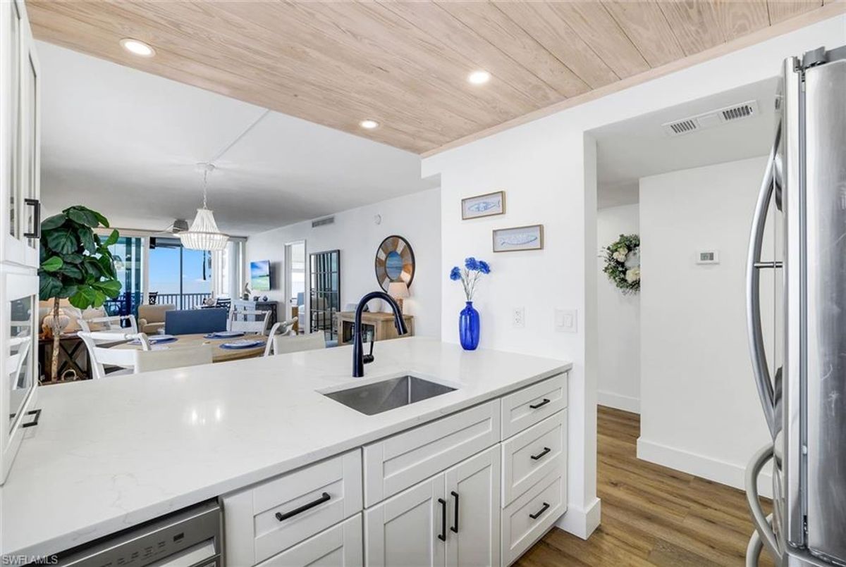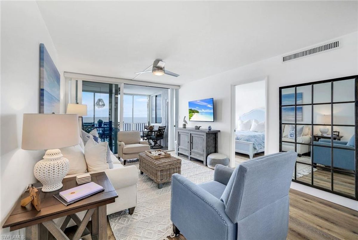 Beachfront Bliss with Spectacular Gulf Views on Bonita Beach! Wake up to the sound of gentle waves and end your day with stunning sunsets over the Gulf in this beautiful 2-bedroom, 2-bath beachfront corner unit residence. Offering panoramic views from Naples to Sanibel, this updated coastal-inspired getaway features soothing sea-glass tones, light color flooring and nicely appointed furnishings providing complete comfort and relaxation.Step out onto your screened lanai to watch dolphins and manatees play, boats drift by, and the sun melt into the horizon. Inside, enjoy an open floor plan with a bright kitchen, separate dining area as well as updated bathrooms, a spacious laundry room, and a beautiful guest bedroom. The Egret is being beautifully reimagined with lush tropical landscaping, a heated beachfront pool, community room with full kitchen and bathrooms, BBQ and more. The new pool deck is complete, the building freshly painted, and the new lobby ready to welcome you!Perfect for families, couples, or a friends’ getaway, this condo offers the best of Bonita Beach living—relax by the pool, stroll along the sugar-sand shore, or explore nearby waterfront dining.