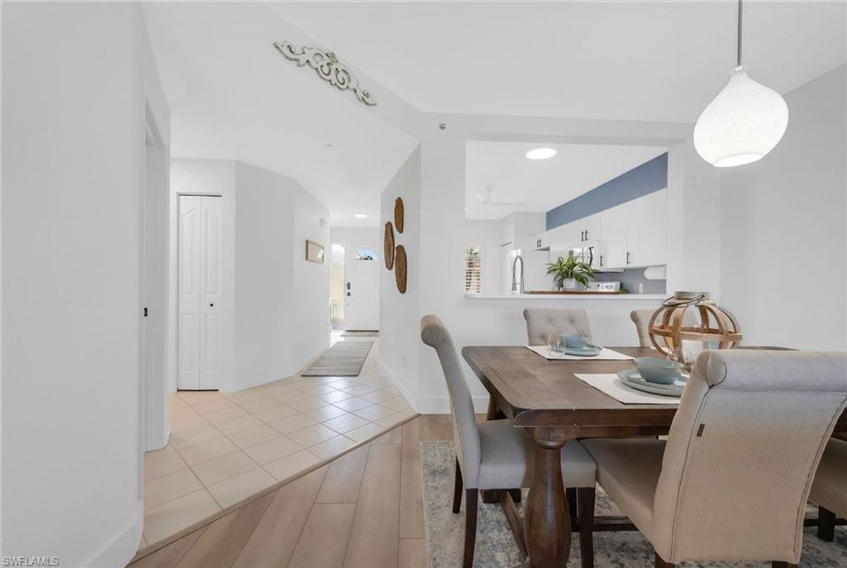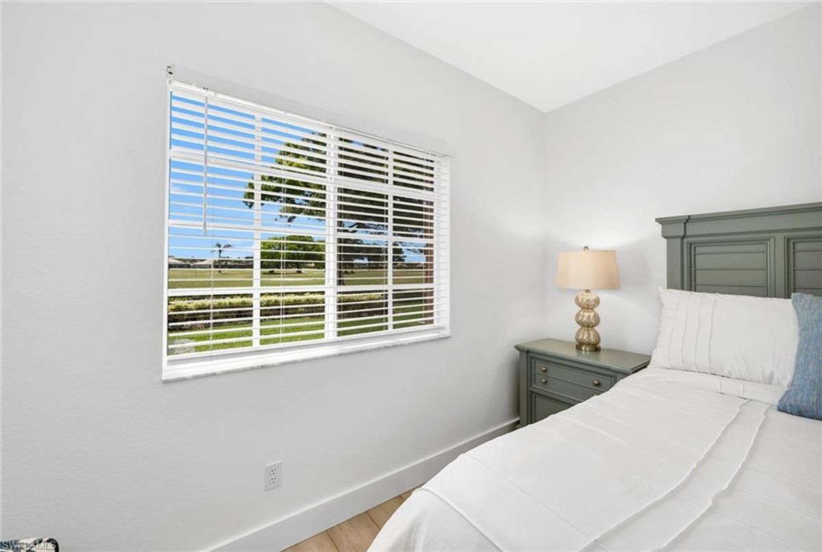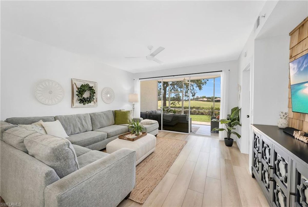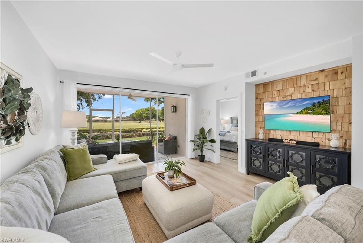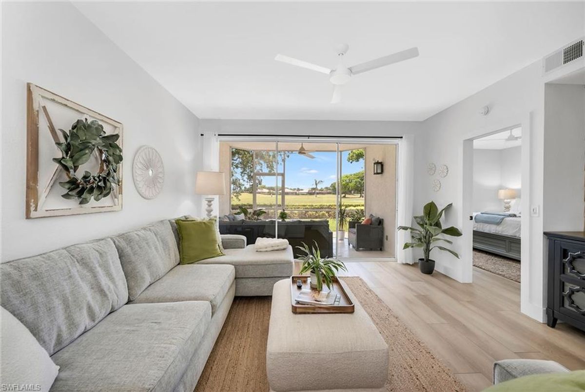 Are you searching for stunning sunset views, peaceful golf course vistas and an updated residence in the heart of Lely Resort? This western-facing condominium at Peridot at Sunstone offers wide and private views of the golf course from a spacious screened lanai, setting the tone for serene outdoor living. With recent upgrades throughout, this two-bedroom, two-bath unit with a garage delivers a refined lifestyle and unbeatable value in one of Naples sought-after resort communities. Freshly painted from top to bottom, this 1,248-square-foot home features a welcoming interior with updated molding, diagonal tile, and new luxury vinyl plank flooring throughout the living areas and bedrooms. The kitchen is light and functional with white cabinetry, recessed lighting, a ceiling fan, plantation shutters, a pantry and a full suite of appliances including a range, microwave, dishwasher, and refrigerator/freezer. The formal dining area flows into a bright living room with glass sliders that open to a screened lanai, where new no-see-um screens elevate the comfort and privacy of the outdoor space. The main suite offers more golf course views and includes new vinyl flooring, a closet with a new custom storage system and an en-suite bath featuring a quartz vanity with custom shiplap wall, built-in cabinetry and a glass-enclosed walk-in shower. The guest bedroom, on opposite side of the unit for added privacy, also features new vinyl plank flooring and is adjacent to a renovated bath. A spacious laundry room includes a utility sink, white overhead cabinetry, and an LG washer and dryer. A new water heater adds further value and efficiency. In addition to a private community pool and spa, residents have the option to join the award-winning Players Club and Spa, which offers exceptional amenities including three resort-style pools, a full-service spa, state-of-the-art fitness center with classes and instructors, bocce, tennis and pickleball courts, two restaurants, a dog park and an expanded tiki bar. Golf enthusiasts will appreciate the two nearby public courses. Ownership does not require membership in the Players Club, giving buyers flexibility to join if desired.