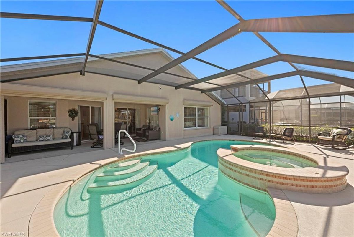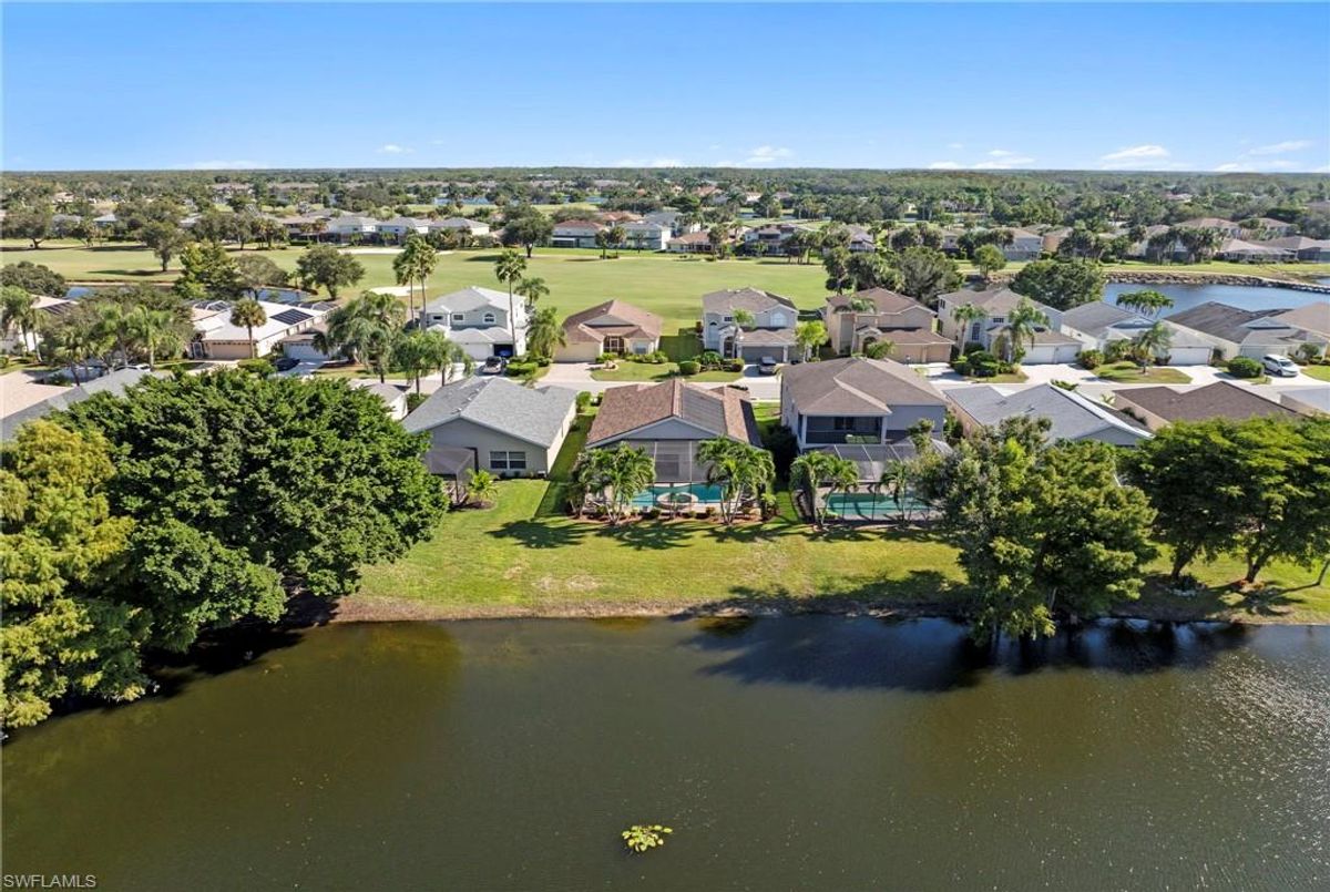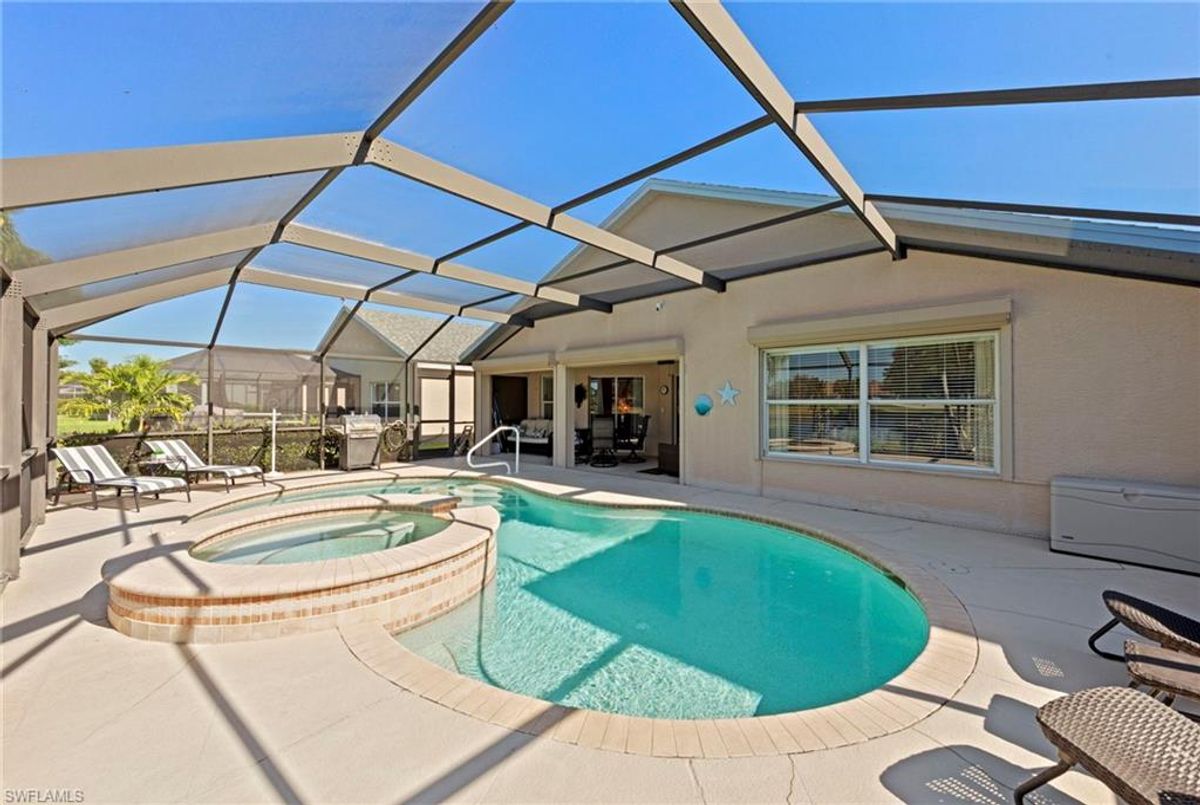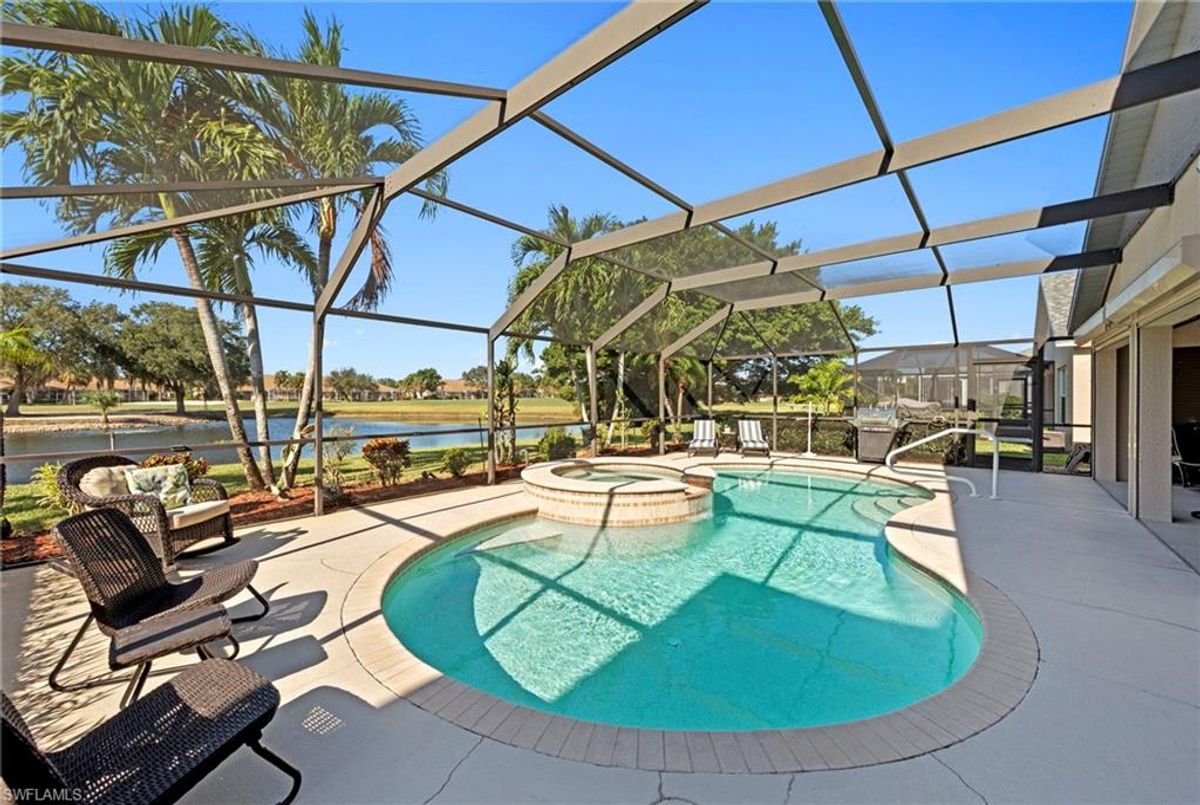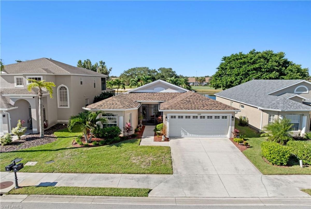 Experience the best of Florida living in this beautifully maintained 3-bedroom, 2-bath pool home with spa perfectly situated on a premium lakefront lot with panoramic golf course and lake views. The open great room floor plan features vaulted ceilings and large tile throughout the main living areas, creating a bright and inviting space perfect for entertaining. The kitchen overlooks the family room and includes a breakfast bar, ample cabinet space, and additional built-ins for storage. The spacious primary suite offers a walk-in closet, dual sinks, and a separate tub and shower. The guest bath has been tastefully remodeled with new shower tile and an updated vanity. When the home was built, the family room was enlarged to provide extra living space for relaxing or gathering with loved ones. Step out onto the screened lanai and take in the breathtaking panoramic lake and golf course views while enjoying your private heated pool and spa. With desirable western exposure, you’ll love watching colorful Florida sunsets year-round. Added peace of mind comes with electric hurricane shutters on all rear openings and impact glass windows in the front. This home perfectly combines comfort, functionality, and resort-style living in a serene lakefront setting—ready for you to move in and start enjoying the Florida lifestyle!Stoneybrook amenities offer something for everyone! Enjoy access to an exercise room, 3 community pools, tennis courts, pickleball, volleyball, basketball, bocce ball, a playground, and even a baseball field. The public golf course means you can pay as you play—no membership required. Conveniently located near shopping, dining, I-75, FGCU, beaches, and RSW airport. You're just a short drive to the golf clubhouse, CVS, Publix, Miromar Outlets, and Hertz Arena. With low association fees and a full range of amenities, it’s easy to see why Stoneybrook remains one of Estero’s most popular communities.