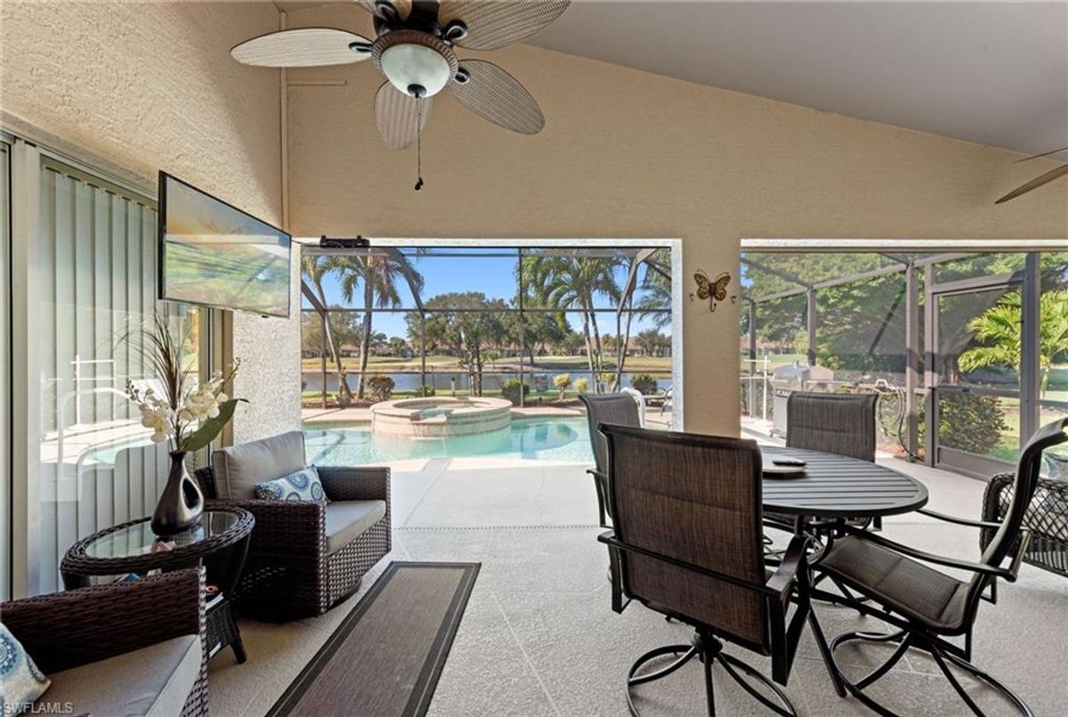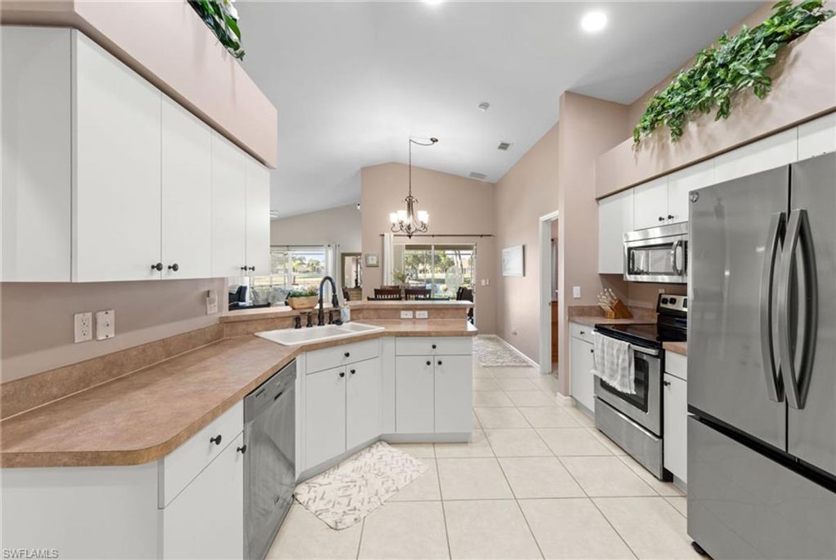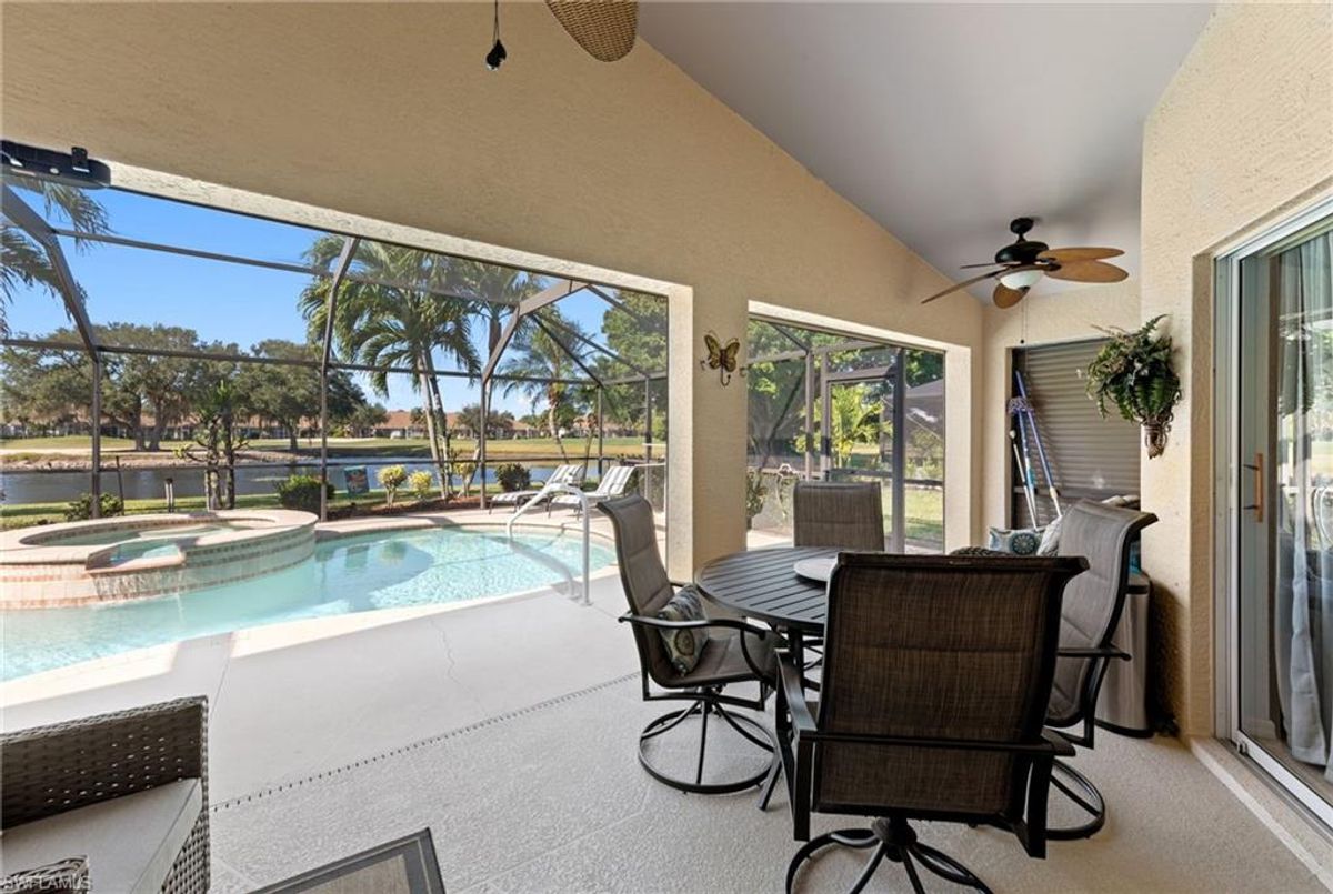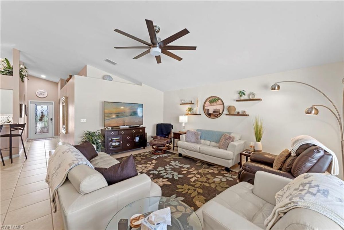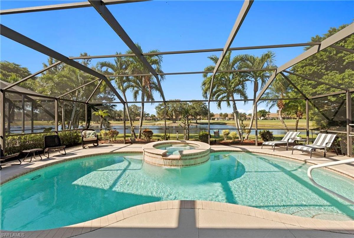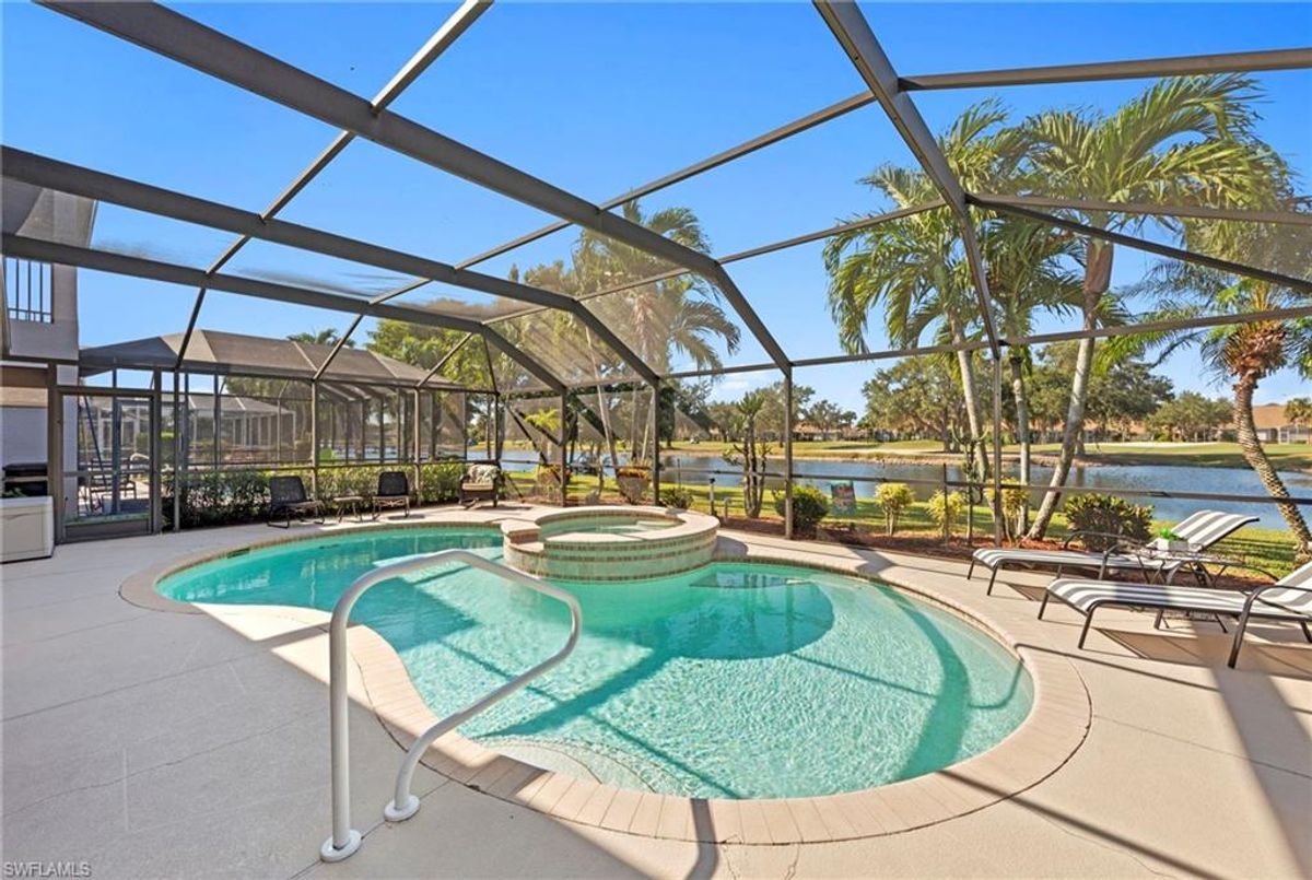 Experience the best of Florida living in this beautifully maintained 3-bedroom, 2-bath pool home with spa perfectly situated on a premium lakefront lot with panoramic golf course and lake views. The open great room floor plan features vaulted ceilings and large tile throughout the main living areas, creating a bright and inviting space perfect for entertaining. The kitchen overlooks the family room and includes a breakfast bar, ample cabinet space, and additional built-ins for storage. The spacious primary suite offers a walk-in closet, dual sinks, and a separate tub and shower. The guest bath has been tastefully remodeled with new shower tile and an updated vanity. When the home was built, the family room was enlarged to provide extra living space for relaxing or gathering with loved ones. Step out onto the screened lanai and take in the breathtaking panoramic lake and golf course views while enjoying your private heated pool and spa. With desirable western exposure, you’ll love watching colorful Florida sunsets year-round. Added peace of mind comes with electric hurricane shutters on all rear openings and impact glass windows in the front. This home perfectly combines comfort, functionality, and resort-style living in a serene lakefront setting—ready for you to move in and start enjoying the Florida lifestyle!Stoneybrook amenities offer something for everyone! Enjoy access to an exercise room, 3 community pools, tennis courts, pickleball, volleyball, basketball, bocce ball, a playground, and even a baseball field. The public golf course means you can pay as you play—no membership required. Conveniently located near shopping, dining, I-75, FGCU, beaches, and RSW airport. You're just a short drive to the golf clubhouse, CVS, Publix, Miromar Outlets, and Hertz Arena. With low association fees and a full range of amenities, it’s easy to see why Stoneybrook remains one of Estero’s most popular communities.
