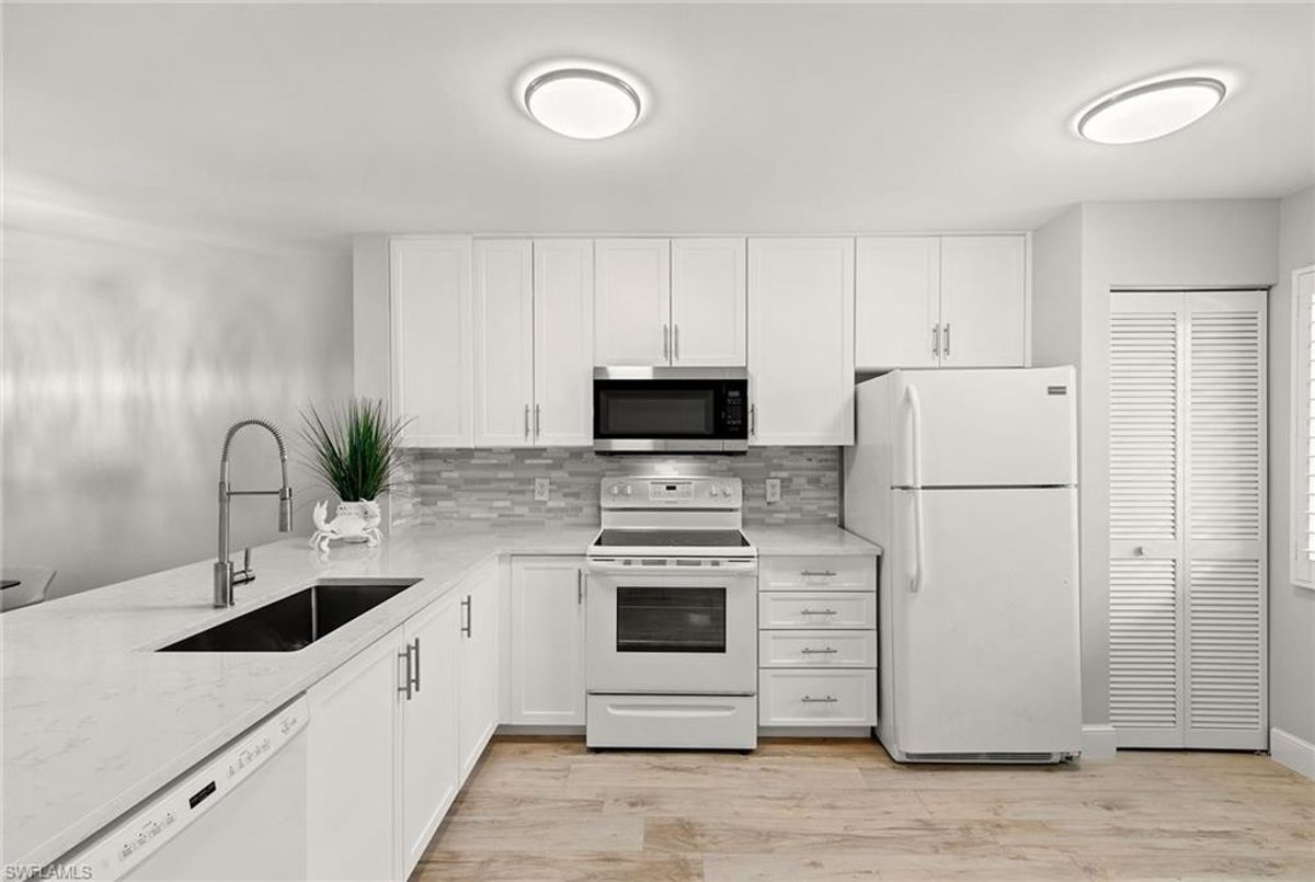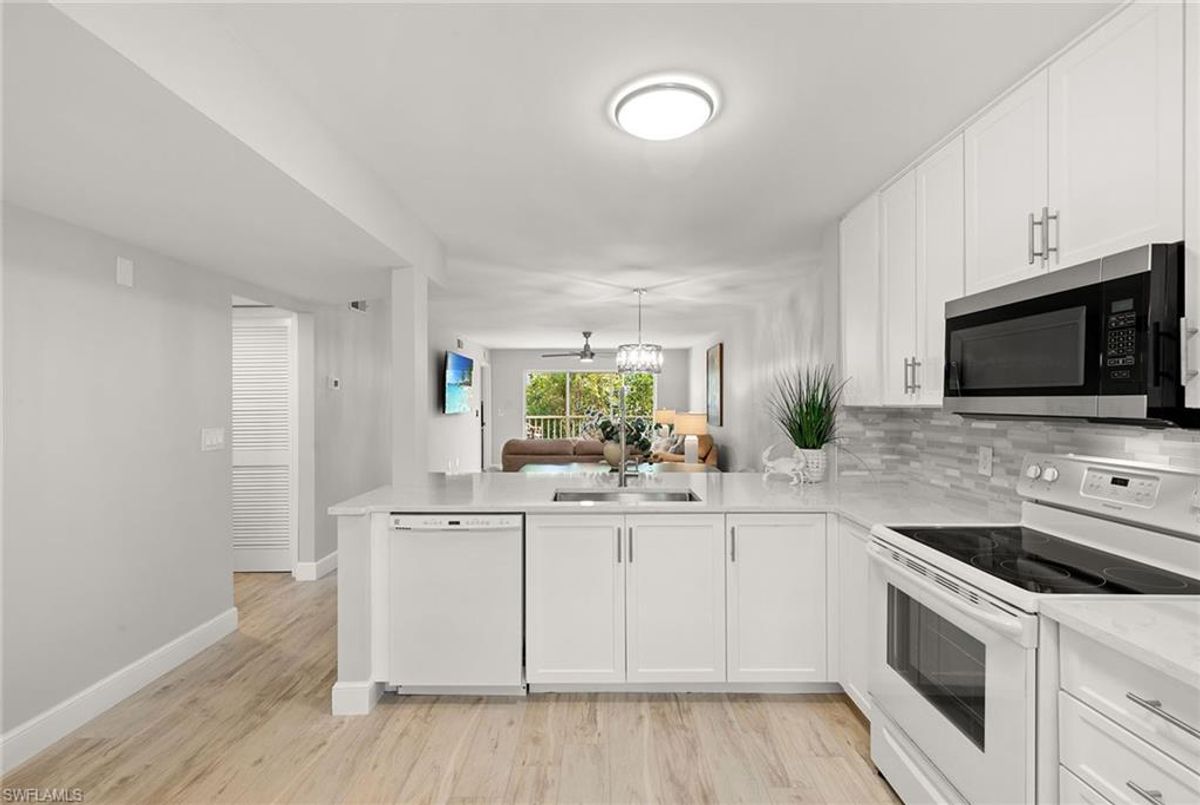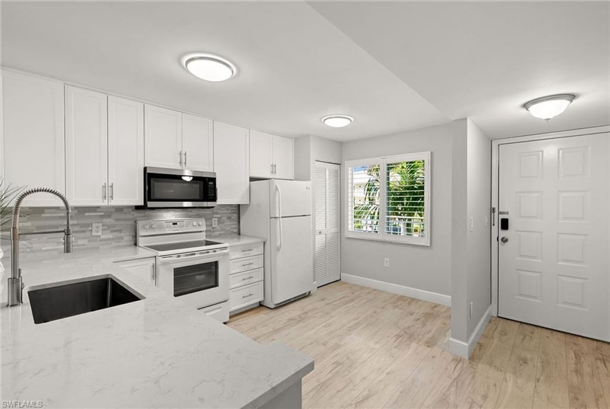 Turnkey, fully updated condominium in Naples Sandpiper Bay Club. Discover this beautifully updated two-bedroom, two-bath condominium in the quiet and private community of Naples Sandpiper Bay Club, just minutes from downtown Naples and the beaches. This second-floor residence has been thoughtfully renovated and is offered turnkey, featuring new luxury vinyl flooring, fresh paint throughout, new cabinetry, quartz countertops and updated lighting that brightens every space. Both baths have been completely remodeled with modern finishes, and the primary suite includes a redesigned walk-in closet offering excellent storage. Additional highlights include a new washer and dryer, a new water heater and generous storage throughout the unit. On 13 lush acres along Haldeman Creek, Naples Sandpiper Bay Club offers two sparkling swimming pools, a clubhouse with social activities, outdoor barbecue and dining areas, and ample parking. Gulf access is available via community boat docks, which can be leased or purchased when available. Turnkey and move-in ready, this updated coastal retreat is the ideal opportunity to enjoy the Naples lifestyle.