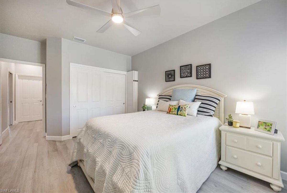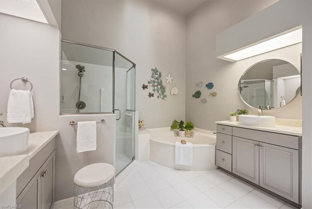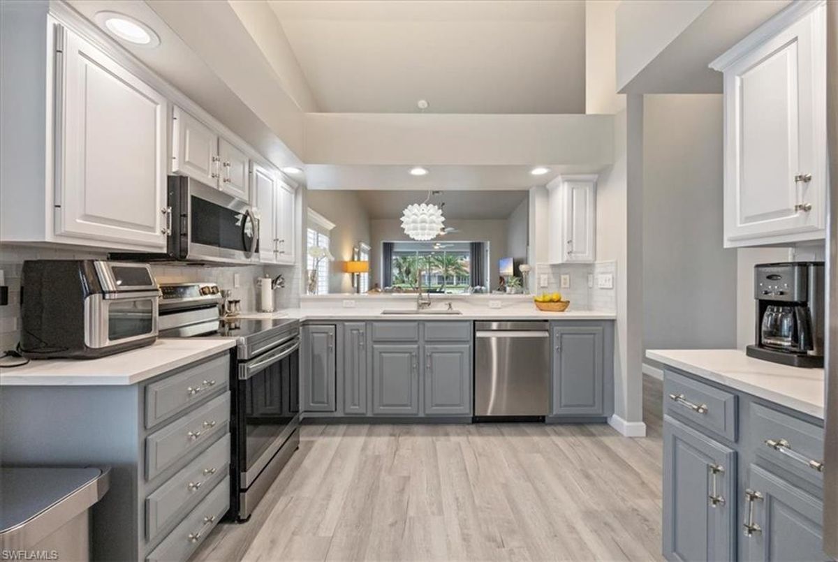 Elegantly poised in the prestigious enclave of North Naples, this meticulously renovated two-bedroom, two-bath villa epitomizes refined Florida luxury. Upon entering, you’re greeted by soaring vaulted ceilings, tasteful new flooring, freshly painted interiors, recently insulated attic, and an abundance of natural light that cascades through stunning plantation shutters. The gourmet kitchen, a culinary enthusiast’s haven, boasts premium stainless steel appliances, gleaming quartz countertops, stylish two-tone cabinetry, and a chic subway tile backsplash—all thoughtfully designed to seamlessly flow into the spacious, open living areas, ideal for entertaining guests or unwinding in sophisticated comfort. Step onto the serene lanai, where captivating, panoramic lake views framed by lush palms provide an exquisite backdrop for tranquil moments, enhanced by the convenience and security of an electric storm shutter. The luxurious primary suite, accentuated by an elegant bay window, offers a tranquil retreat complete with a lavish en-suite bathroom illuminated naturally by an inviting skylight, dual vanities, a soaking tub, and a separate glass-enclosed shower. Additional high-end upgrades include a pristine newer tile roof, upgraded air conditioning system, a modern water heater, and charming new paver driveway, further enhancing this villa’s impeccable curb appeal. Situated within a community renowned for its exceptional amenities, residents enjoy exclusive access to a resort-style pool, newly installed illuminated pickleball courts, a tennis court, an inviting community room, and scenic walking paths perfect for leisurely strolls. This exquisitely appointed villa offers not merely a residence, but a luxurious Naples lifestyle—an unmatched opportunity for those seeking elegance, serenity, and convenience at its finest.