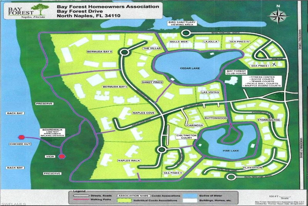 Move-in ready, low maintenance, and ideally located — this Naples single family home, west of 41 on Vanderbilt Dr, is the perfect place to enjoy the Naples lifestyle. Many current residents say they bought because of the old boardwalk - and now there is a brand new one!Discover easy living in this well-maintained 3-bedroom, 2-bath home located in the quiet, 15-home Sea Pines enclave of Bay Forest. With an attached two-car garage and quality updates throughout, this property is move-in ready and perfectly suited for relaxed Florida living.The custom kitchen by Ambiance Kitchen Designs features white cabinetry, quartz countertops, and stainless-steel appliances. Both bathrooms have been tastefully updated, and the bedrooms include custom built-in cabinetry for extra storage. Other upgrades include fresh paint, and luxury vinyl flooring.The spacious primary suite includes a modern bath with a large walk-in shower and matching cabinetry. The large lanai is surrounded by landscaping and a new irrigation system. A new water heater, 5-year-old roof and 7-year old A/C, offer peace of mind.Bay Forest is an active, friendly, gated community with 3 tennis and 3 pickleball courts, bocce, shuffleboard, fitness center and library at the clubhouse.The star attractions of Bay Forest are the 3 miles of walking trails around the two lakes and property perimeter, and the brand new (2025) boardwalk, extending through mangroves to a tiki hut, a favorite sunset gathering place, with a kayak launching raft.
