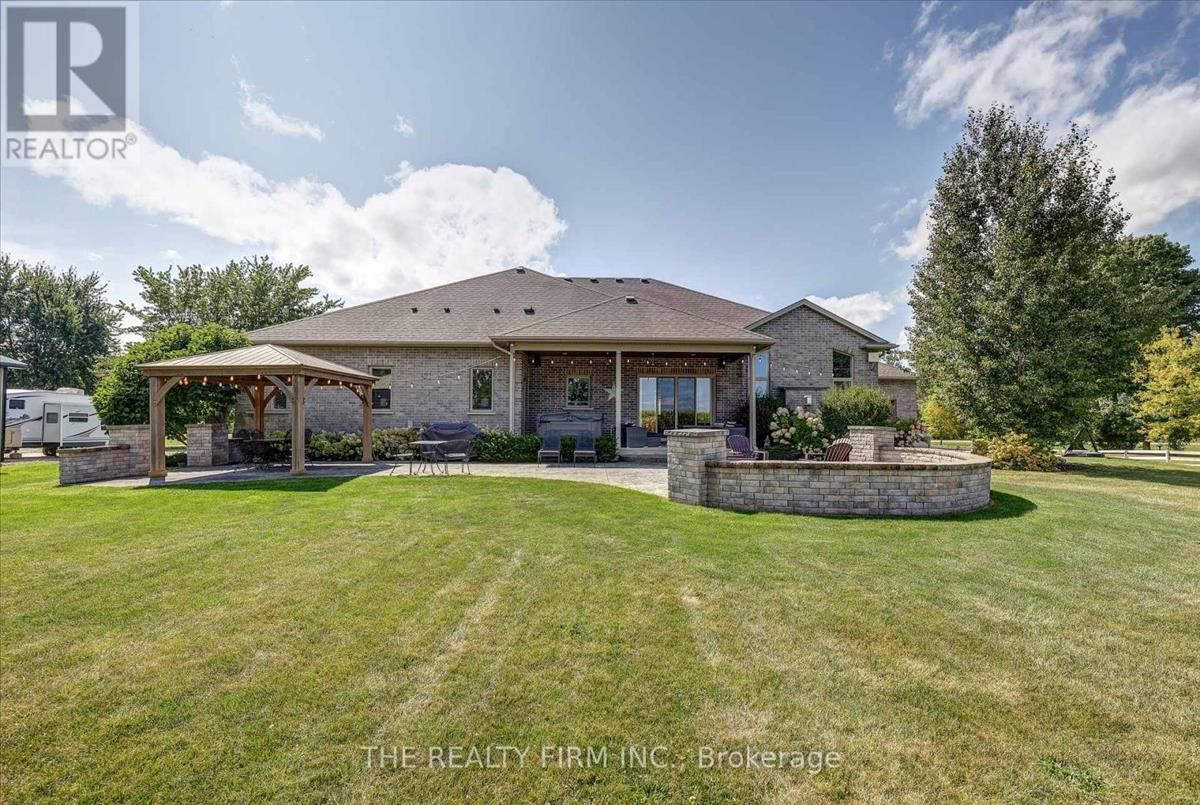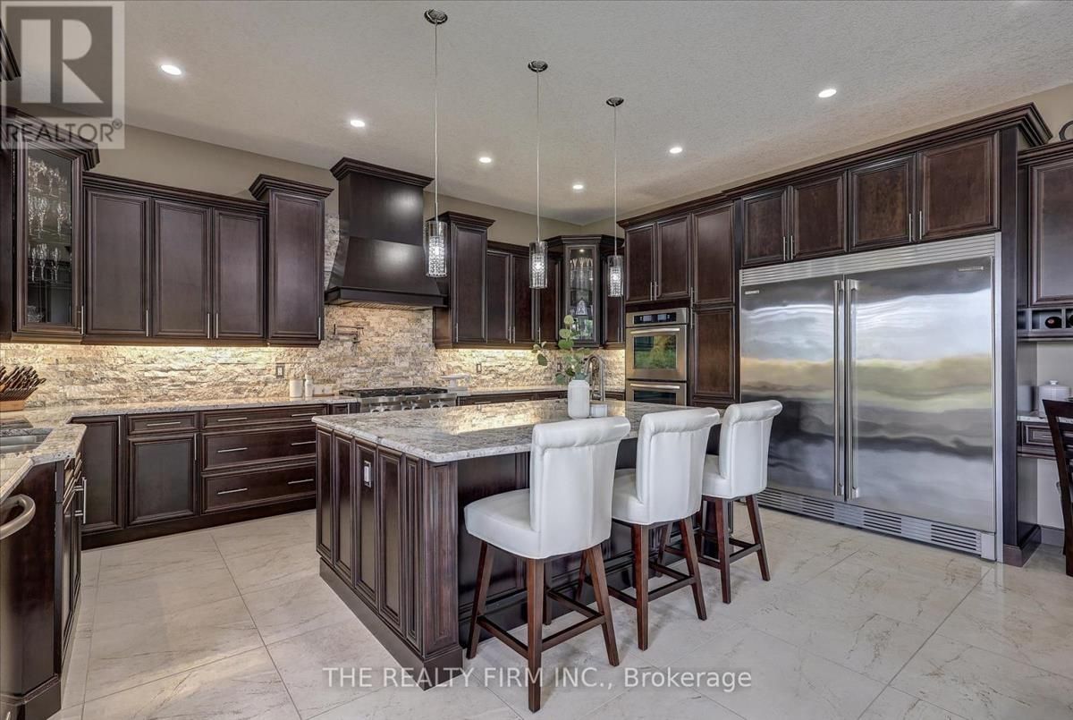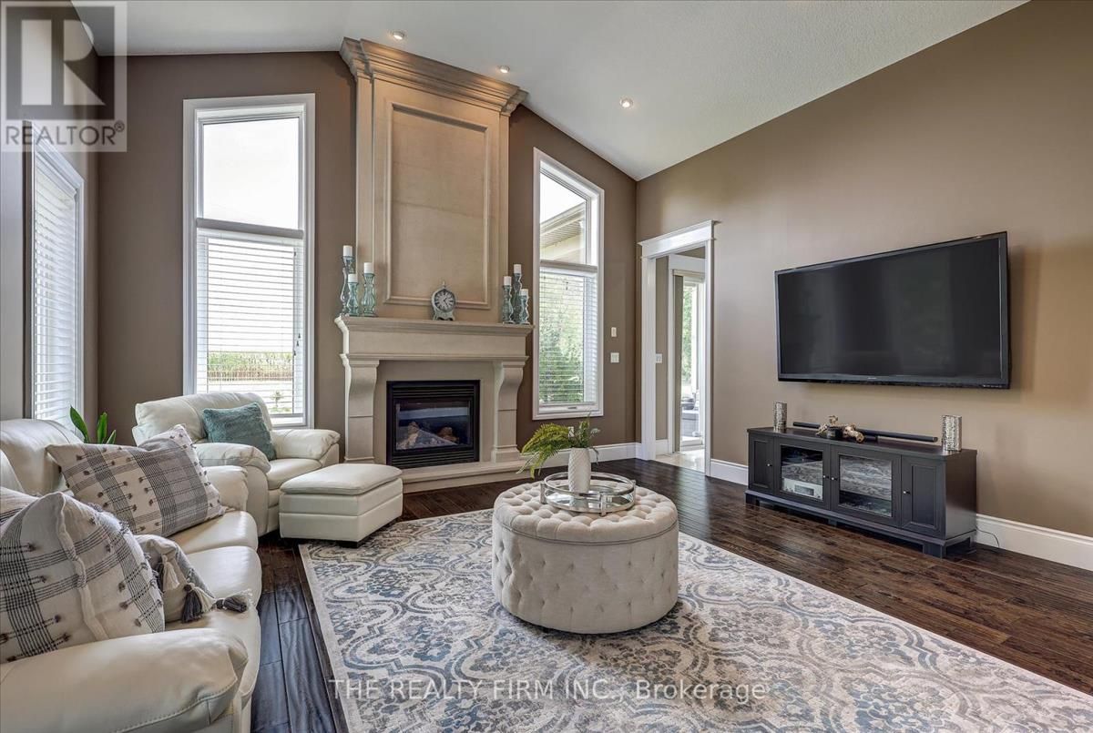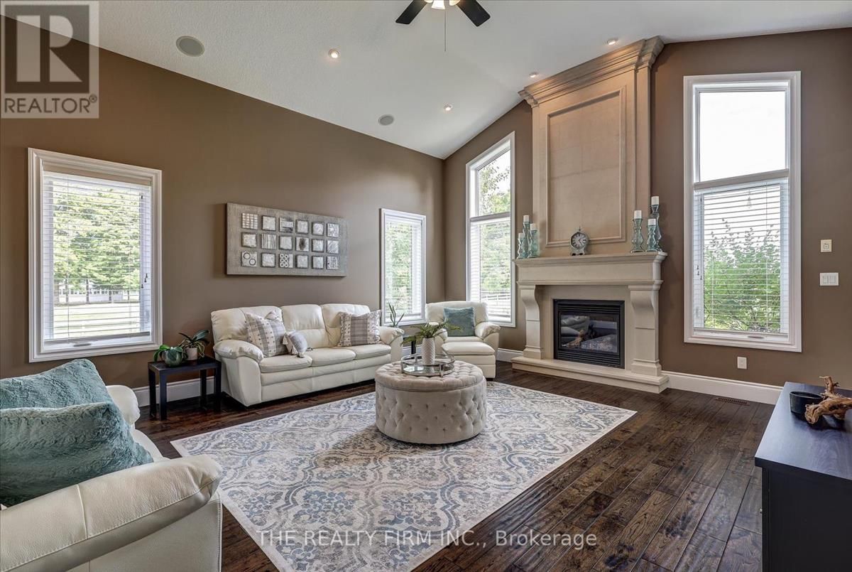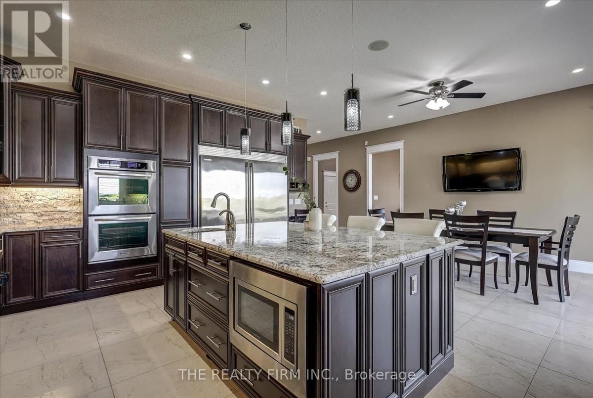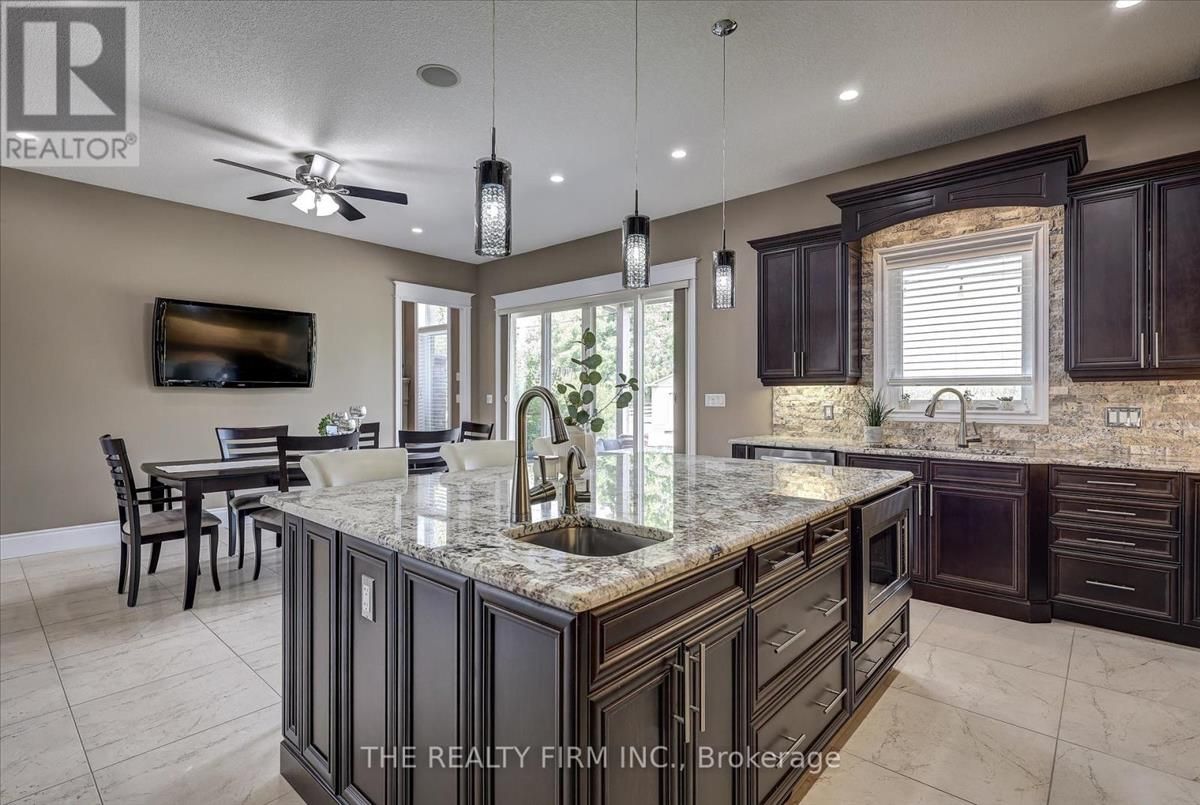 Welcome to your sanctuary of refined rural living at 22060 Nissouri Rd. Thorndale On. A breathtaking estate nestled on 1.33 acres spanning over 5,000 sq ft with exquisitely finished space. This majestic home features 4 + 1 bedrooms and 3.5 baths, crafted with thoughtful design and premium craftsmanship at every turn. Step through the stately entry into a 12' coffered-ceiling foyer with poplar custom trim flowing seamlessly into the family room with its soaring 13 vaulted ceiling and commanding floor-to-ceiling plaster gas fireplace. The kitchen, dazzles with maple cabinetry, a massive island with sink with reverse osmosis, a 6 burner gas stove, double wall ovens and luxe finishes like a travertine backsplash, Brizo faucets and Electrolux ICON fridge/freezer. The main level boasts 10 ceilings, 8 doors, hand scraped oak floors, Italian porcelain tile, granite throughout and an ambient speaker system all complemented by Hunter Douglas window treatments. A convenient main-floor laundry and custom drop zone add to daily ease. The lower level inspires with a stylish wet bar, wine fridge, additional bedroom, full bath, quartz and dual electric fireplaces, oak staircase, spray-foam insulation, separate garage access and a cold room. This property is ideal for multigenerational living with the separate lower level entrance, full amenities and expansive layout. Outside experience meticulously curated 360 landscaping and lighting, stamped concrete walkways and patios, a covered 10' x 25' patio with speakers, insulated attic & 2 extra circuits for a future sunroom addition. Completing the yard is a gas fire pit, a 20' x 22' shed with hydro, gazebo, backyard hydrant and a triple garage with an extra bay door to the back. Thorndale offers tranquility and vibrant community living with playgrounds, splash pad, skate park, sports courts and community gardens. A short drive to Londons premier shopping, business district & airport. The perfect blend of rural and urban charm (id:26457)
