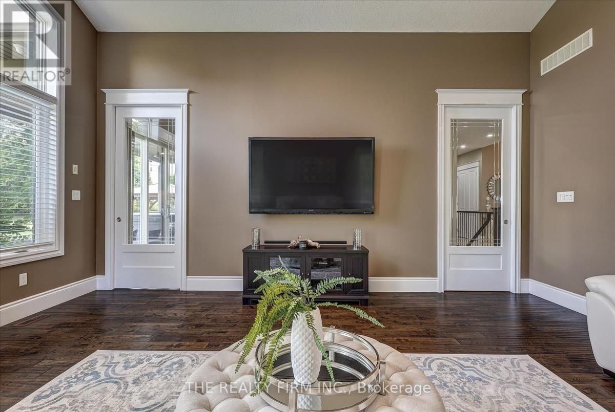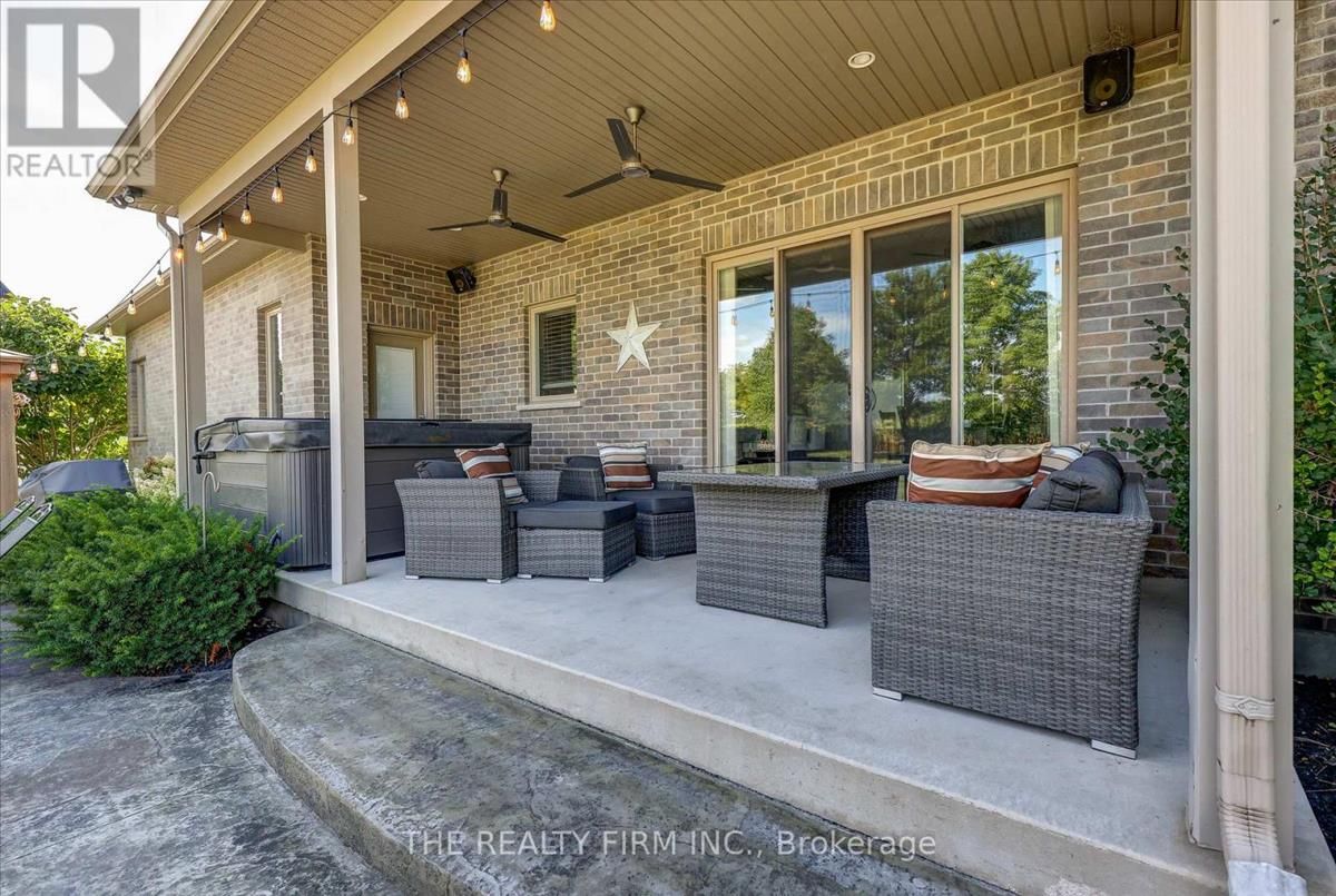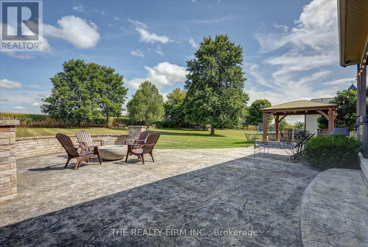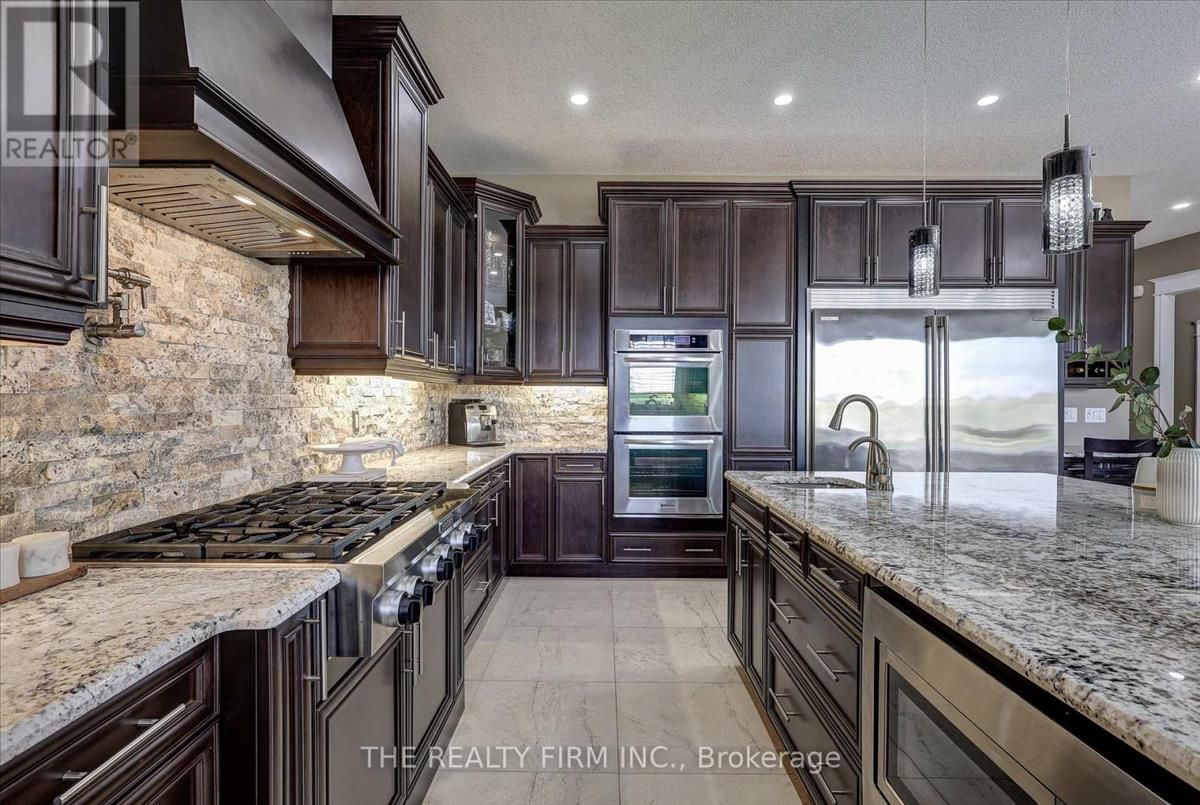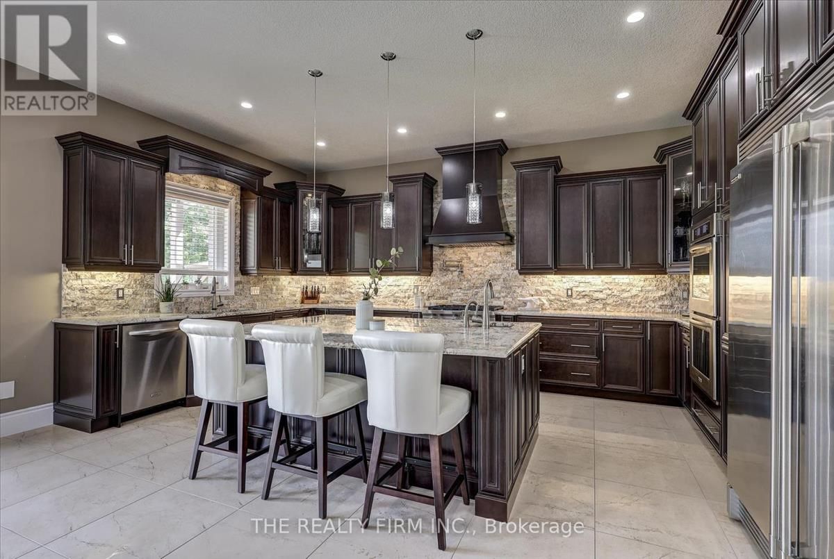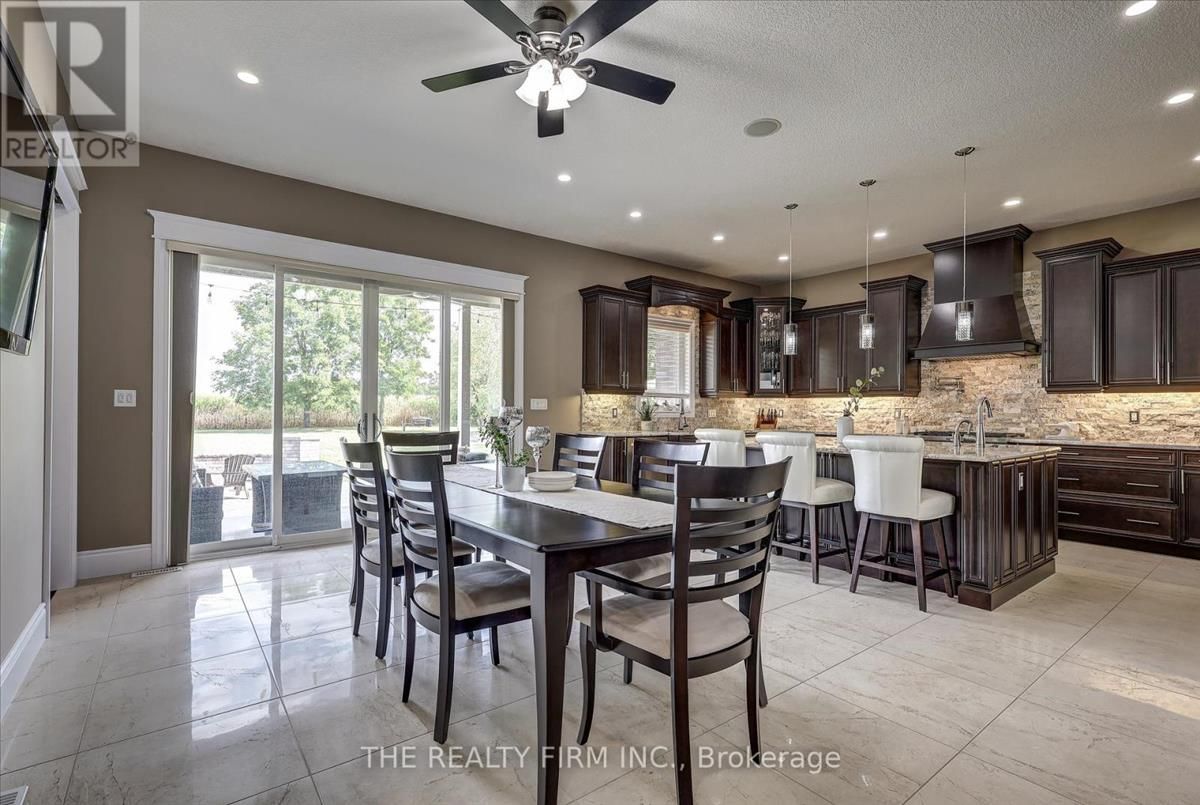Welcome to your sanctuary of refined rural living at 22060 Nissouri Rd. Thorndale On. A breathtaking estate nestled on 1.33 acres spanning over 5,000 sq ft with exquisitely finished space. This majestic home features 4 + 1 bedrooms and 3.5 baths, crafted with thoughtful design and premium craftsmanship at every turn. Step through the stately entry into a 12' coffered-ceiling foyer with poplar custom trim flowing seamlessly into the family room with its soaring 13 vaulted ceiling and commanding floor-to-ceiling plaster gas fireplace. The kitchen, dazzles with maple cabinetry, a massive island with sink with reverse osmosis, a 6 burner gas stove, double wall ovens and luxe finishes like a travertine backsplash, Brizo faucets and Electrolux ICON fridge/freezer. The main level boasts 10 ceilings, 8 doors, hand scraped oak floors, Italian porcelain tile, granite throughout and an ambient speaker system all complemented by Hunter Douglas window treatments. A convenient main-floor laundry and custom drop zone add to daily ease. The lower level inspires with a stylish wet bar, wine fridge, additional bedroom, full bath, quartz and dual electric fireplaces, oak staircase, spray-foam insulation, separate garage access and a cold room. This property is ideal for multigenerational living with the separate lower level entrance, full amenities and expansive layout. Outside experience meticulously curated 360 landscaping and lighting, stamped concrete walkways and patios, a covered 10' x 25' patio with speakers, insulated attic & 2 extra circuits for a future sunroom addition. Completing the yard is a gas fire pit, a 20' x 22' shed with hydro, gazebo, backyard hydrant and a triple garage with an extra bay door to the back. Thorndale offers tranquility and vibrant community living with playgrounds, splash pad, skate park, sports courts and community gardens. A short drive to Londons premier shopping, business district & airport. The perfect blend of rural and urban charm (id:26457)