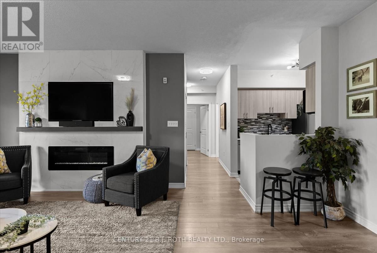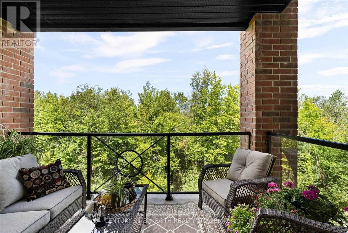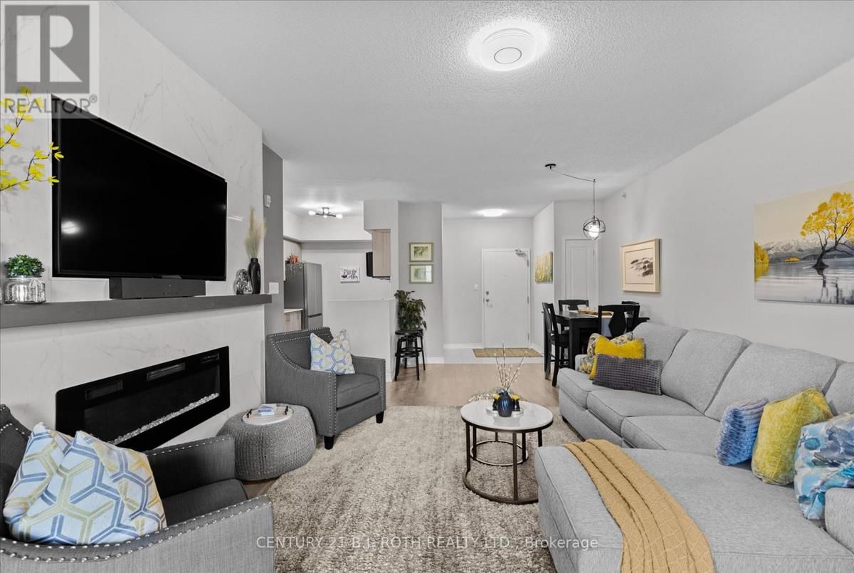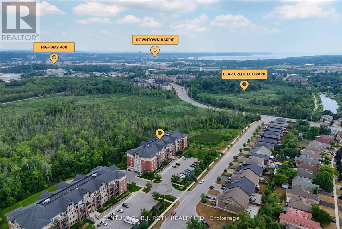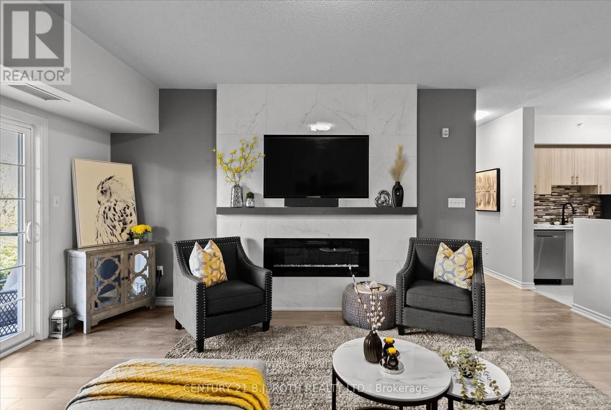 Embrace treetop serenity in one of Barrie's most picturesque communities. Set within the Ardagh Bluffs and wrapped by the natural beauty of Bear Creek Eco-Park, Greenwich Village is prized for its calm setting, walkable green space, and well-kept buildings. Suite 304 delivers that coveted "bungalow feel without the maintenance" and a rare, unobstructed eco-park view from every window and the oversized covered balcony, and yes, barbecues are permitted! Offering approximately 1,101 sq. ft., this bright, open-concept layout features two generous bedrooms, two full baths, and a seamless living/dining space that extends outdoors for effortless entertaining. Thoughtful interior upgrades include 9' ceilings that enhance the airy feel, high-end laminate flooring throughout, a custom built fireplace feature wall, and a well-appointed kitchen with modern slab-style cabinetry, Quartz counters, tile backsplash, under-mount double sink, stainless steel appliances (waterline to fridge), and upgraded plumbing fixtures. A compact water softener and in-suite laundry adds day-to-day comfort. The light, neutral bathrooms keep the palette fresh and timeless. Your private primary retreat offers a large walk-in closet and spacious ensuite. The second bedroom is ideal for guests, family, or a dedicated home office with a view. 1 Surface parking and 1 Underground parking with storage locker are included, practical must-haves for year-round living. Being on the third floor positions you level with the canopy, creating a peaceful, elevated outlook that changes beautifully with the seasons. Suite 304 is a hidden gem in one of Barrie's most desirable low-maintenance communities. (id:26457)