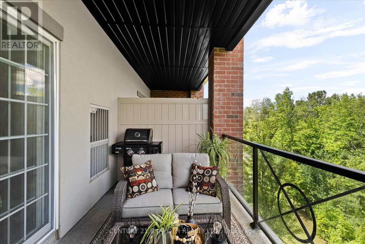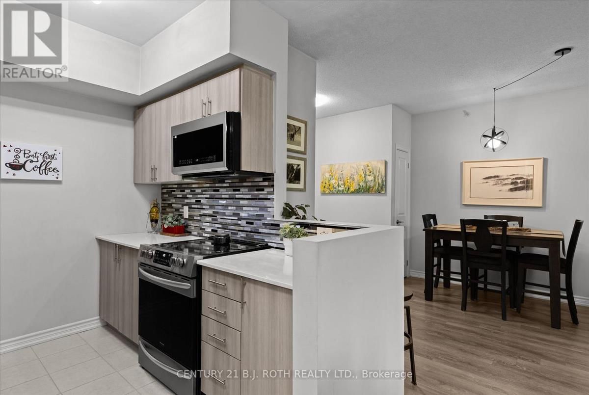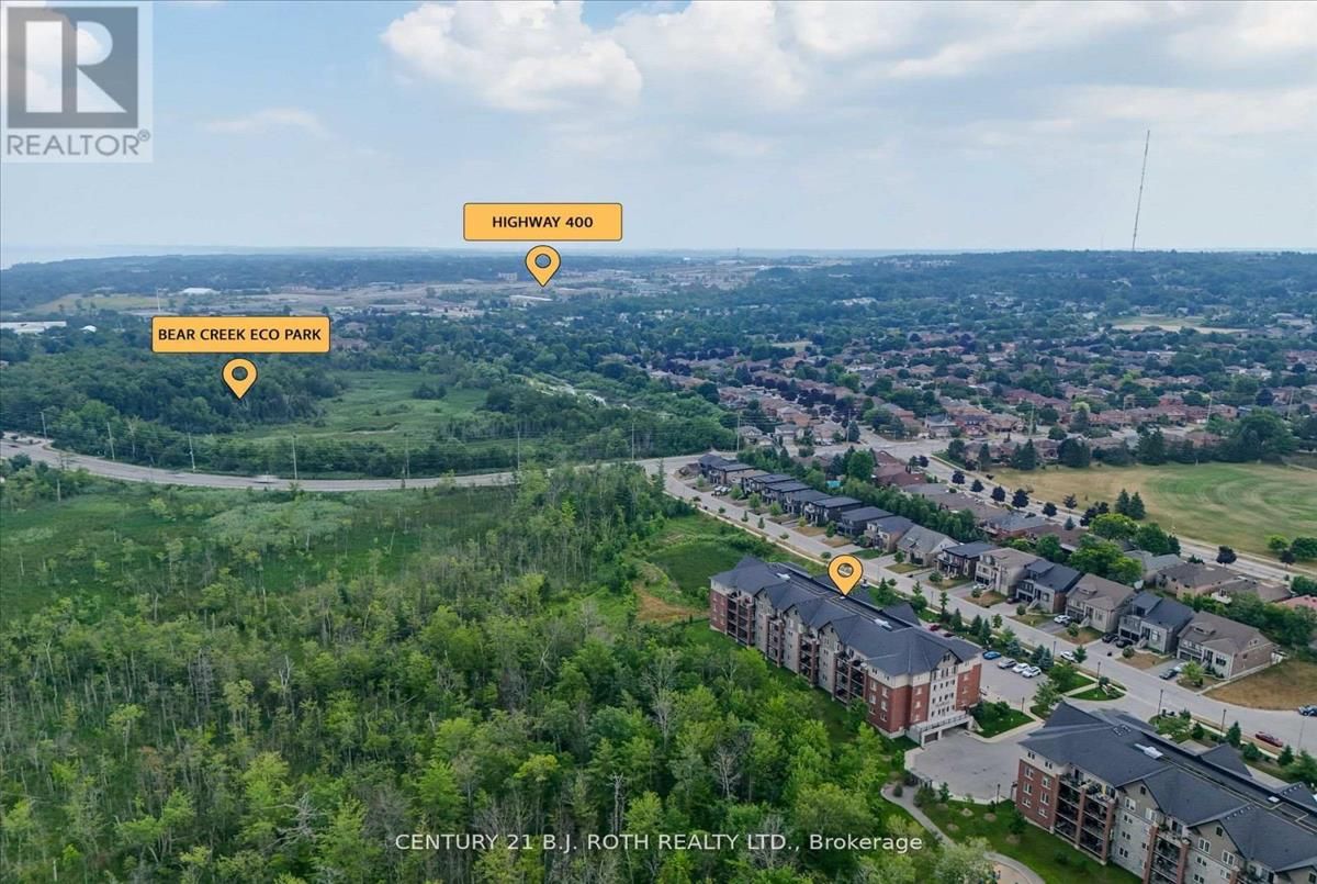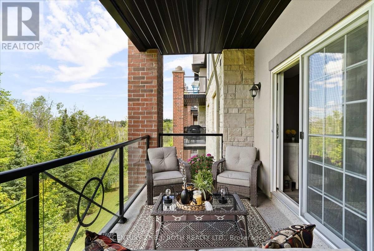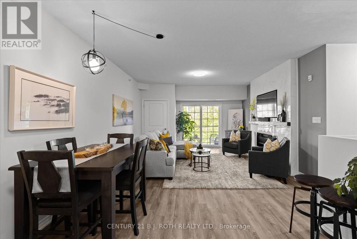 Embrace treetop serenity in one of Barrie's most picturesque communities. Set within the Ardagh Bluffs and wrapped by the natural beauty of Bear Creek Eco-Park, Greenwich Village is prized for its calm setting, walkable green space, and well-kept buildings. Suite 304 delivers that coveted "bungalow feel without the maintenance" and a rare, unobstructed eco-park view from every window and the oversized covered balcony, and yes, barbecues are permitted! Offering approximately 1,101 sq. ft., this bright, open-concept layout features two generous bedrooms, two full baths, and a seamless living/dining space that extends outdoors for effortless entertaining. Thoughtful interior upgrades include 9' ceilings that enhance the airy feel, high-end laminate flooring throughout, a custom built fireplace feature wall, and a well-appointed kitchen with modern slab-style cabinetry, Quartz counters, tile backsplash, under-mount double sink, stainless steel appliances (waterline to fridge), and upgraded plumbing fixtures. A compact water softener and in-suite laundry adds day-to-day comfort. The light, neutral bathrooms keep the palette fresh and timeless. Your private primary retreat offers a large walk-in closet and spacious ensuite. The second bedroom is ideal for guests, family, or a dedicated home office with a view. 1 Surface parking and 1 Underground parking with storage locker are included, practical must-haves for year-round living. Being on the third floor positions you level with the canopy, creating a peaceful, elevated outlook that changes beautifully with the seasons. Suite 304 is a hidden gem in one of Barrie's most desirable low-maintenance communities. (id:26457)
