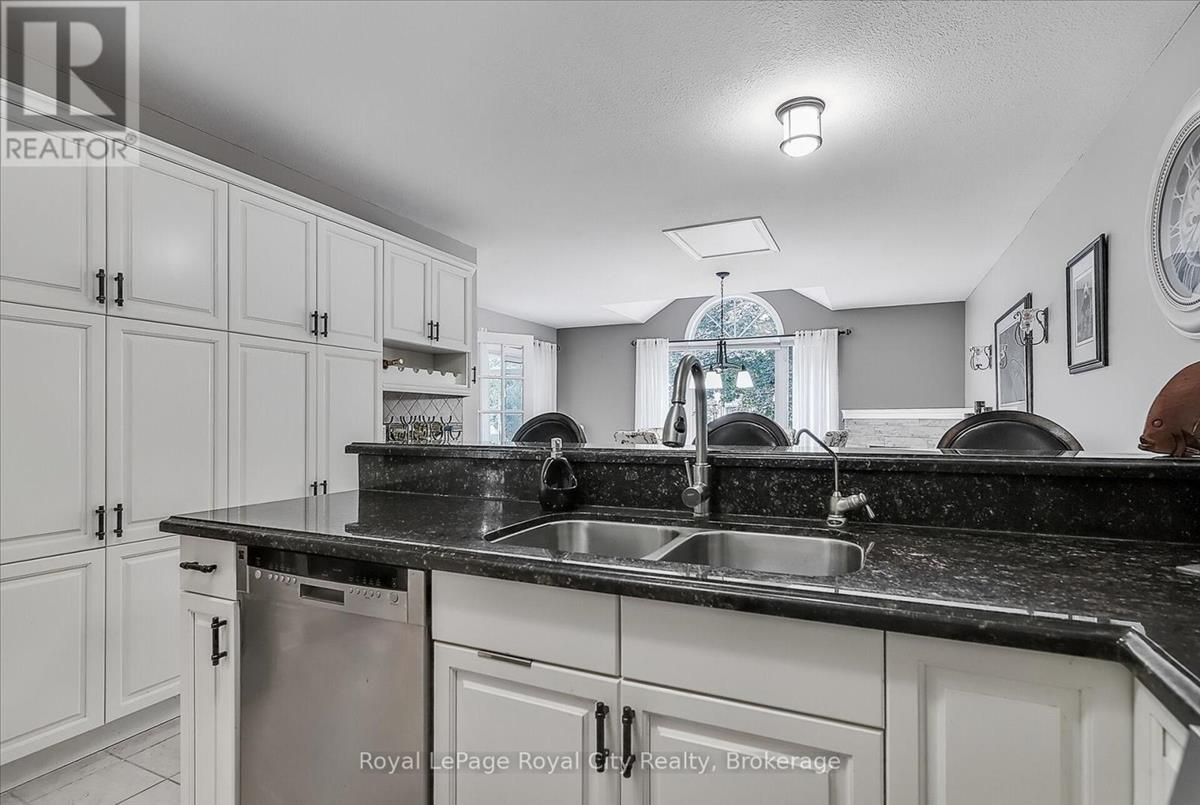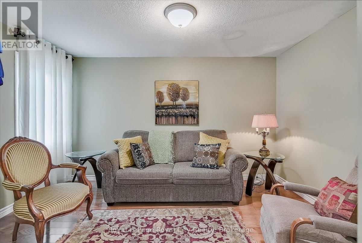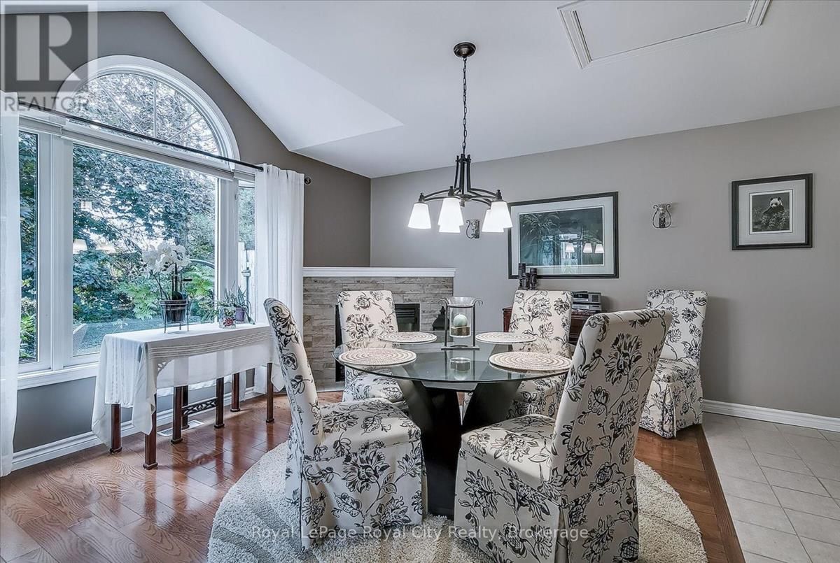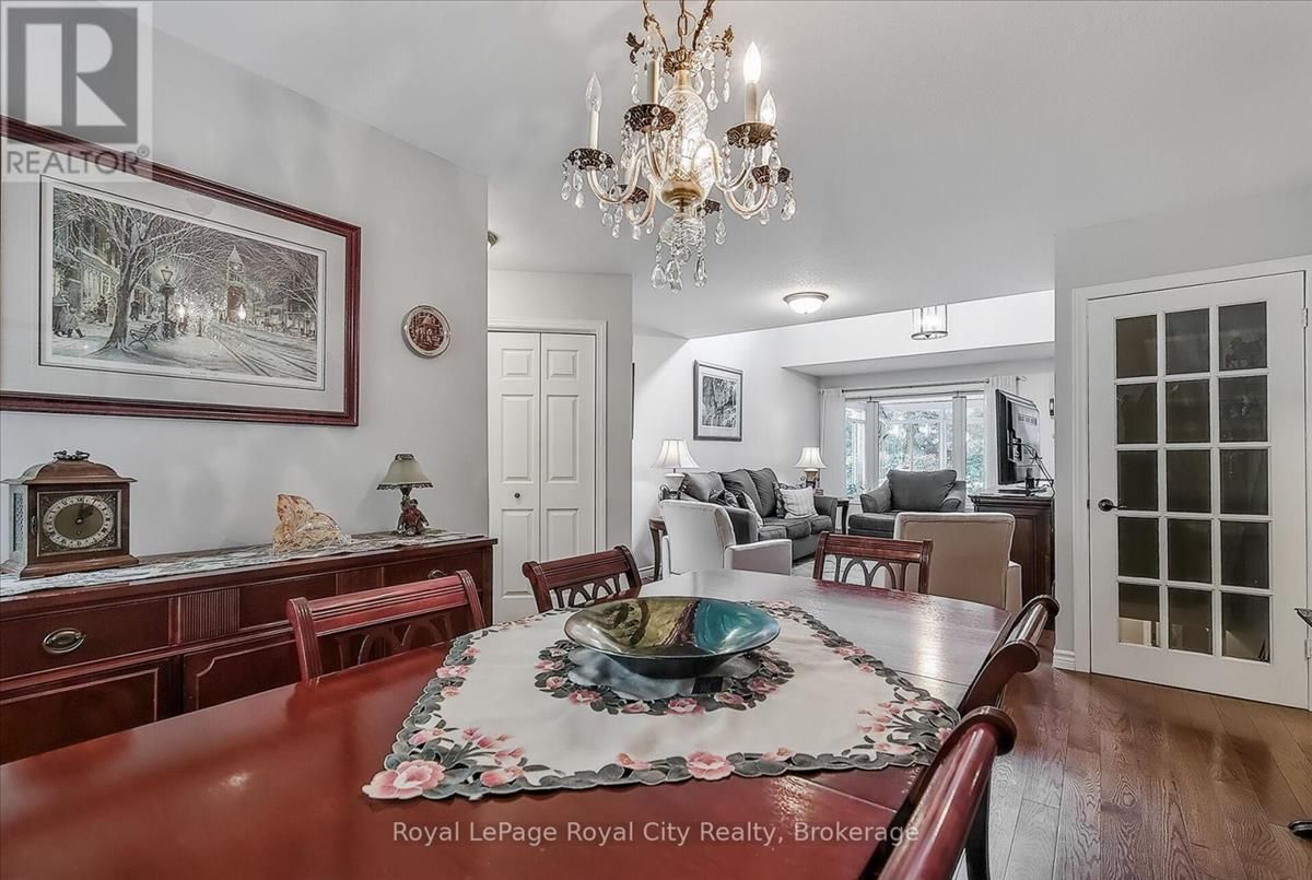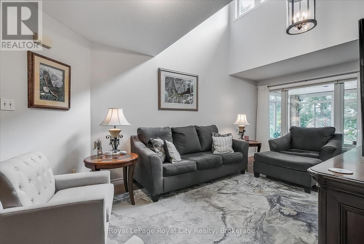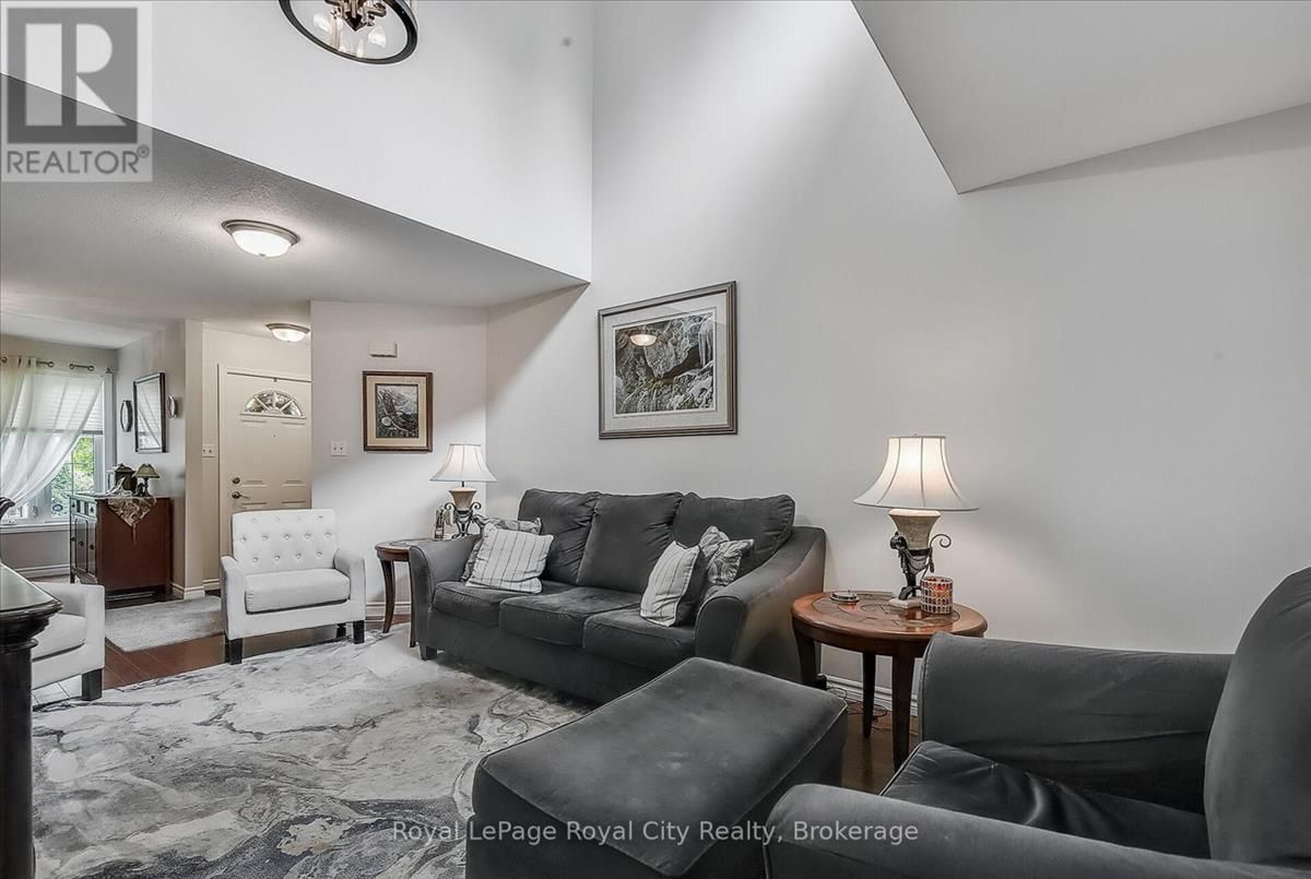 Welcome to The Cottages, a friendly, private, highly desirable enclave that has become a favourite for many. Location is everything, and this home offers the perfect blend of convenience and comfort, just minutes from all the amenities Guelphs south end has to offer. Pride of ownership shines throughout this spacious three-bedroom plus den, 3.5-bathroom home. The bright and inviting living room welcomes you with soaring ceilings, while the updated kitchen features granite countertops, a stylish renovation, and overlooks a warm and cozy family room complete with fireplace. A bonus 3 season sunroom is a great place to start your morning coffee or wind down with a good book at the end of the day. The primary suite is a true retreat, boasting a completely updated ensuite with a fabulous walk-in glass shower. Solid oak hardwood flooring has been added to both the main and upper levels, giving the home a timeless, elegant feel. Freshly painted and move-in ready, every detail has been carefully maintained. Additional highlights include: Main floor laundry; Two-car garage; Fully finished basement with family room, bedroom, three-piece bath, and generous storage; New granite countertops in both kitchen and baths; Low condo fees that cover everything from the drywall out; Plenty of visitor parking. With its thoughtful updates, inviting layout, and unbeatable location, this home offers the low-maintenance lifestyle you've been waiting for without compromise. (id:26457)