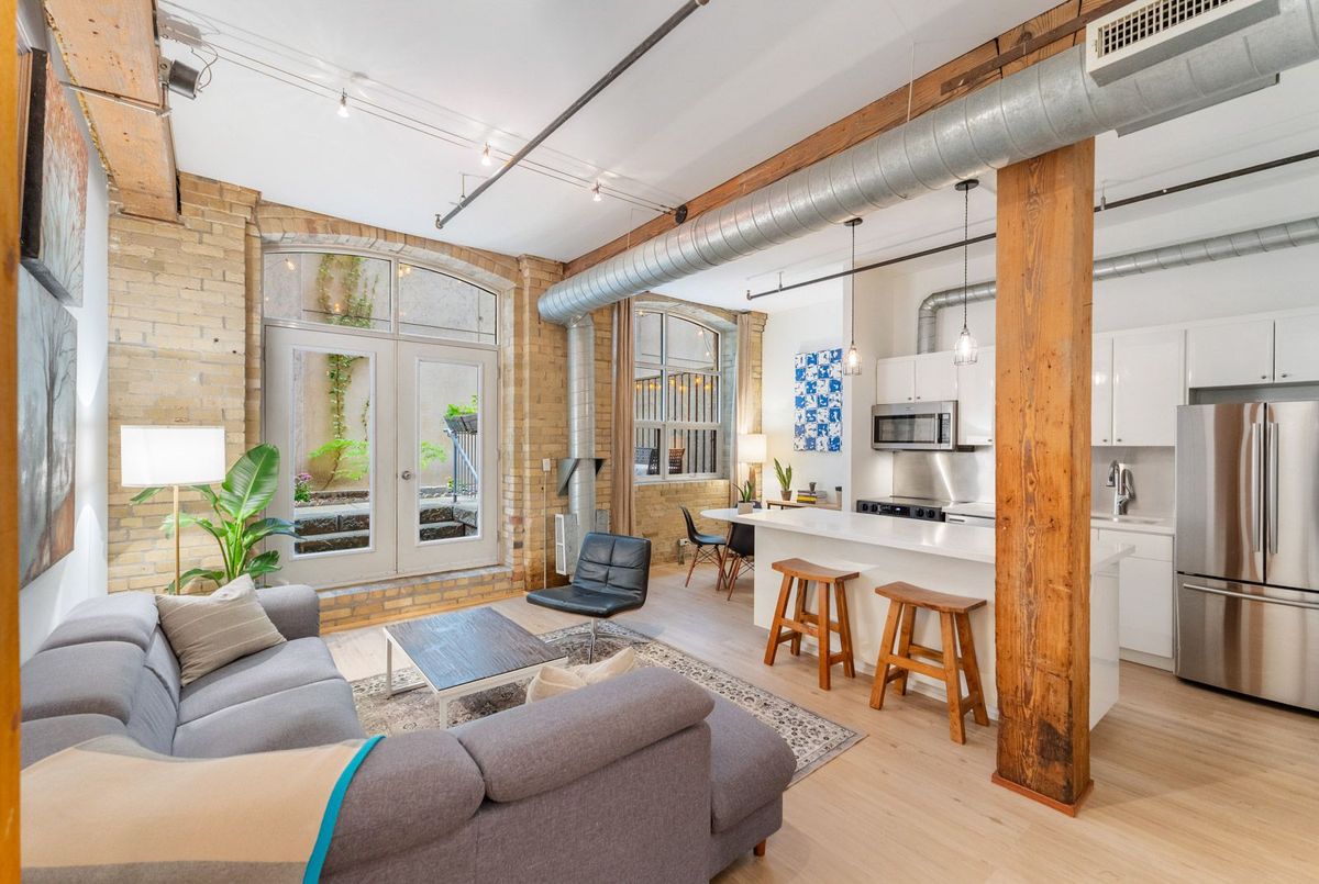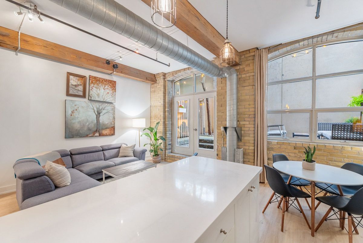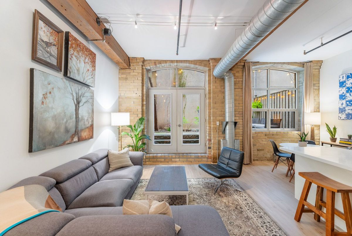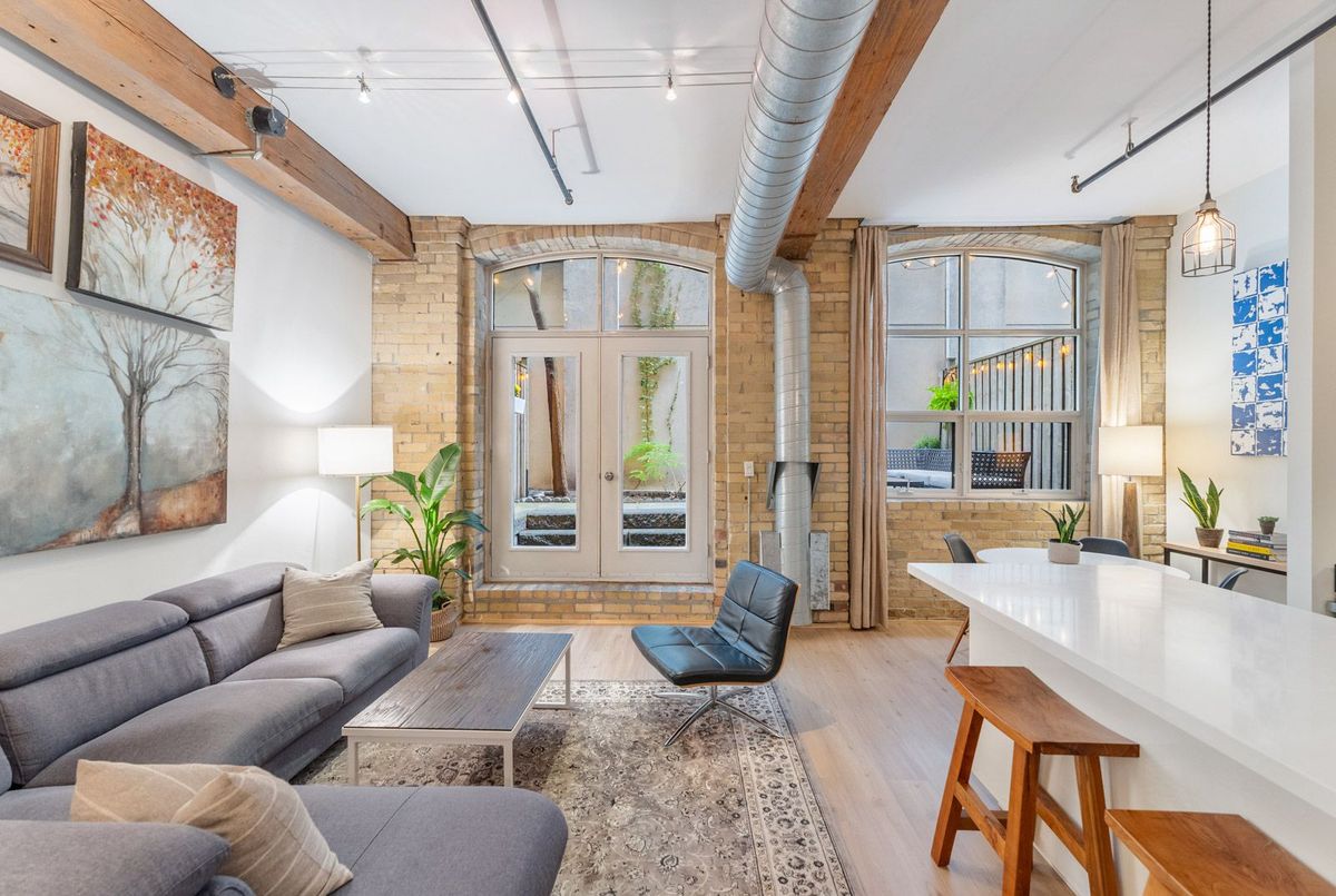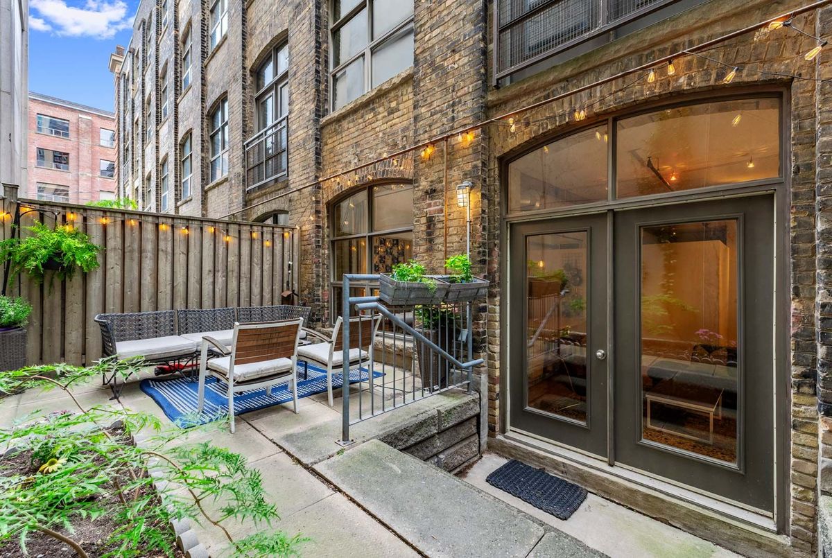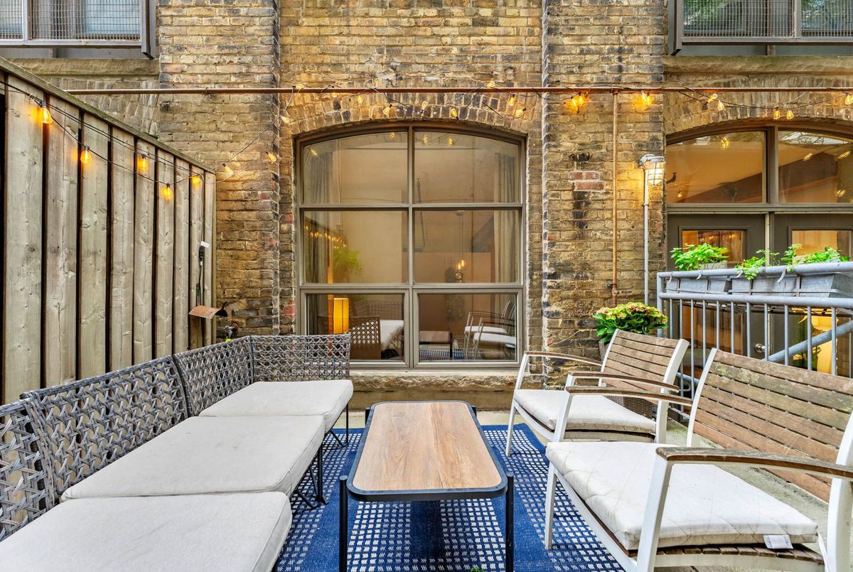 Authentic hard loft with private terrace in the heart of downtown Toronto. Welcome to the iconic Liberty Lofts at 383 Adelaide Street East, where character and modern convenience meet. This rare one-bedroom main-floor hard loft offers soaring 11-foot ceilings, exposed brick and beams, oversized industrial windows, exposed ducts, and all the charm that comes with true loft living. The open concept layout is bright and versatile, blending historic details with contemporary finishes. The kitchen is designed for both style and function, flowing seamlessly into the spacious living and dining areas. The bedroom is tucked away for privacy while maintaining the loft's airy feel. Step outside onto your private terrace, perfect for a morning coffee, entertaining, or simply unwinding at the end of the day. Get your BBQ on! This loft offers an ultra-rare gas line for you to cook up a storm on the terrace. Located in a boutique building rich with history, you're surrounded by vibrant neighbourhoods including St. Lawrence Market, Distillery District, Design District and Corktown. Cafés, restaurants, shops, and transit are all just steps from your door. A perfect blend of heritage and modern living, this loft is ideal for those seeking something truly unique in downtown Toronto. Don't miss this opportunity; they don't come up often.