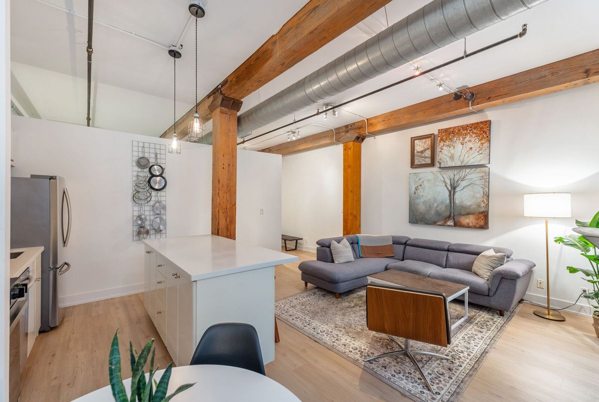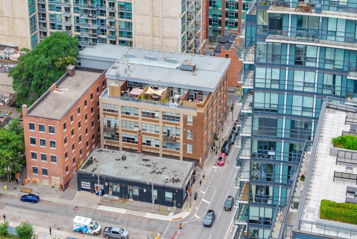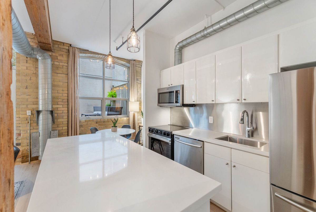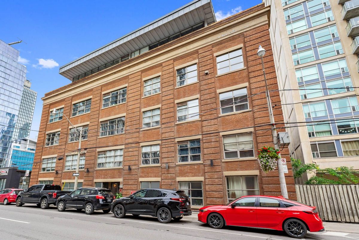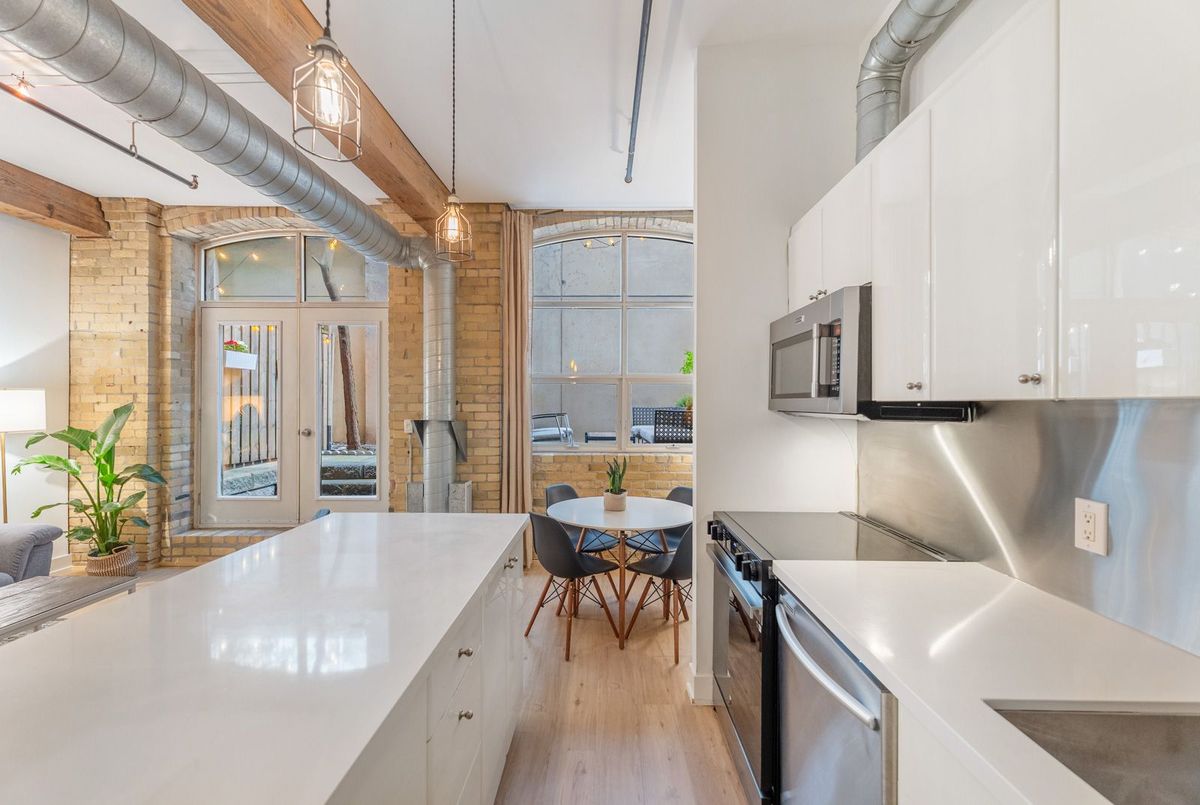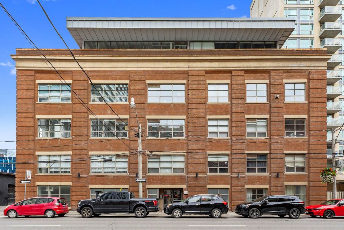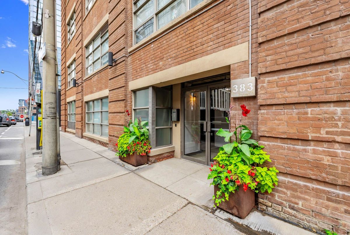 Authentic hard loft with private terrace in the heart of downtown Toronto. Welcome to the iconic Liberty Lofts at 383 Adelaide Street East, where character and modern convenience meet. This rare one-bedroom main-floor hard loft offers soaring 11-foot ceilings, exposed brick and beams, oversized industrial windows, exposed ducts, and all the charm that comes with true loft living. The open concept layout is bright and versatile, blending historic details with contemporary finishes. The kitchen is designed for both style and function, flowing seamlessly into the spacious living and dining areas. The bedroom is tucked away for privacy while maintaining the loft's airy feel. Step outside onto your private terrace, perfect for a morning coffee, entertaining, or simply unwinding at the end of the day. Get your BBQ on! This loft offers an ultra-rare gas line for you to cook up a storm on the terrace. Located in a boutique building rich with history, you're surrounded by vibrant neighbourhoods including St. Lawrence Market, Distillery District, Design District and Corktown. Cafés, restaurants, shops, and transit are all just steps from your door. A perfect blend of heritage and modern living, this loft is ideal for those seeking something truly unique in downtown Toronto. Don't miss this opportunity; they don't come up often.
