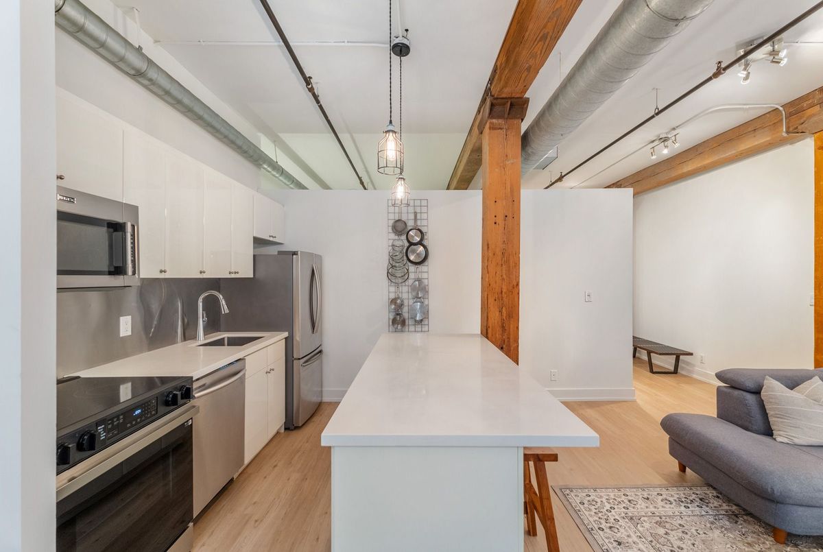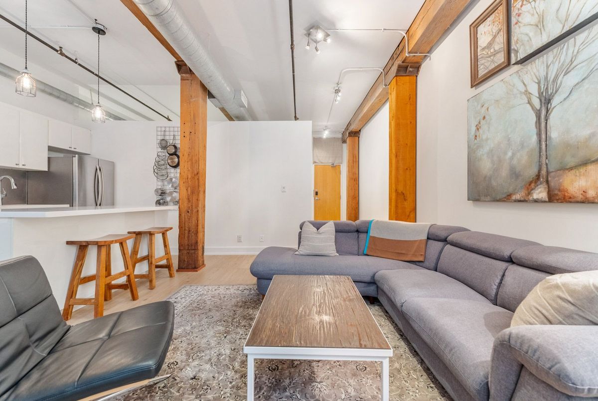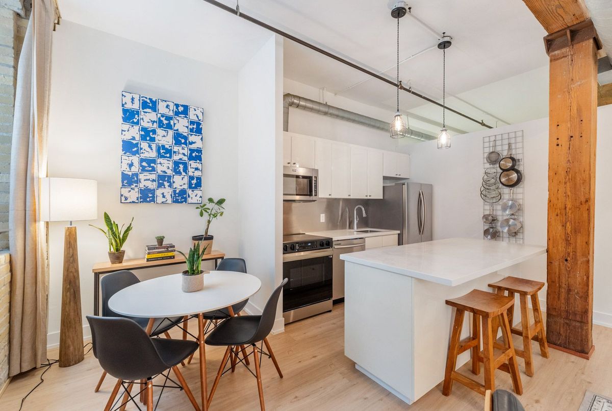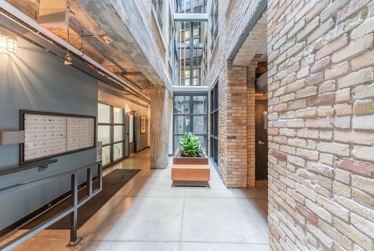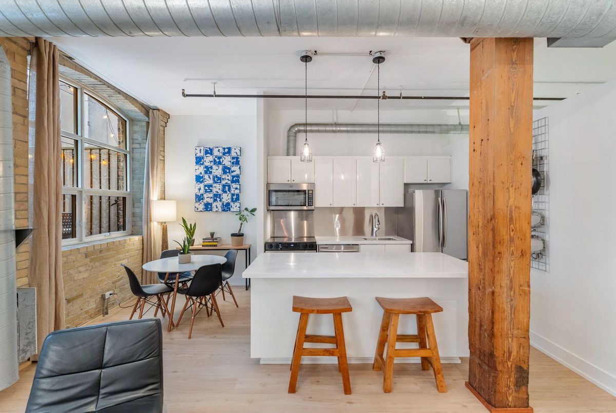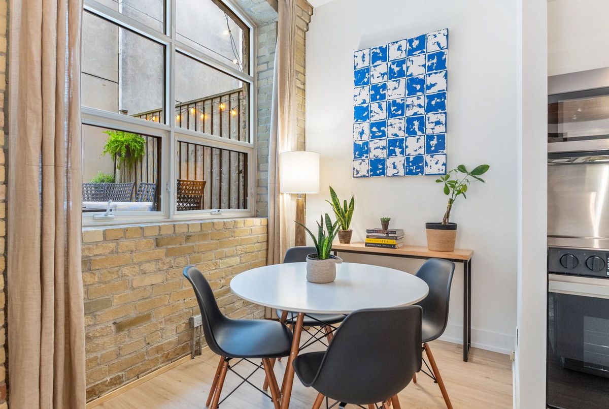 Authentic hard loft with private terrace in the heart of downtown Toronto. Welcome to the iconic Liberty Lofts at 383 Adelaide Street East, where character and modern convenience meet. This rare one-bedroom main-floor hard loft offers soaring 11-foot ceilings, exposed brick and beams, oversized industrial windows, exposed ducts, and all the charm that comes with true loft living. The open concept layout is bright and versatile, blending historic details with contemporary finishes. The kitchen is designed for both style and function, flowing seamlessly into the spacious living and dining areas. The bedroom is tucked away for privacy while maintaining the loft's airy feel. Step outside onto your private terrace, perfect for a morning coffee, entertaining, or simply unwinding at the end of the day. Get your BBQ on! This loft offers an ultra-rare gas line for you to cook up a storm on the terrace. Located in a boutique building rich with history, you're surrounded by vibrant neighbourhoods including St. Lawrence Market, Distillery District, Design District and Corktown. Cafés, restaurants, shops, and transit are all just steps from your door. A perfect blend of heritage and modern living, this loft is ideal for those seeking something truly unique in downtown Toronto. Don't miss this opportunity; they don't come up often.