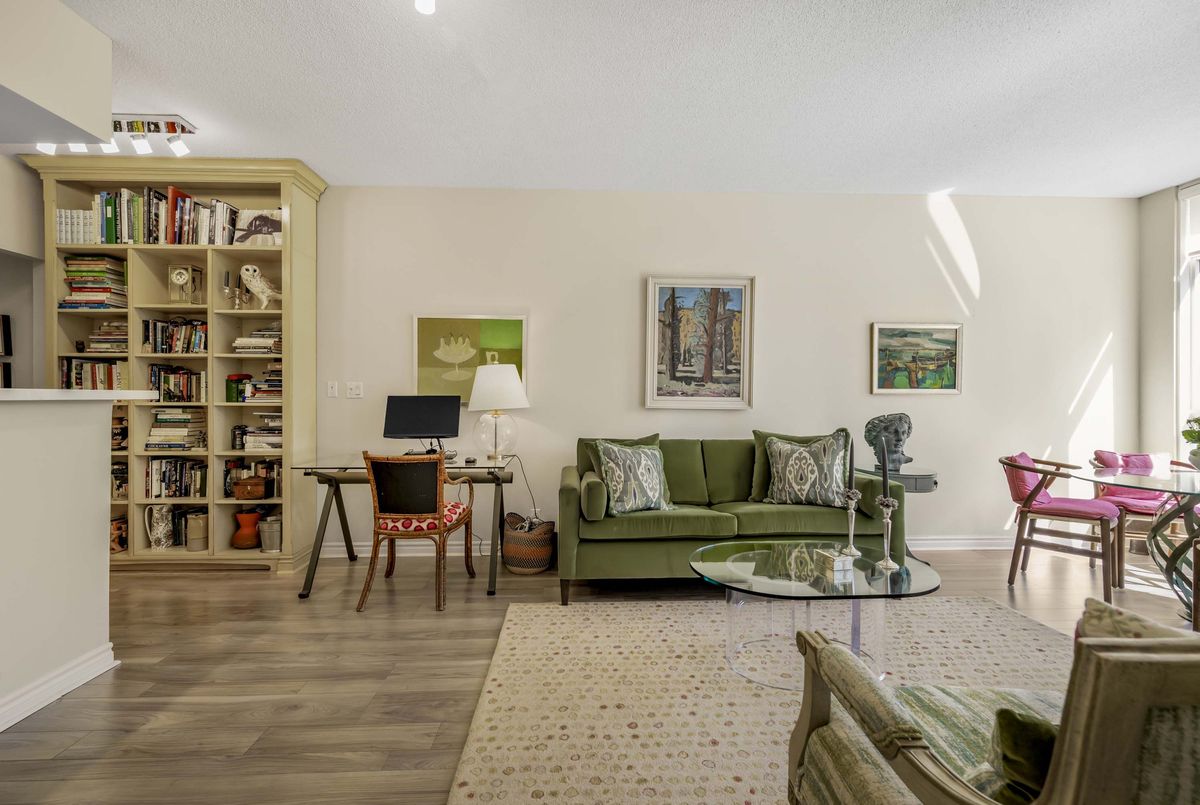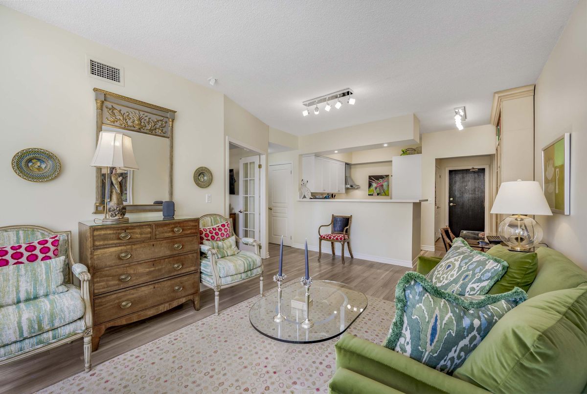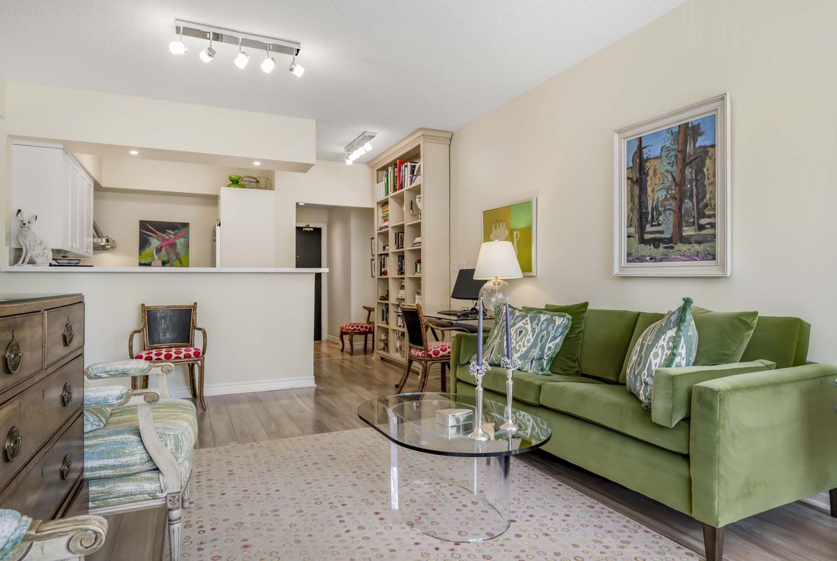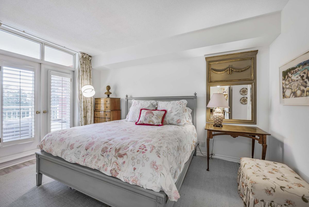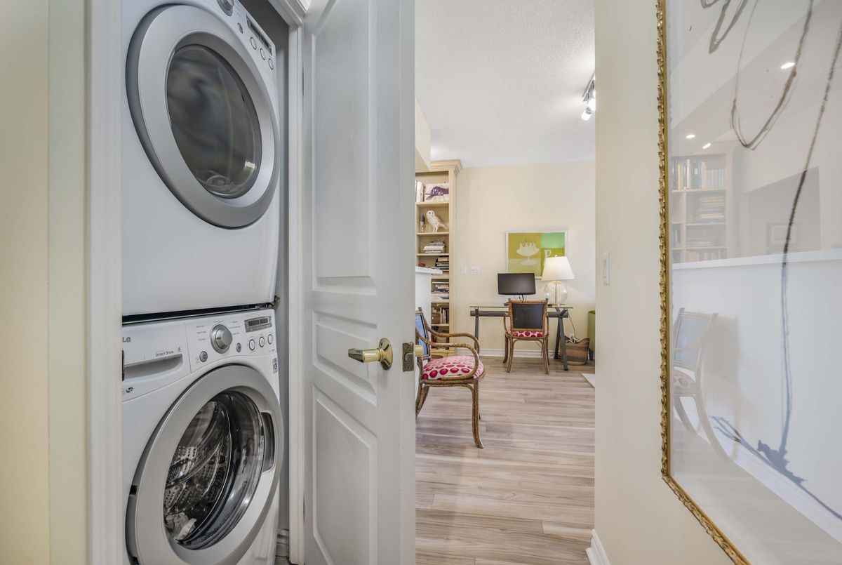 Welcome to Deer Park Residences at 1 Deer Park Crescent, an elegant boutique condominium in the heart of the Yonge and St. Clair district. This beautifully renovated suite offers approximately 887 sq.ft. of well designed living space with soaring 9 ft ceilings and treed south views. The bright open concept living and dining area features laminate flooring and a walkout to a private full width balcony, perfect for enjoying iconic views along St. Clair Avenue West. A modern kitchen is fitted with quartz counters, stainless steel appliances, and an airy open layout ideal for both cooking and entertaining.The primary bedroom includes a walk in closet, a four piece ensuite, and direct balcony access, creating a private retreat with plenty of natural light. A versatile den/second bedroom with French doors offers the flexibility of a guest room, office, or den. Additional conveniences include a two piece powder room, and ensuite laundry. One underground parking space with two bike racks and an exclusive use locker are included. Residents enjoy security desk (Mon-Fri 9am-5pm/Wknds 10am-4pm), an exercise room, and a stylish party room. Located in one of Toronto's most desirable neighbourhoods, this suite is just minutes to Yonge Street premier shops, fine dining, and everyday conveniences. The TTC is at your doorstep and Rosehill Reservoir, one of the city's lushest green spaces, is only moments away.