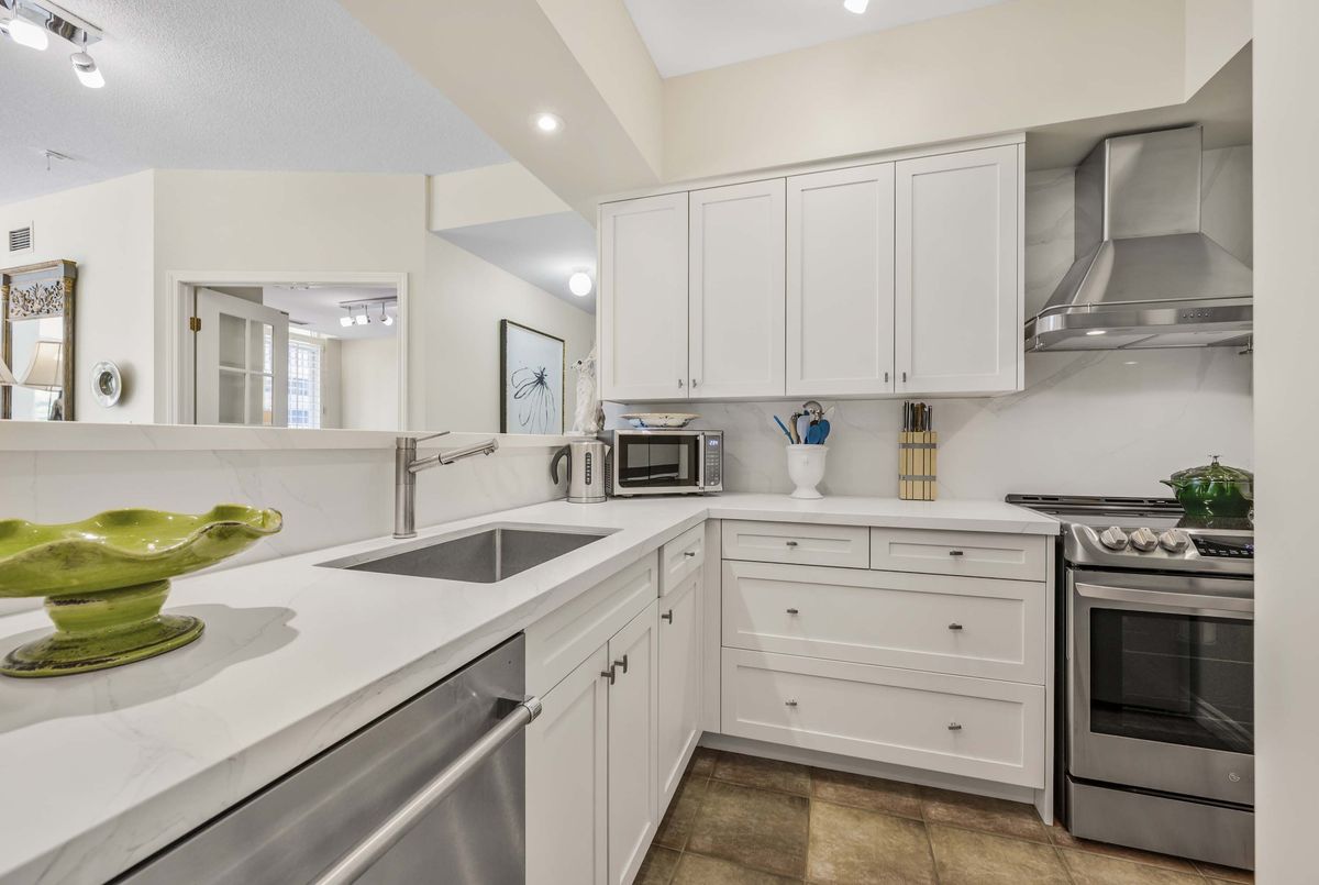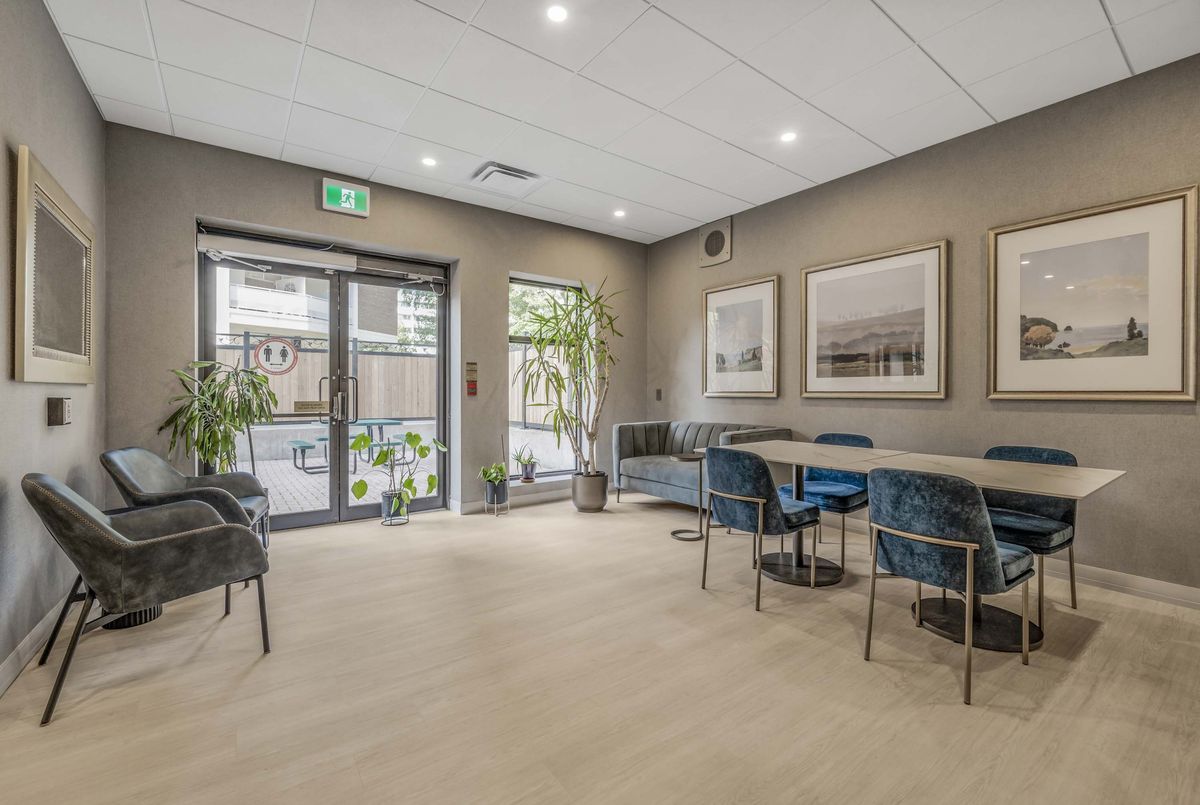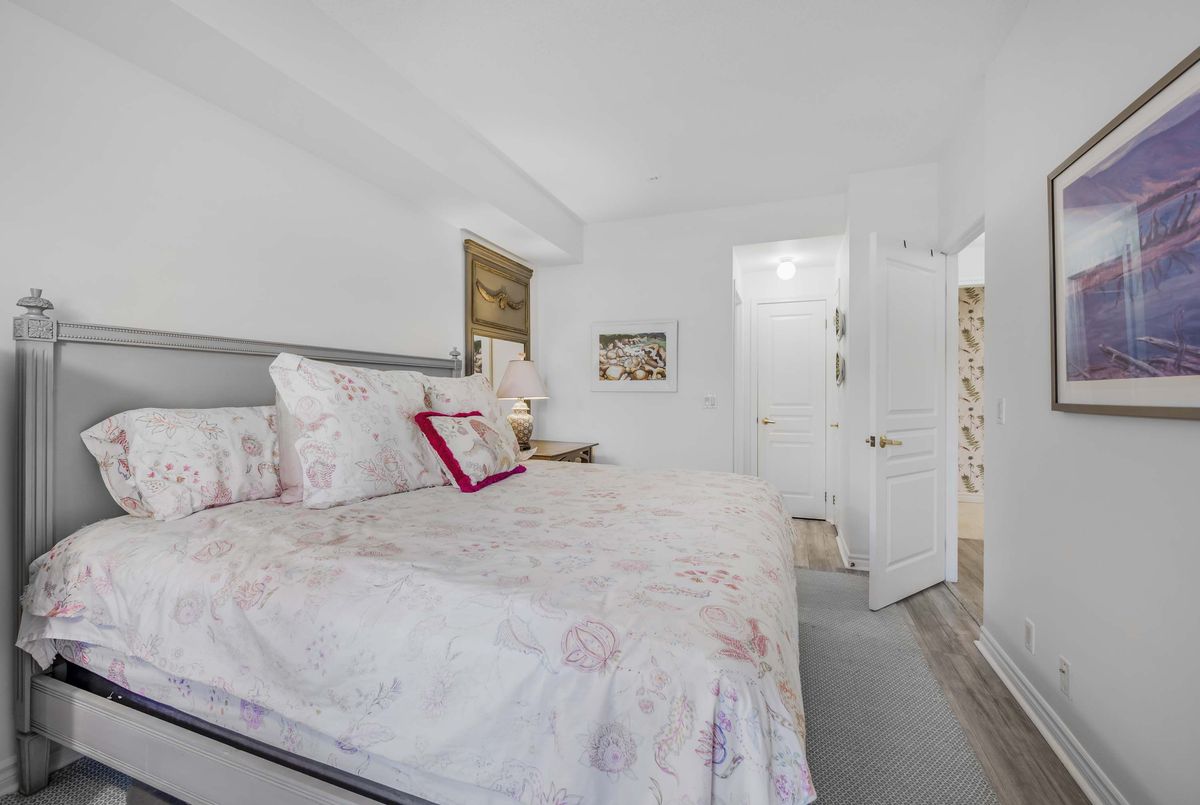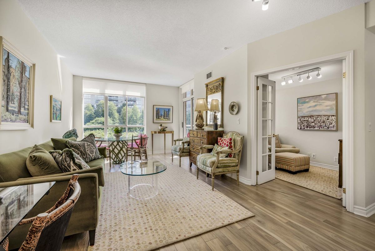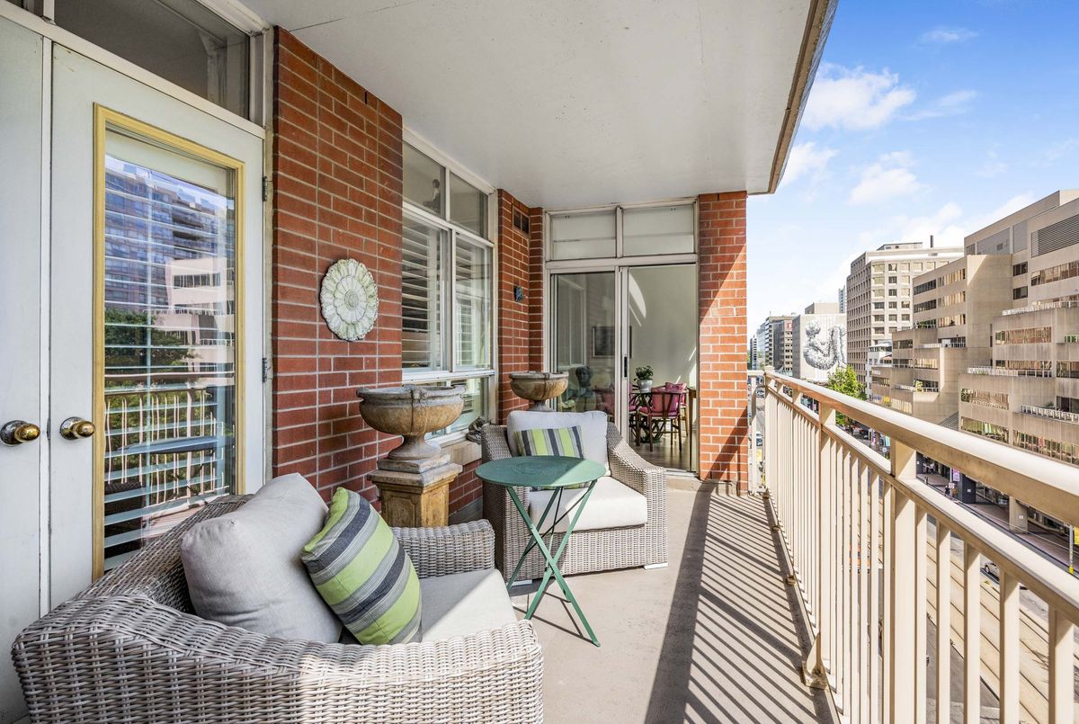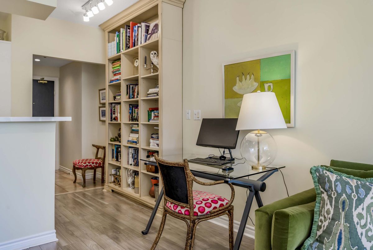Welcome to Deer Park Residences at 1 Deer Park Crescent, an elegant boutique condominium in the heart of the Yonge and St. Clair district. This beautifully renovated suite offers approximately 887 sq.ft. of well designed living space with soaring 9 ft ceilings and treed south views. The bright open concept living and dining area features laminate flooring and a walkout to a private full width balcony, perfect for enjoying iconic views along St. Clair Avenue West. A modern kitchen is fitted with quartz counters, stainless steel appliances, and an airy open layout ideal for both cooking and entertaining.The primary bedroom includes a walk in closet, a four piece ensuite, and direct balcony access, creating a private retreat with plenty of natural light. A versatile den/second bedroom with French doors offers the flexibility of a guest room, office, or den. Additional conveniences include a two piece powder room, and ensuite laundry. One underground parking space with two bike racks and an exclusive use locker are included. Residents enjoy security desk (Mon-Fri 9am-5pm/Wknds 10am-4pm), an exercise room, and a stylish party room. Located in one of Toronto's most desirable neighbourhoods, this suite is just minutes to Yonge Street premier shops, fine dining, and everyday conveniences. The TTC is at your doorstep and Rosehill Reservoir, one of the city's lushest green spaces, is only moments away.