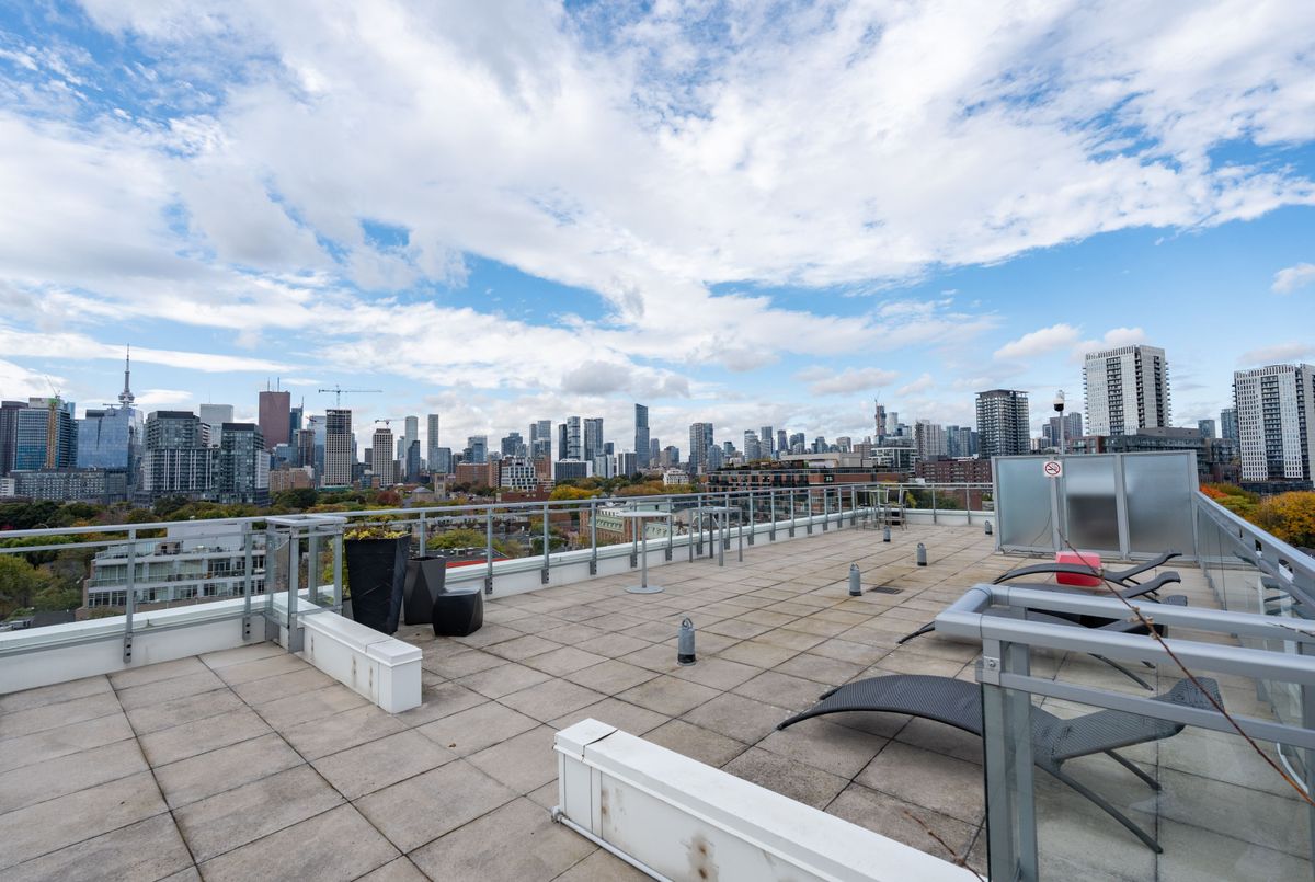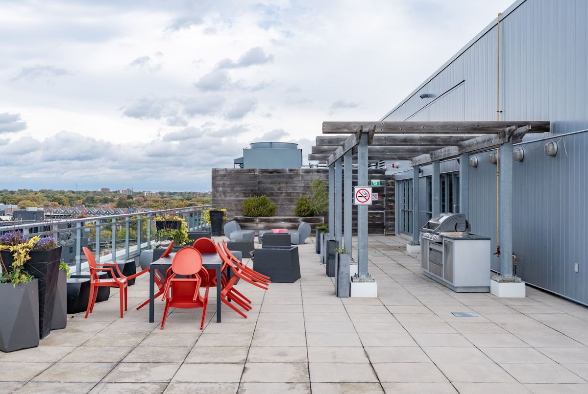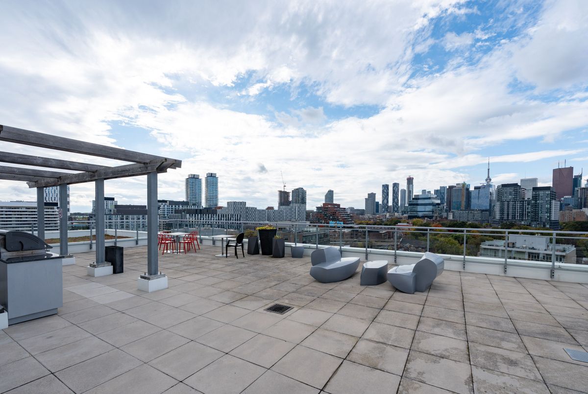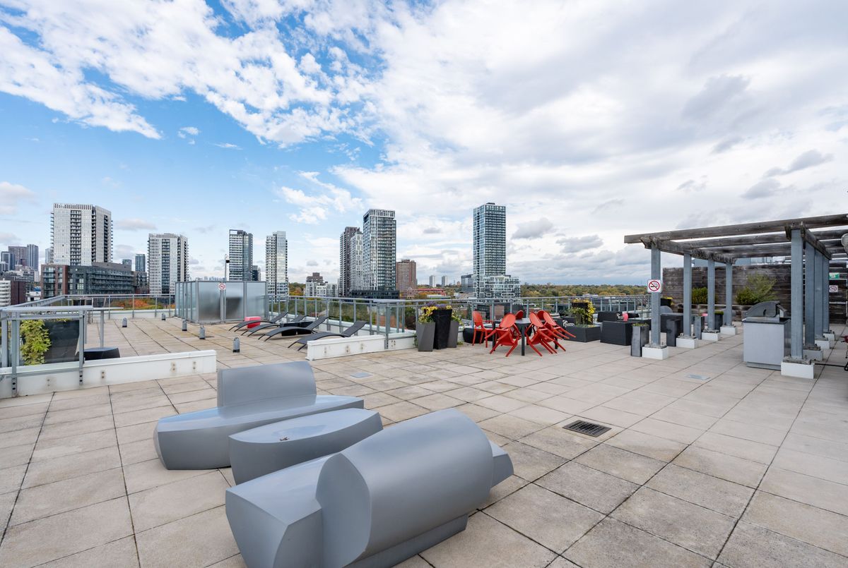 Discover a beautifully curated urban retreat where contemporary design meets timeless style. This expansive one-bedroom loft showcases soaring ceilings, a thoughtfully designed open-concept layout, and a spacious private den ideal for a home office or studio. The sleek, modern kitchen is finished in crisp white with refined stone countertops, a designer backsplash, and premium stainless steel appliances - the perfect setting for entertaining or quiet evenings in. The large primary bedroom features floor-to-ceiling windows that flood the space with natural light and a custom closet organizer offering both elegance and function. A spa-inspired bathroom with a deep soaker tub offers a serene escape, while the tranquil 124 sq ft terrace extends your living space outdoors - ideal for morning coffee, an evening glass of wine or BBQing as it comes with your own gas hook-up. Polished concrete floors add a touch of urban elegance throughout. Storage locker on the same floor for extra convenience. Residents enjoy exceptional amenities including a rooftop terrace, fitness studio, media and party lounges, concierge service, and visitor parking. Located moments from Leslieville, the Distillery District, and vibrant local cafés and shops. An inspired blend of sophistication and downtown ease.