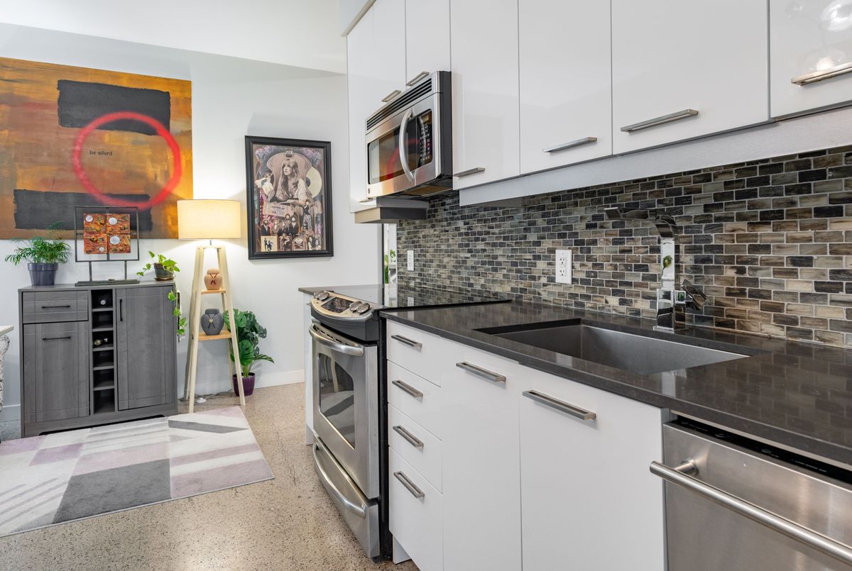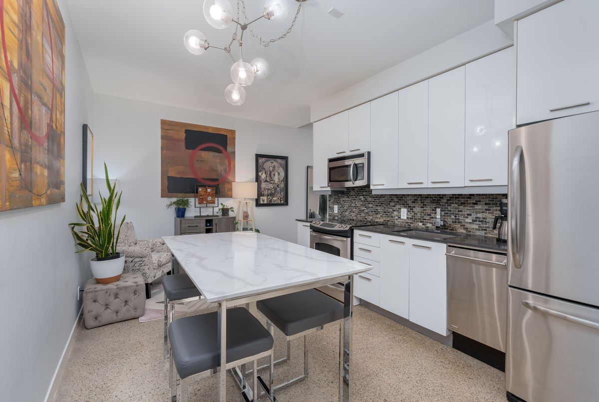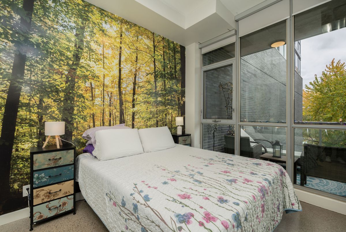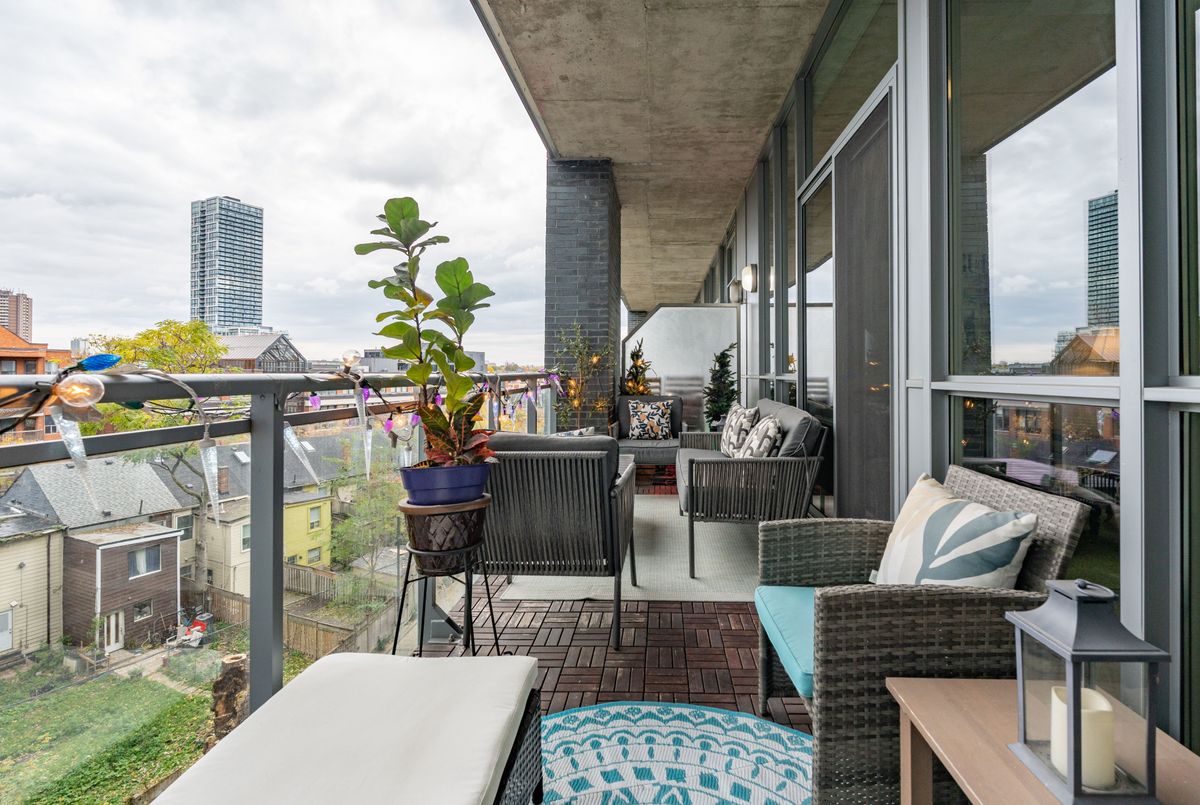 Discover a beautifully curated urban retreat where contemporary design meets timeless style. This expansive one-bedroom loft showcases soaring ceilings, a thoughtfully designed open-concept layout, and a spacious private den ideal for a home office or studio. The sleek, modern kitchen is finished in crisp white with refined stone countertops, a designer backsplash, and premium stainless steel appliances - the perfect setting for entertaining or quiet evenings in. The large primary bedroom features floor-to-ceiling windows that flood the space with natural light and a custom closet organizer offering both elegance and function. A spa-inspired bathroom with a deep soaker tub offers a serene escape, while the tranquil 124 sq ft terrace extends your living space outdoors - ideal for morning coffee, an evening glass of wine or BBQing as it comes with your own gas hook-up. Polished concrete floors add a touch of urban elegance throughout. Storage locker on the same floor for extra convenience. Residents enjoy exceptional amenities including a rooftop terrace, fitness studio, media and party lounges, concierge service, and visitor parking. Located moments from Leslieville, the Distillery District, and vibrant local cafés and shops. An inspired blend of sophistication and downtown ease.