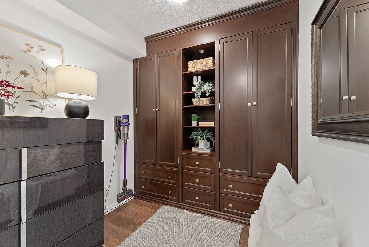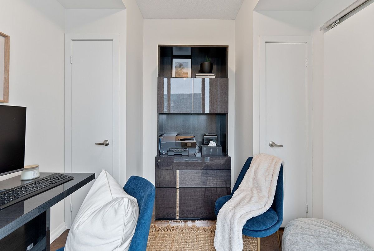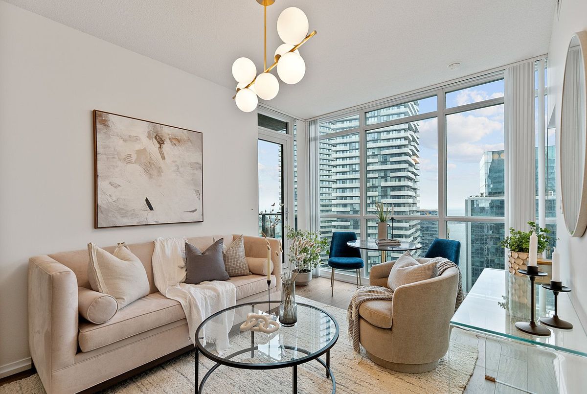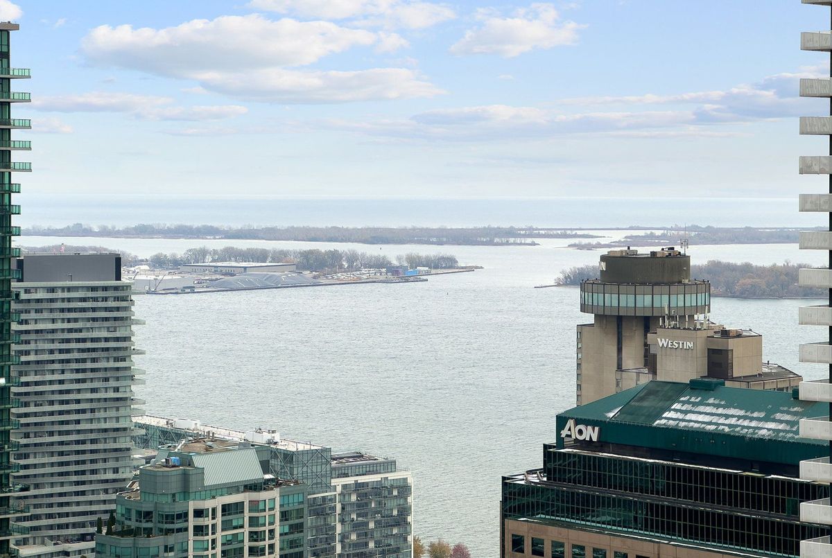 Welcome to suite 4301. Enter into the foyer with front hall closet space. Overlooking the modern kitchen with stainless steel appliances, generous cabinetry, and a breakfast bar overlooking the open-concept living/dining area. Floor-to-ceiling windows fill the space with natural light including a walkout to the balcony with gorgeous city views.The split-bedroom layout provides added privacy, with the primary suite featuring additional closet space and a 4pc ensuite. The second bedroom includes his-and-hers closets and a sliding door for flexibility and light. A separate den offers a versatile space for a home office or extra storage, all serviced by an additional 3pc bath. Steps to the Harbourfront, Financial District, dining, nightlife, and transit. Building amenities include two pools, a gym, theatre, party room, and 24-hour concierge.