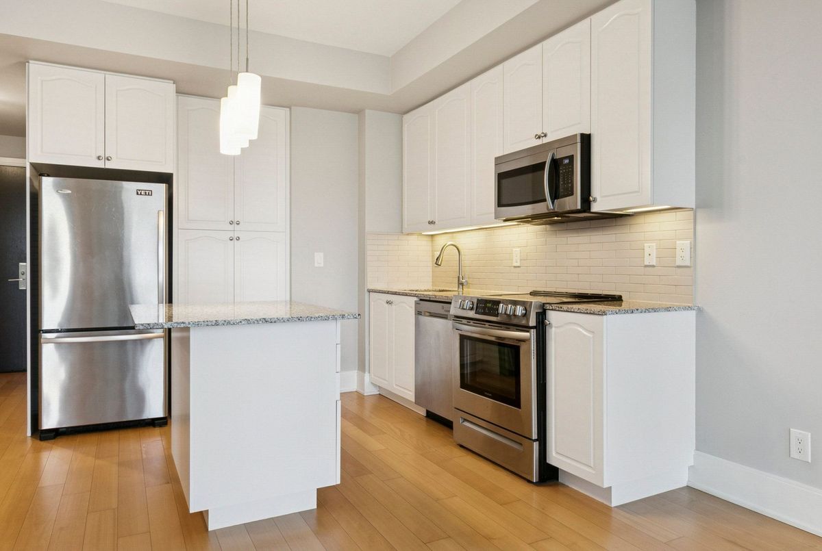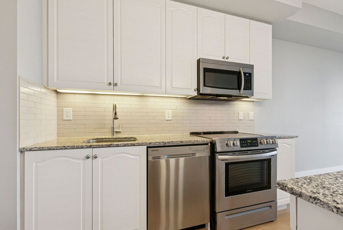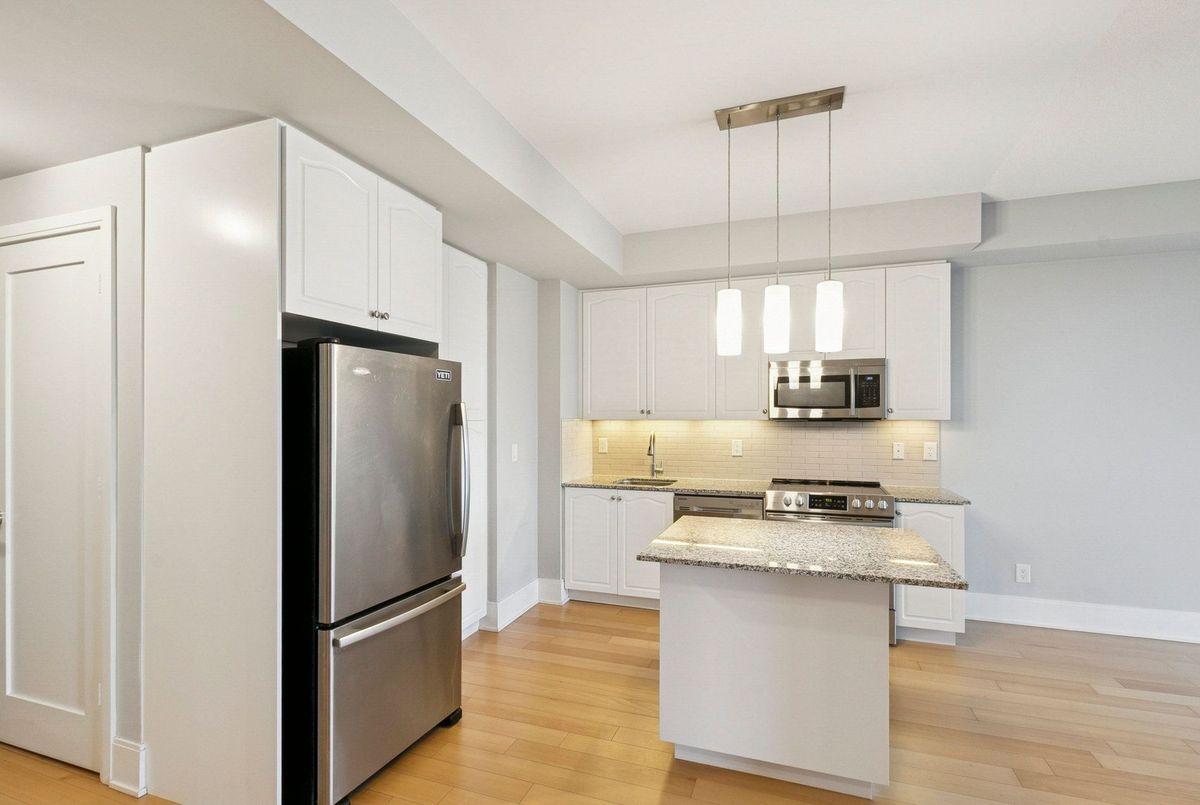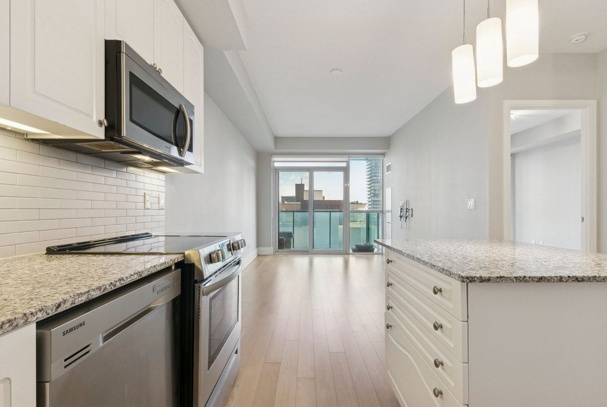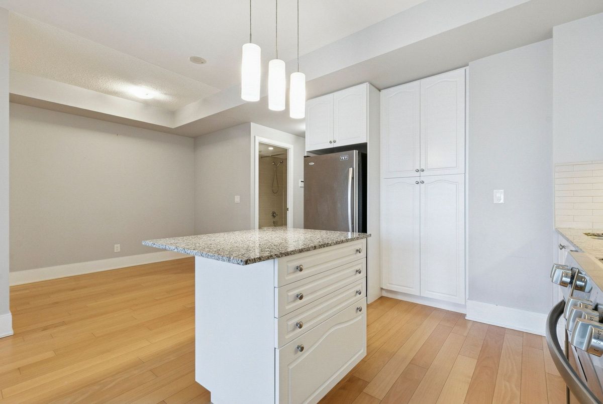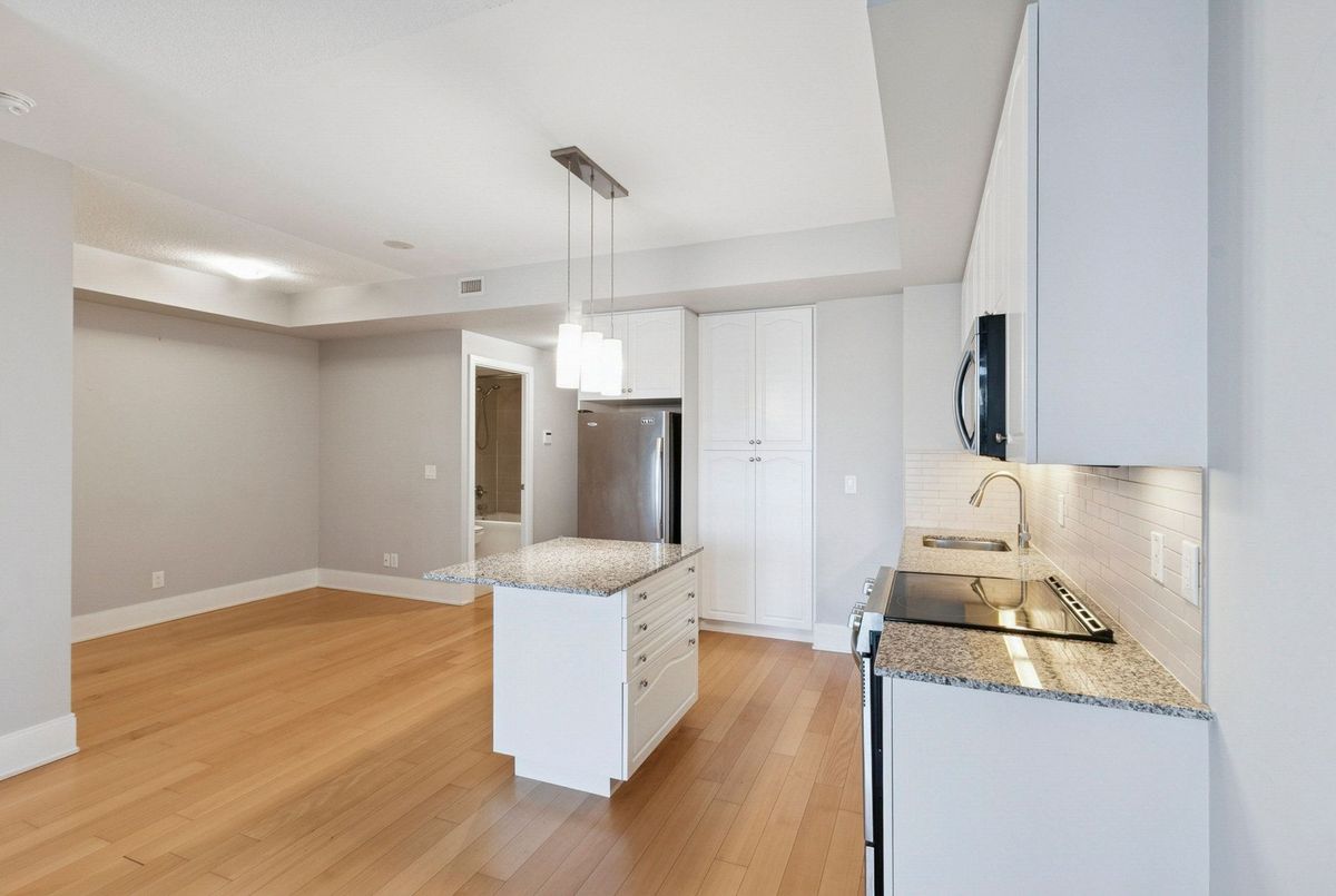This beautifully maintained suite offers approximately 650 sq ft of open-concept elegance in one of Midtown's most desirable communities. The modern kitchen features a sleek centre island, a stylish backsplash, and additional cabinetry that maximizes storage and functionality. Hardwood and quality laminate flooring flow throughout the space, offering a clean, carpet-free living environment. With its unobstructed city views and bright, spacious layout, the home feels both warm and sophisticated. A standout feature is the generously sized den, large enough to serve comfortably as a second bedroom or a dedicated home office, providing exceptional flexibility for your lifestyle. Residents enjoy premium amenities, including a 24-hour concierge, a state-of-the-art fitness centre with steam room and sauna, a gorgeous party room with a show kitchen, a private theatre, and an inviting cabana lounge. Just steps from the subway, top-rated restaurants, boutique shops, and the highly esteemed North Toronto Collegiate Institute, this suite offers unmatched convenience and a truly elevated urban living experience.