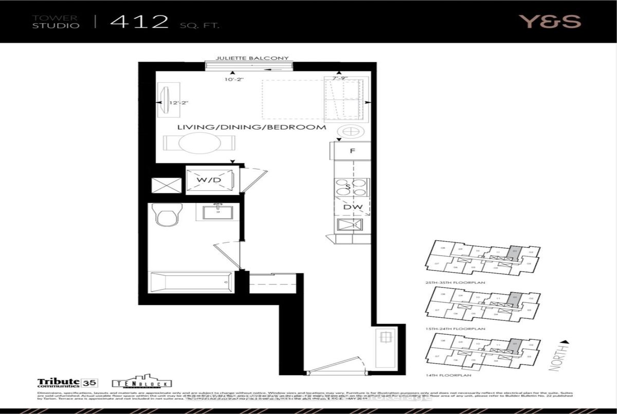 Y&S Condos by Tribute Communities brings modern midtown living to the heart of Yonge & Soudan. This brand-new building with thoughtful design offers convenience, being located close to the Eglinton Station, the future Crosstown LRT, shops, cafes, and restaurants. This bright studio suite has a kitchen that offers a clean, modern finish with a combined living/bedroom, making the space ideal for young professionals. Residents enjoy amenities, including co-working lounges, meeting rooms, a full fitness centre, yoga studio, party rooms, children's play area, guest suite, and a large outdoor terrace with lounge areas, dining spaces, and BBQs - all supported by a 24-hour concierge.