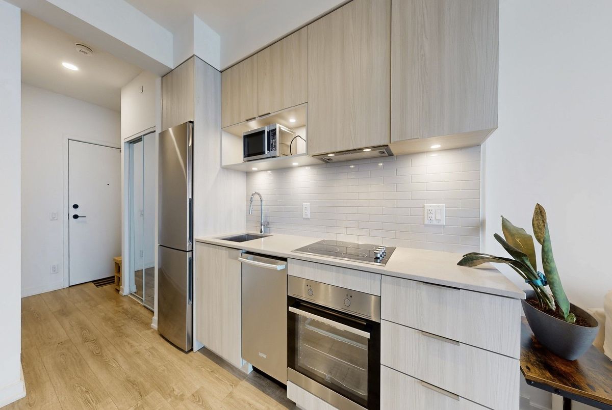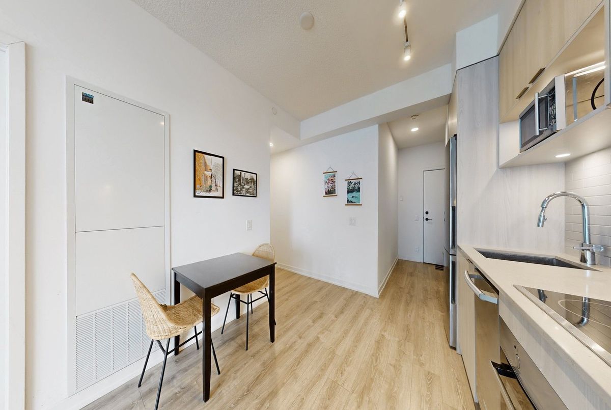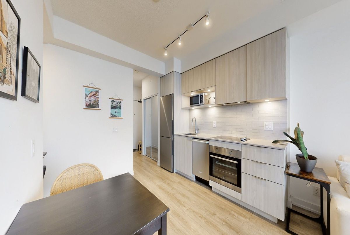 Welcome to The Wyatt Condominiums in Toronto's vibrant Downtown East. This bright and modern 1-bedroom suite offers a well-designed open-concept layout that maximizes space and functionality. The contemporary kitchen features sleek cabinetry, stainless steel appliances, generous storage, and seamless flow into the living and dining area-ideal for everyday living or entertaining. Large windows bring in abundant natural light, creating an airy atmosphere throughout, while the private balcony provides a comfortable outdoor retreat with city views. Residents enjoy an exceptional range of amenities designed to complement an active urban lifestyle, including a fully equipped fitness centre, rock climbing wall, sports and recreation facilities, theatre room, craft room, study and co-working spaces, guest suites, outdoor BBQ area, and a rooftop terrace with panoramic views of the city skyline. Located in a dynamic and growing neighbourhood with convenient access to transit, parks, shops, dining, and downtown core destinations. An excellent opportunity for first-time buyers, investors, or those seeking stylish and convenient city living.
