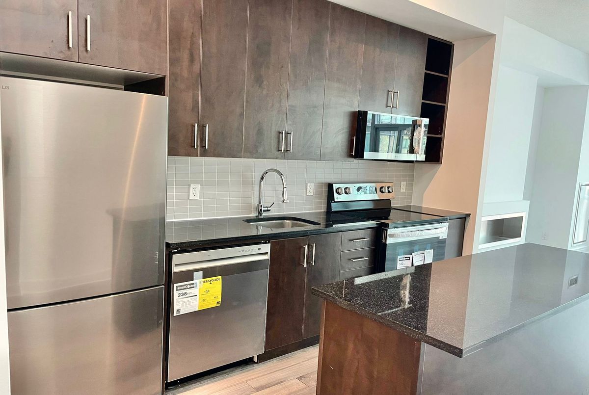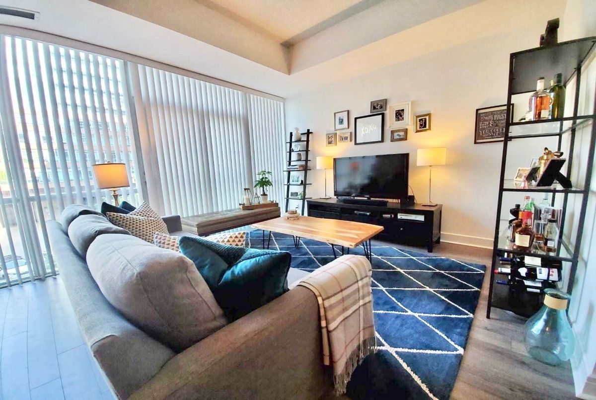 Stunning One Bedroom Suite + Den At The 'Vu' Building Over Looks A Quiet Courtyard, Built By Aspen Ridge Homes. Approximately 764 Sq.Ft. As Per Builder's Plan With Soaring 10 Ft High Ceiling, Brand New Appliances in Kitchen, Fridge, Stove, Range Hood, Microwave and Dishwasher. Juliette Balcony And Large Windows. Functional Layout That Offers Great Living Space. Easy Access To Don Valley Parkway, George Brown College, Gardiner Expressway, Saint James Park And The St. Lawrence Market. Steps To Distillery District And Financial Districts. Luxury Amenities Include: 24 Hours Concierge, Exercise Room, Guest Suites & More! Enjoy Lifestyle Community Activities Schedule. One Parking & One Locker Included.