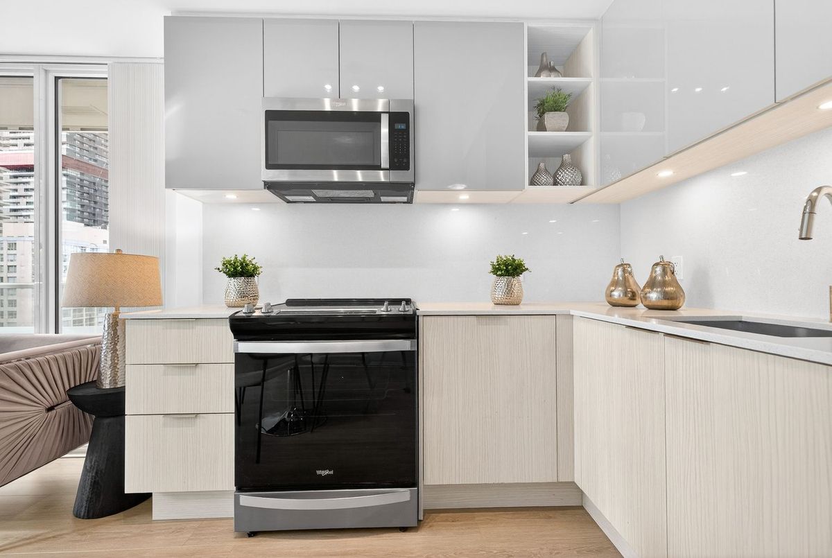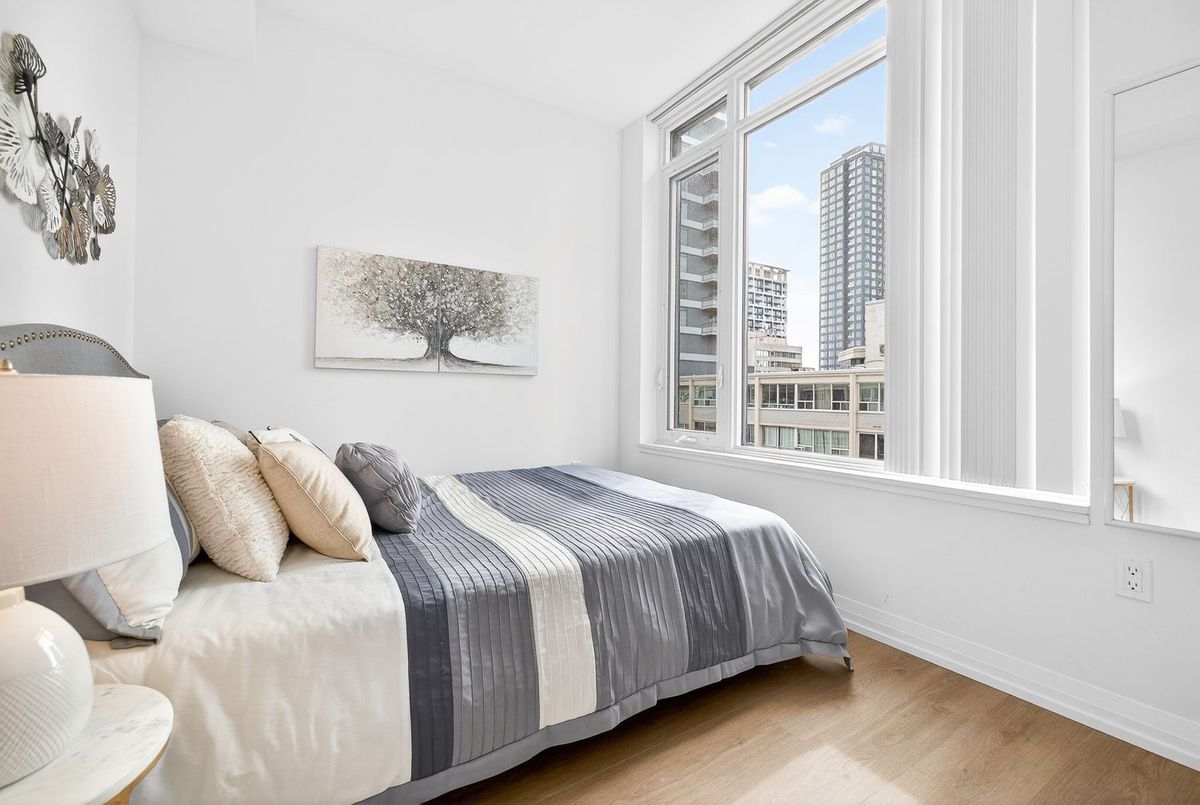 Welcome to Plaza Midtown - one of Toronto's most exciting new residences in the vibrant Yonge & Eglinton, jus 3mins walk to Eglinton Subway, new Crosstown LRT. This stunning 3-bedroom, 2-bath corner suite, 825 sf, on the 12th floor of a new 34-storey tower (completed 2024) offers soaring 9ft ceilings, bright, open-concept living, functional layout with panoramic city views. The modern kitchen features sleek two-tone cabinetry with grey gloss upper cabinets, light wood-grain lowers, quartz countertops with matching high-gloss white backsplash, and premium Whirlpool stainless steel appliances including a French-door refrigerator, built-in microwave, smooth-top range. The living and dining area is flooded with natural light from floor-to-ceiling windows and a sliding glass door leading to the generous wrap-around balcony, offering panoramic views of the Toronto skyline while you enjoy your morning coffee or evening sunsets with sweeping vistas in multiple directions. Contemporary finishes throughout, includes a primary suite with ensuite bath (walk-in glass shower with sleek hex mosaic tile), 2nd bedroom with city views, and a versatile third bedroom with frosted glass sliding door - ideal as a den/home office, with all newly-installed closet doors throughout the home. Additional highlights include full-sized, in-suite stacked Whirlpool washer/dryer, light oak engineered flooring throughout, 1 Locker Included. Building Amenities: offers premium suite of amenities: 24-hour concierge with marble lobby and water feature wall, fully equipped fitness centre with Matrix equipment, yoga / cardio studios, steam room, stunning rooftop outdoor pool, hot tub, sun deck, BBQ areas, party room with catering kitchen, private dining room, media and games room, co-working lounge, and guest suites. Neighbourhood Highlights: Walk Score: 97 | Transit Score: 95. Walking distance to Yonge-Eglinton Centre, Loblaws, Farmboy, Cineplex VIP, diverse restaurants, cafes, boutique shops, and parks.