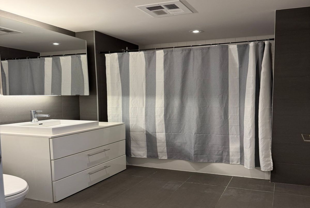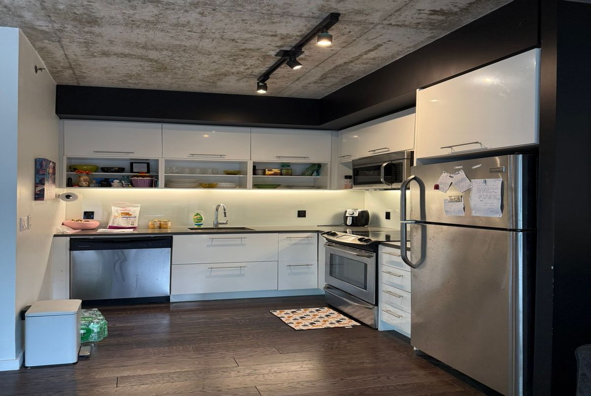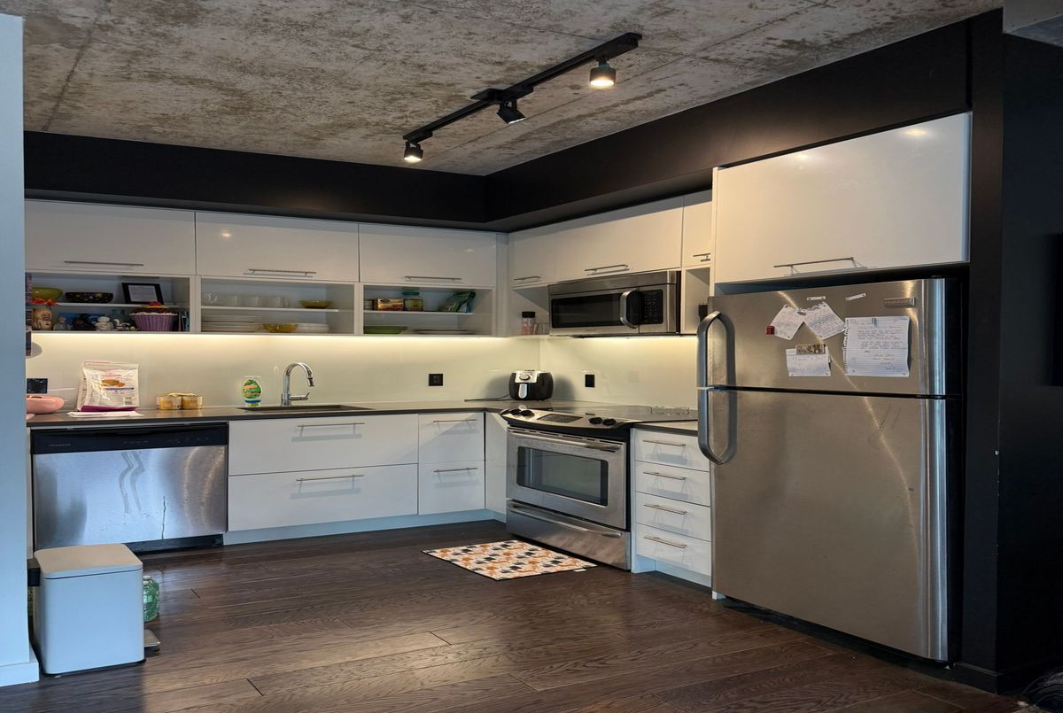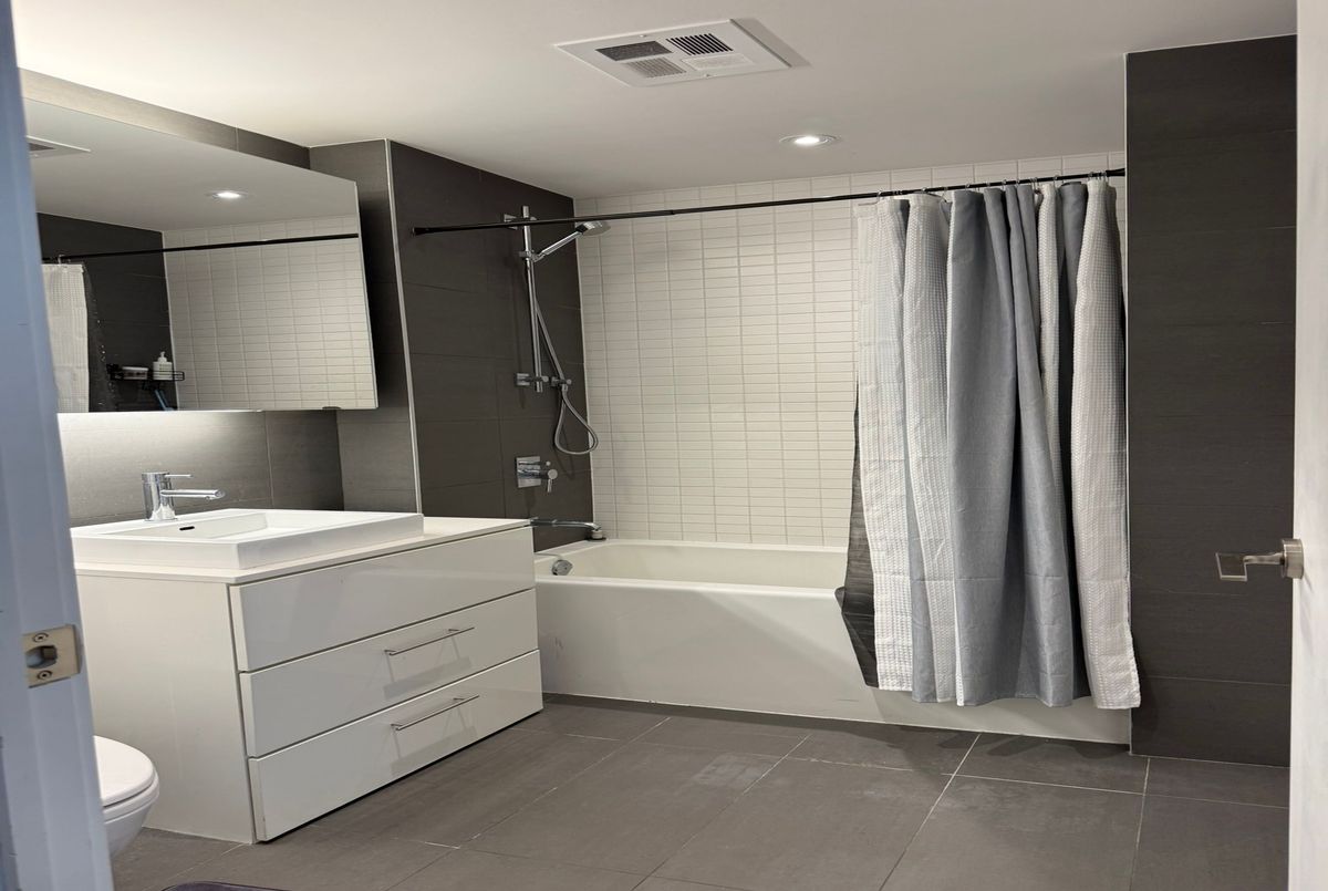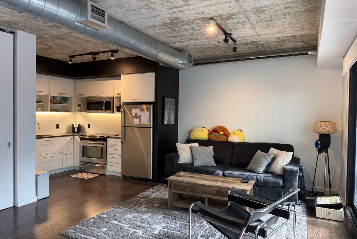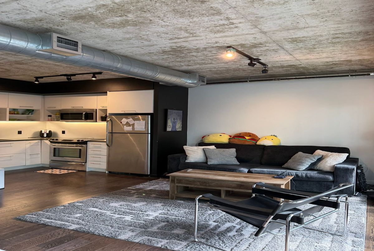 Experience modern urban living in River City Phase 1. This stylish loft-inspired suite offers approximately 638 sq ft of thoughtfully designed interior space, complemented by a 55 sq ft south facing balcony overlooking a beautifully landscaped courtyard. The unit features 1 bedroom plus a den and 1 Ensuite bathroom, with 9-foot exposed concrete ceilings, galvanized spiral ducts, and rich walnut flooring throughout. The modern kitchen is equipped with sleek white cabinetry, stainless steel appliances, and a grey quartz countertop, while the spa-like bathroom includes a fully tiled finish, deep soaker tub, large vanity, and integrated laundry closet. Residents enjoy access to premium building amenities, including: 24-hour concierge, Fully equipped fitness center, Two spacious party rooms with lounge, bar, kitchen, dining area, and billiards table, Guest suite for visitors, Outdoor pool, Sun deck and BBQ area.