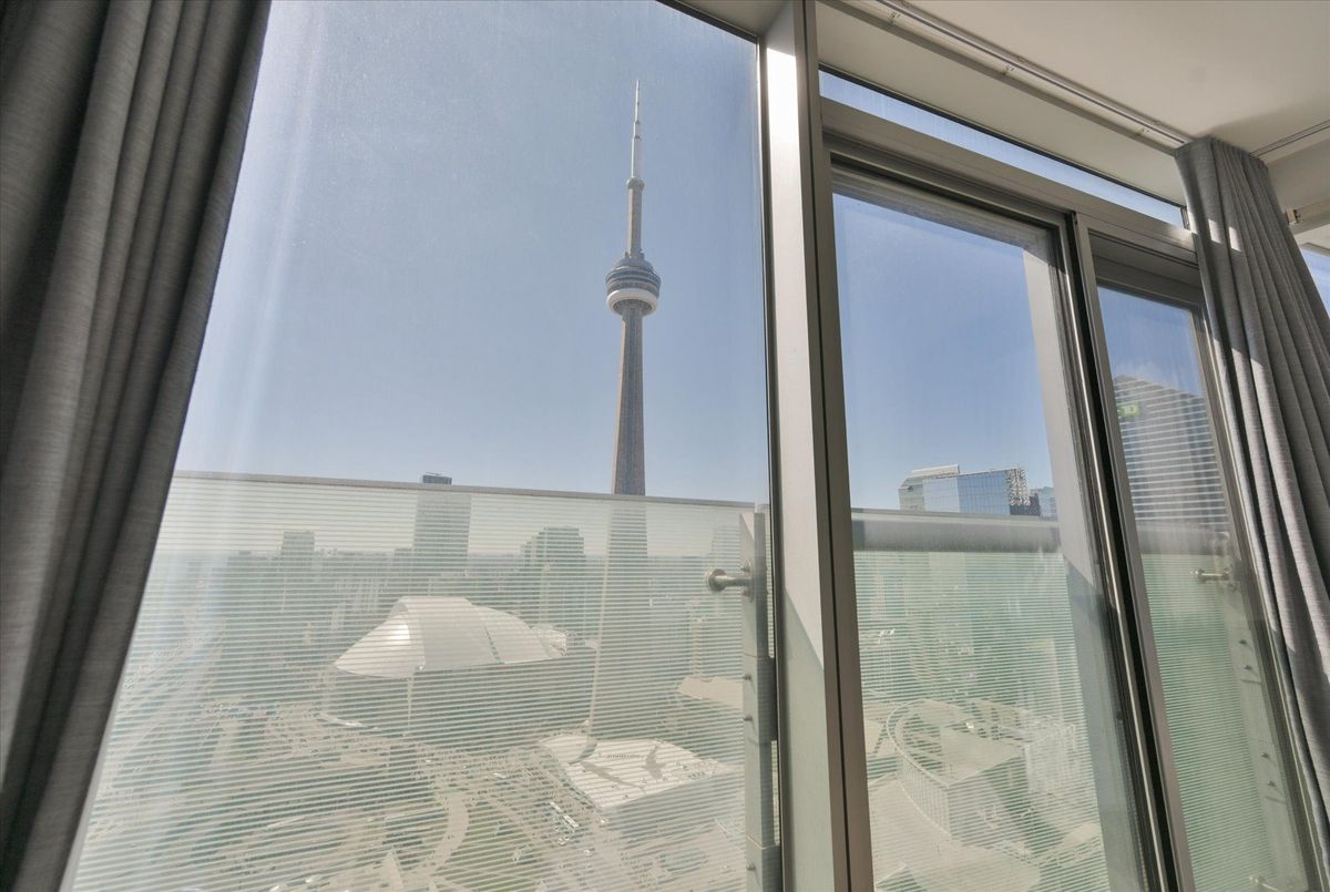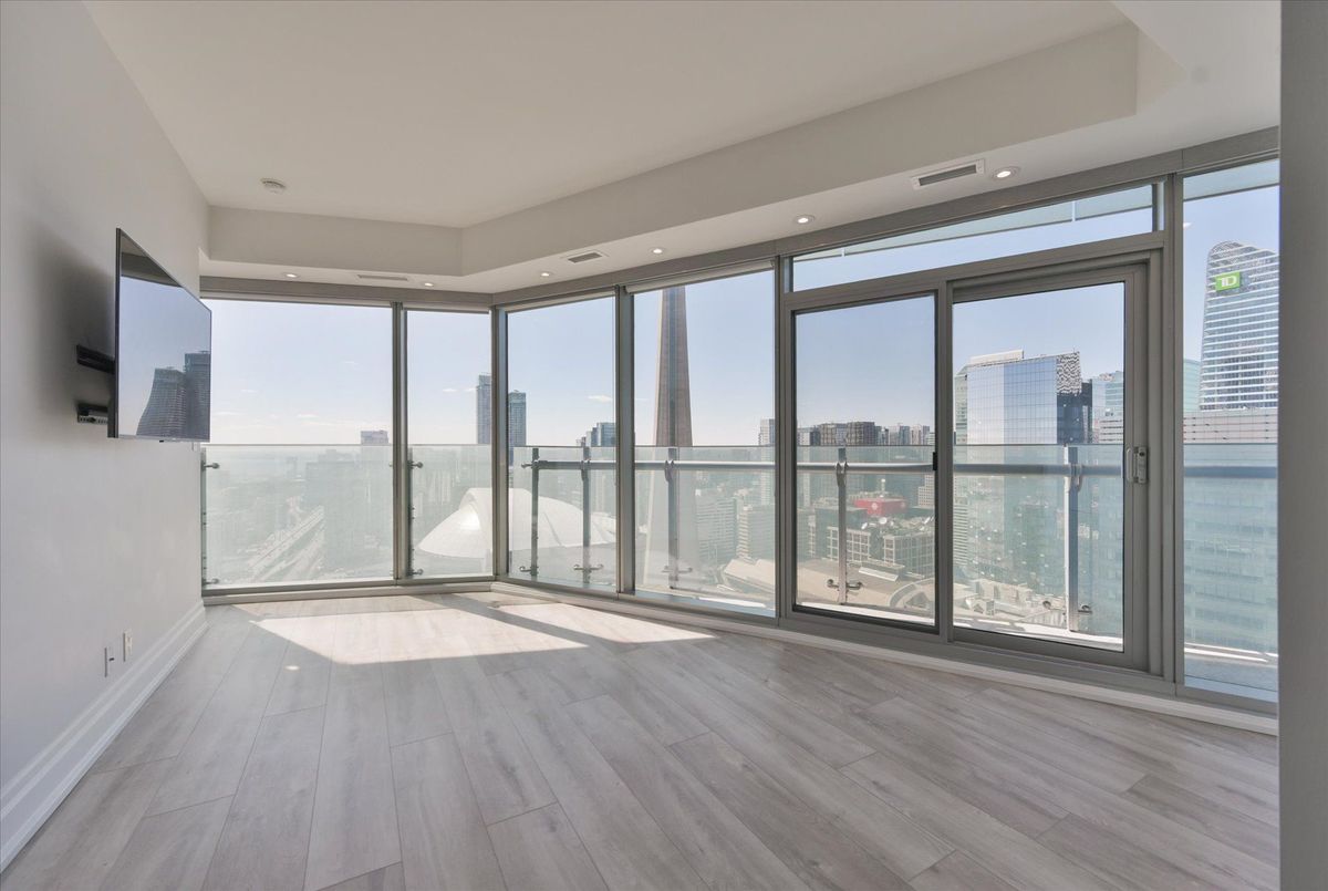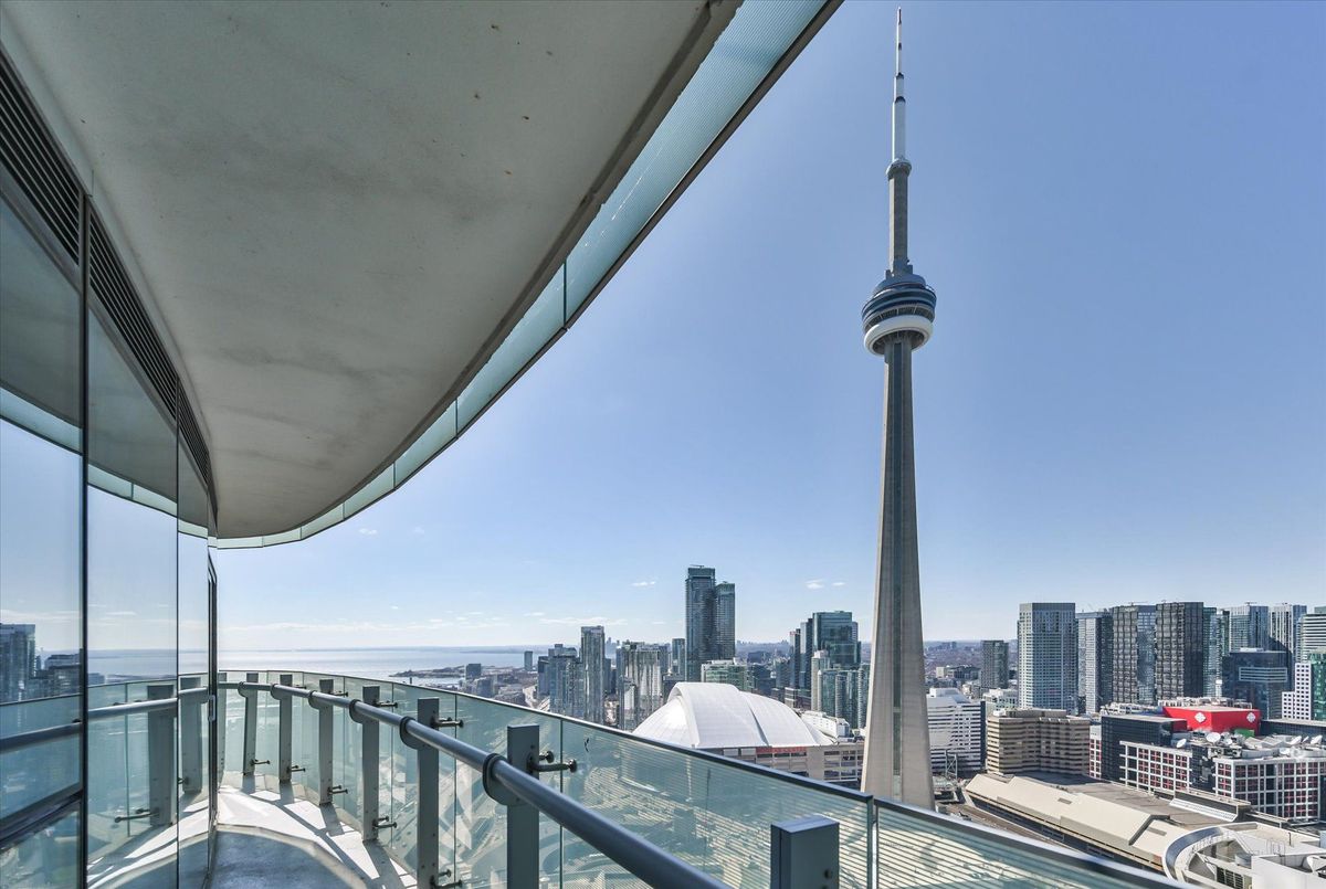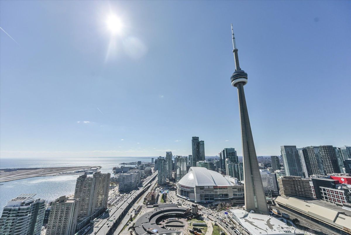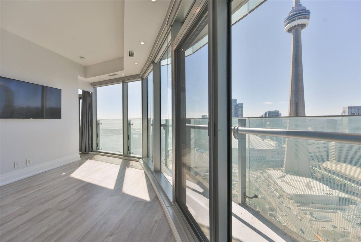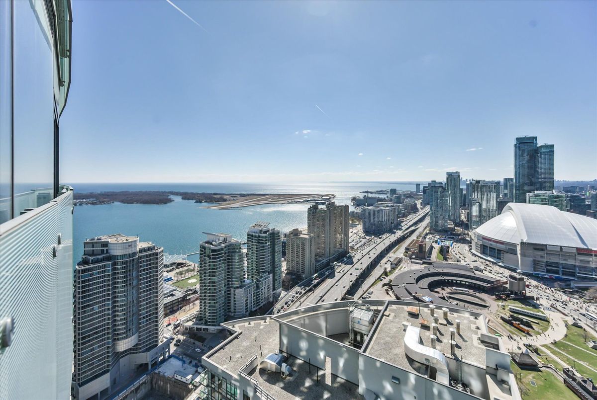 Welcome to the iconic ICE Condos in the heart of Downtown Toronto! This spectacular, renovated 715 sq. ft. suite offers the ultimate luxury urban rental experience. Perched high on the 40th floor, the unit boasts breathtaking, unobstructed panoramic views of the CN Tower, city skyline, and Lake Ontario through expansive, wrap-around floor-to-ceiling windows. This pristine suite features beautiful recent upgrades, including gorgeous light wood-tone flooring throughout that maximizes the abundant natural light. The modern, open-concept kitchen features sleek dark gloss cabinetry, frosted glass uppers, and integrated stainless steel appliances. The spacious bedroom boasts a chic accent wall, double closets with frosted sliding doors, and its own direct walk-out access to the balcony. Relax in the spa-inspired bathroom, complete with elegant marble-veined tiling and premium fixtures. Convenient in-suite, full-sized Blomberg laundry is also included. Enjoy an unbeatable location with a direct connection to the underground PATH network-walk indoors to Union Station, Scotiabank Arena, Maple Leaf Square, and Longo's supermarket! Just steps to the Harbourfront, Rogers Centre, Financial District, and world-class dining. Residents enjoy premium five-star building amenities including a state-of-the-art fitness center, indoor pool, hot tub, party room, lounge, and 24-hour concierge. Don't miss this rare opportunity to live in a highly sought-after unit with Toronto's most famous views right at your window!