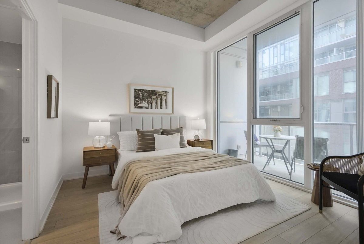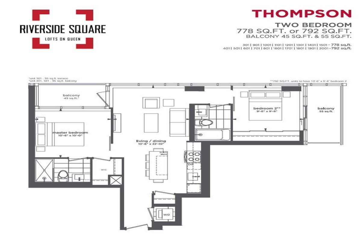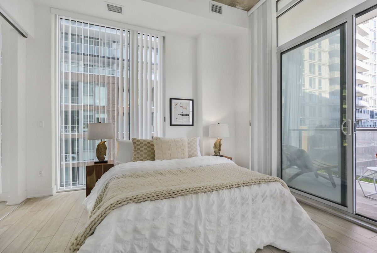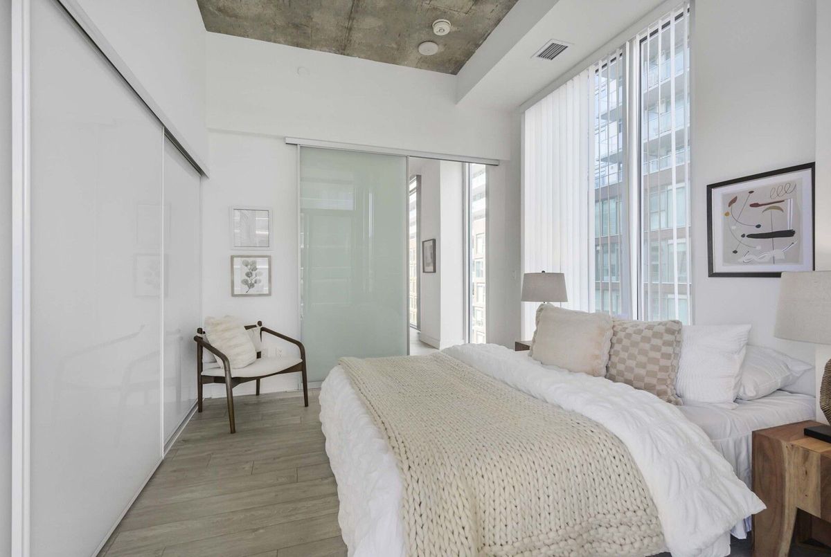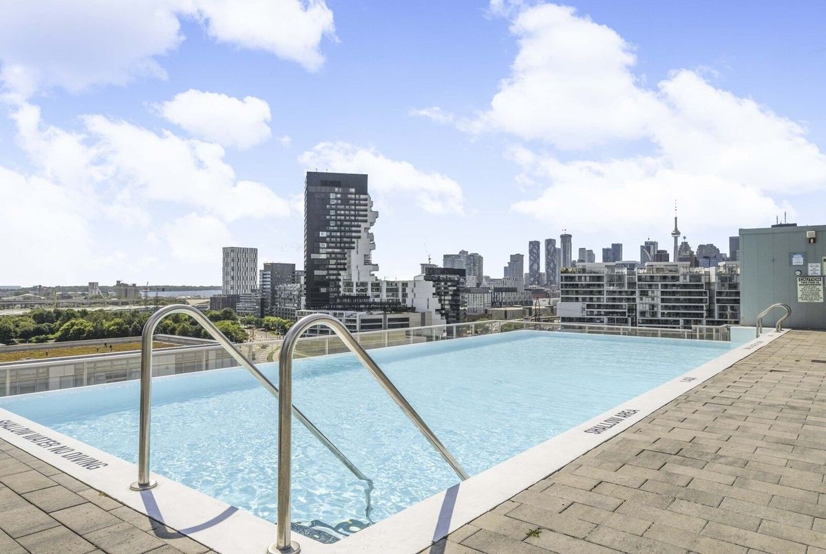 Welcome to Riverside Square, ideally located at the gateway of the Queen Street Bridge and Don Valley in Toronto's thriving East End. This modern NE corner 2-bedroom, 2-bath suite features laminate flooring throughout, an open-concept living and dining area with soaring 11 ft exposed concrete ceilings, floor-to-ceiling, wall-to-wall windows, a sleek kitchen with center island, and two open balconies. Residents enjoy extensive amenities including a rooftop infinity pool, terrace, gym, games room, party room, yoga studio, and more. Steps to trendy restaurants, cafés, shops, parks, and schools, with easy access to the Queen streetcar, DVP, and Gardiner Expressway. A vibrant community rich in history and character, Riverside is the perfect place to call home!