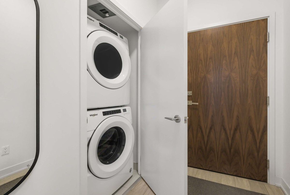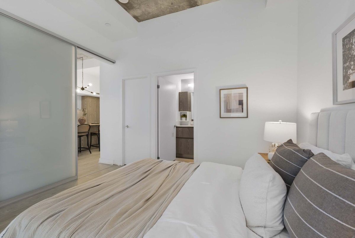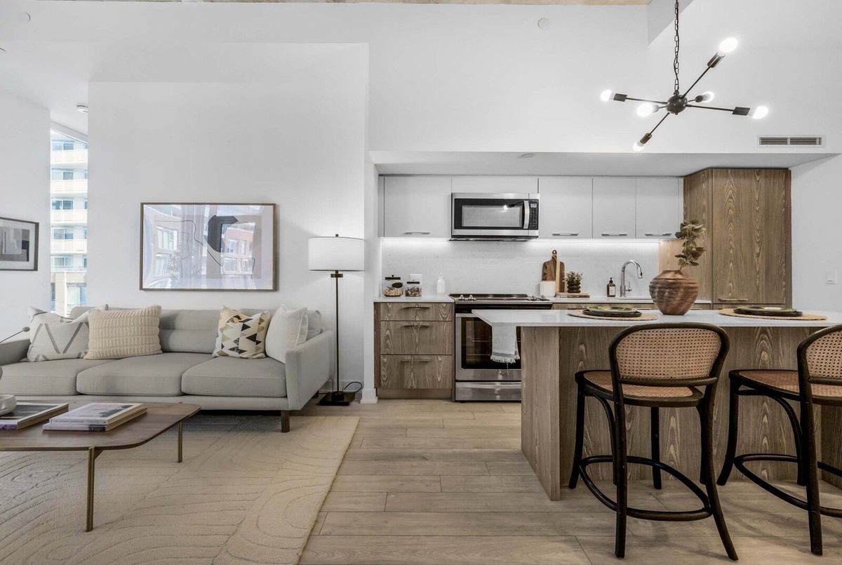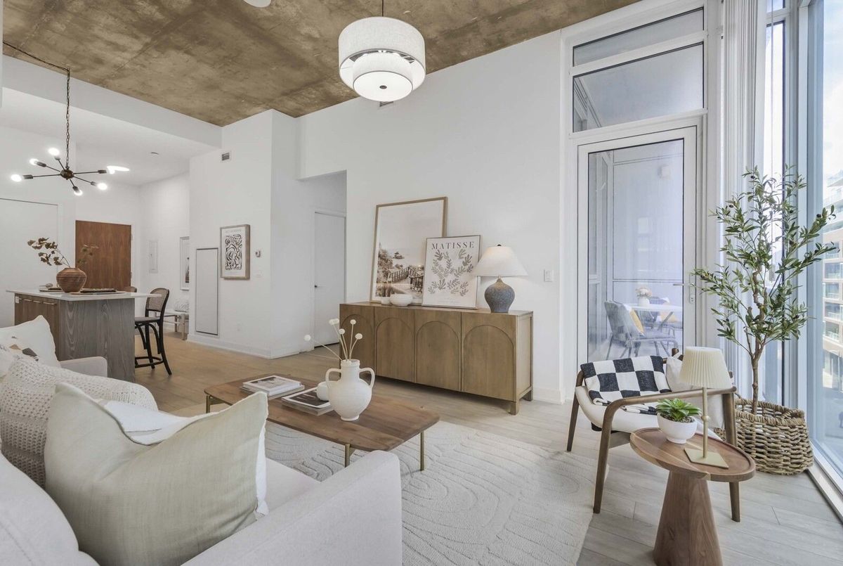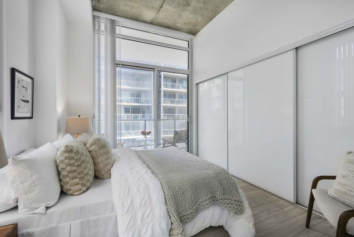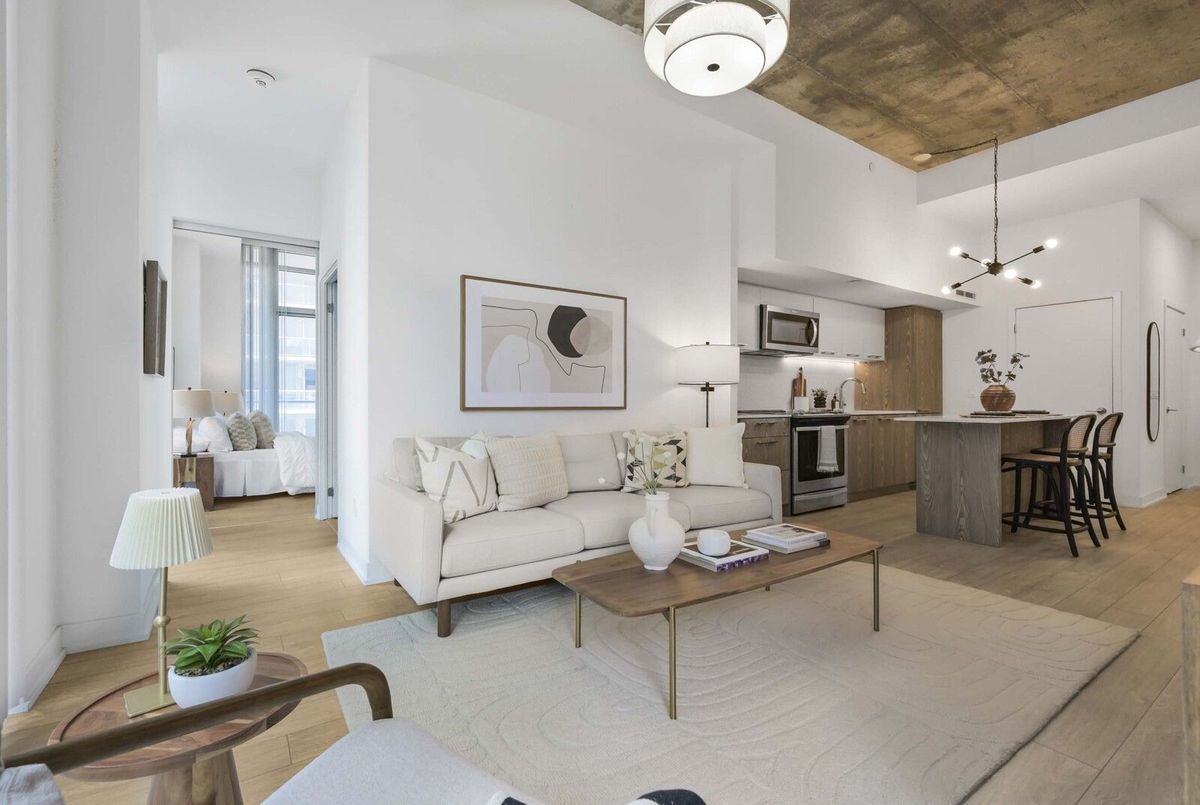 Welcome to Riverside Square, ideally located at the gateway of the Queen Street Bridge and Don Valley in Toronto's thriving East End. This modern NE corner 2-bedroom, 2-bath suite features laminate flooring throughout, an open-concept living and dining area with soaring 11 ft exposed concrete ceilings, floor-to-ceiling, wall-to-wall windows, a sleek kitchen with center island, and two open balconies. Residents enjoy extensive amenities including a rooftop infinity pool, terrace, gym, games room, party room, yoga studio, and more. Steps to trendy restaurants, cafés, shops, parks, and schools, with easy access to the Queen streetcar, DVP, and Gardiner Expressway. A vibrant community rich in history and character, Riverside is the perfect place to call home!