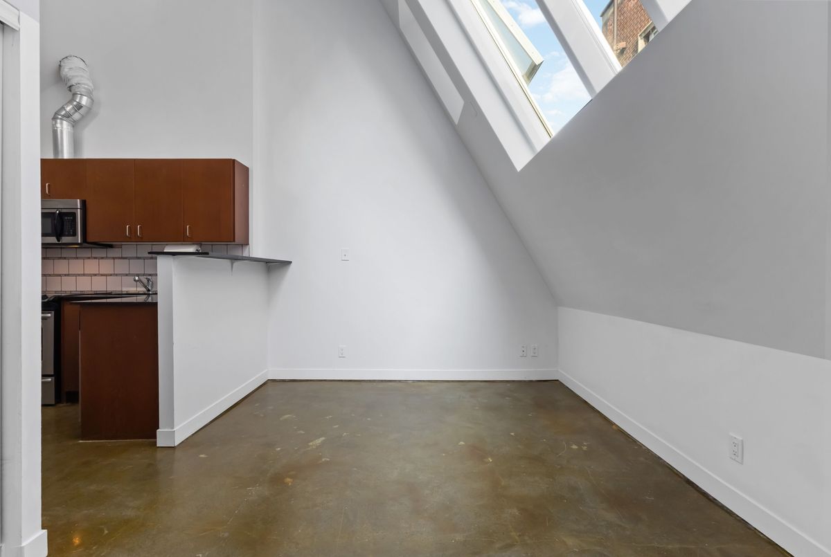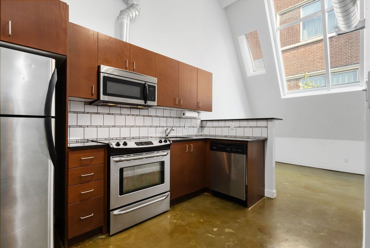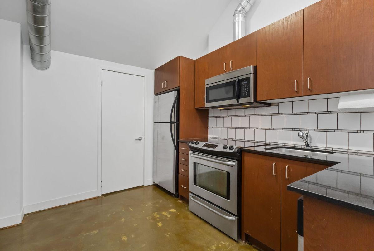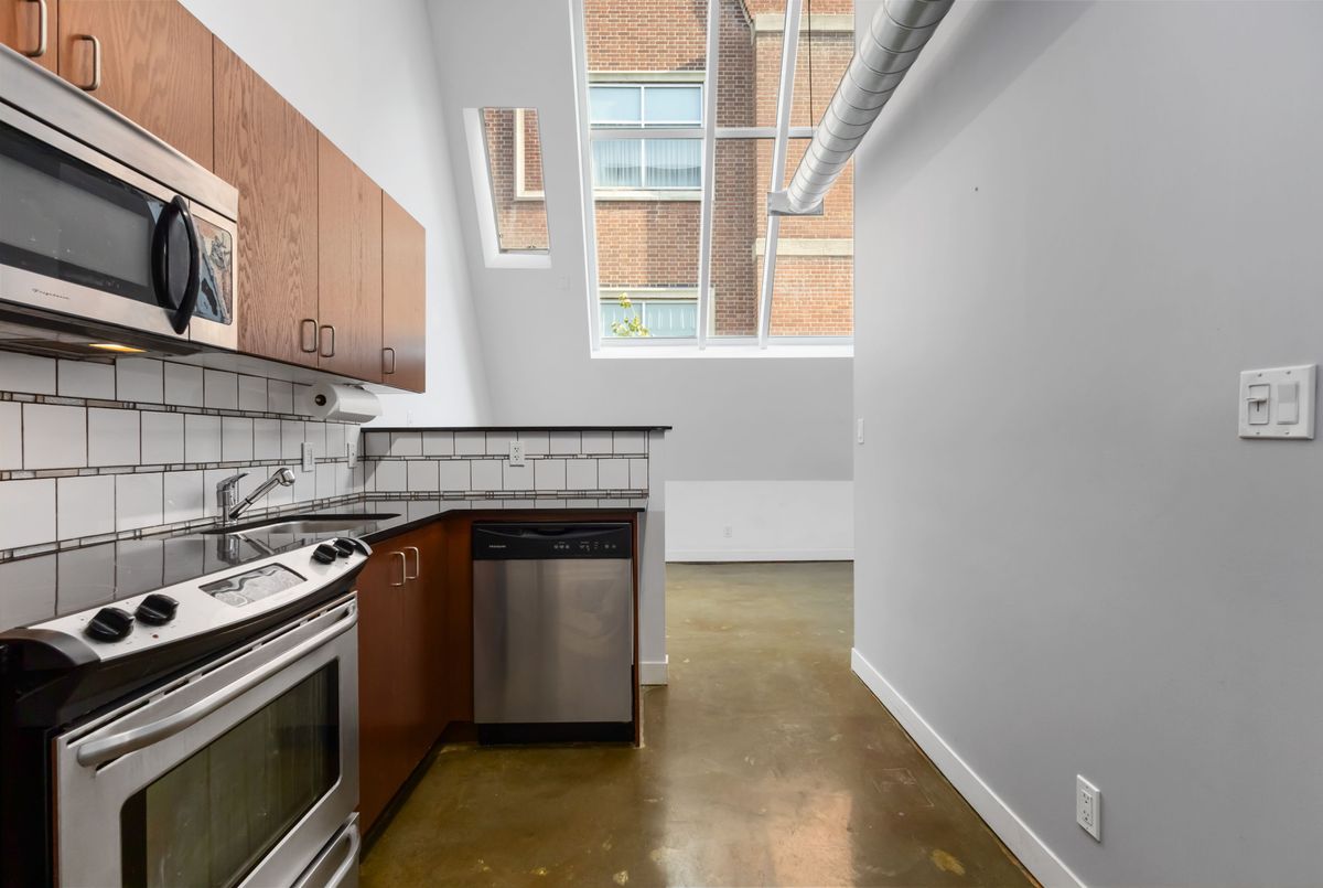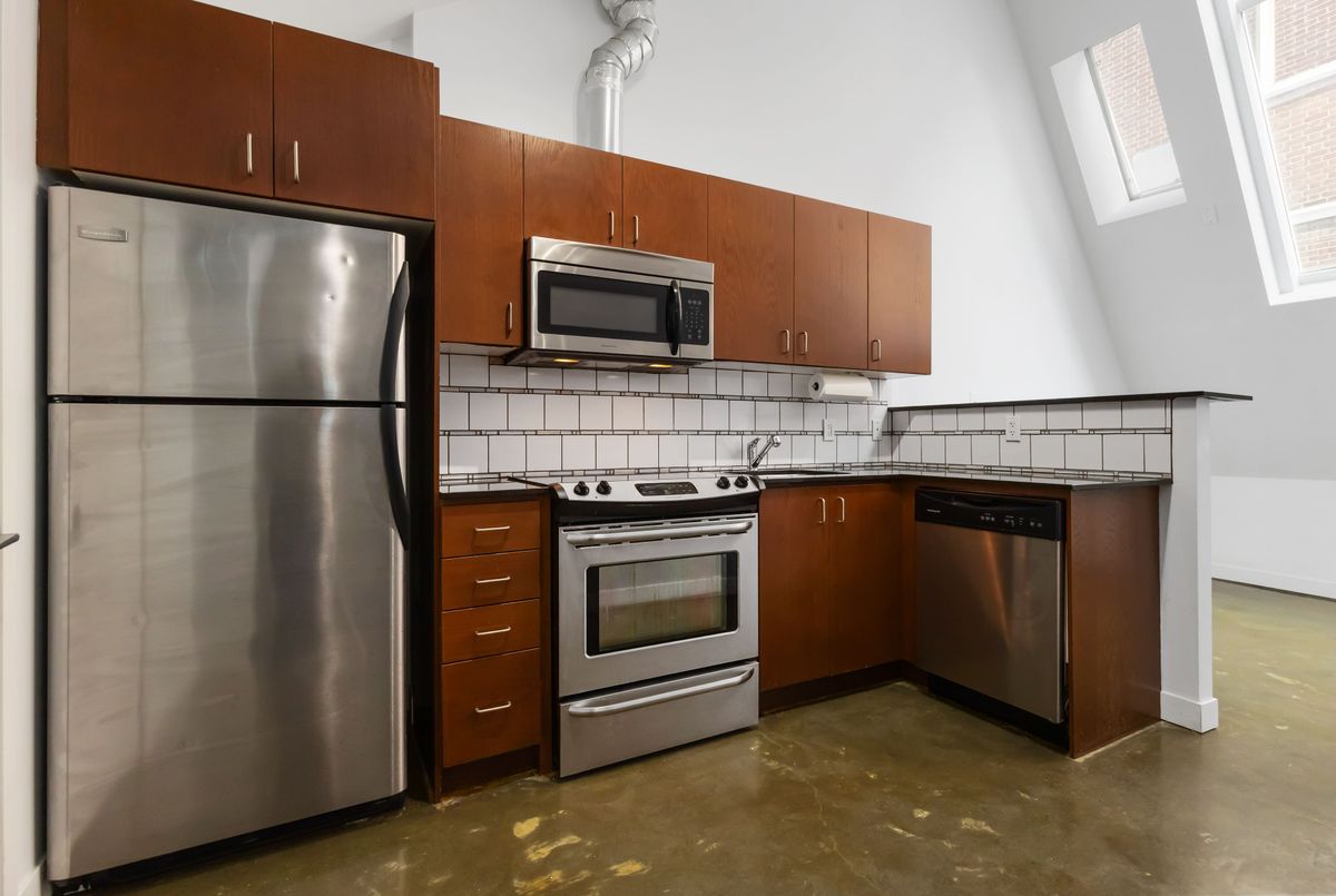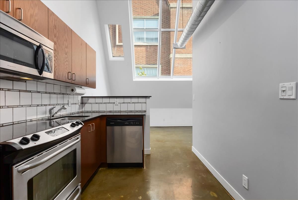 Discover the rare combination of character and functionality in Toronto's historic printing district! This converted 1 Bed + Den loft boasts 690 sq ft featuring soaring 22-foot vaulted ceilings and original concrete floors that showcase the building's historical past! The open-concept living area receives ample light through tall factory-style windows, while the separate den provides a versatile spot for a cozy home office or extra storage. The kitchen features stainless steel appliances great for entertaining! The loft retains its authentic charm through its exposed ductwork while leaving room for the next owner to place their own touches on the property. The generous bathroom includes a stand up shower, and the bedroom comes equipped with the laundry machines in the closet. Situated in a vibrant community just steps from Queen St, you will have a plethora of cafes, shops, and restaurants to choose from.