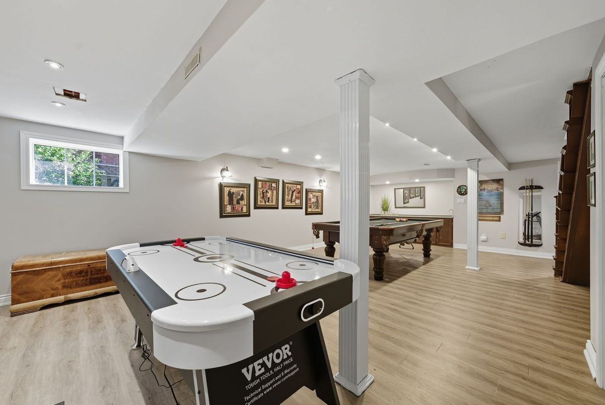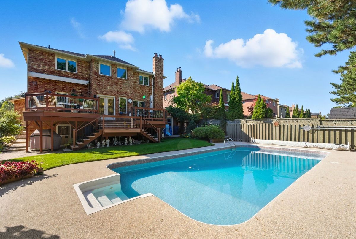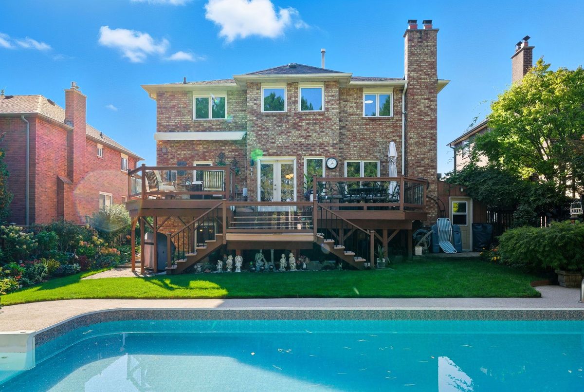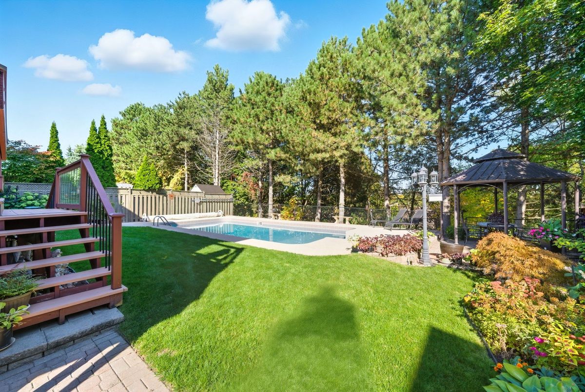 Welcome to this stunning 4 bedroom, 4 bath, all-brick family home exuding timeless elegance and modern comfort in a sought-after Ajax neighbourhood. Set on a premium lot with no neighbours behind, this property offers a private backyard oasis featuring an inground saltwater pool, perennial gardens, interlocking patio, vegetable beds, sprinkler system, gazebo, garden shed, and a two-tier composite deck with glass rails, retractable awning, and built-in surround sound overlooking the treed backdrop. Inside, the grand foyer leads to a traditional yet refined layout highlighted by a hardwood staircase with wrought iron spindles, crown moulding, smooth ceilings, pot lights, and gleaming hardwood floors. Entertain in the elegant living and dining rooms or relax in the cozy family room.The gourmet kitchen features granite counters, centre island, backsplash, stainless steel appliances including a gas stove, and a large pantry. The breakfast area offers walk-out to deck and pool, while the main floor laundry offers access to a fully insulated garage with tiled floors, gas furnace, car lift, and door to side yard. Upstairs, four generous bedrooms each have custom closet organizers. The primary retreat showcases French doors, a gas fireplace, an open-concept walk-in closet with quartz island, and a spa-like 5pc ensuite with freestanding tub, double quartz vanity, and glass rain shower. The finished basement adds a rec room, games area with wet bar, 2pc bath, and walk-out to the patio and pool. Close to top schools, parks, shopping, transit, and highways - this home defines luxury living and pride of ownership!
