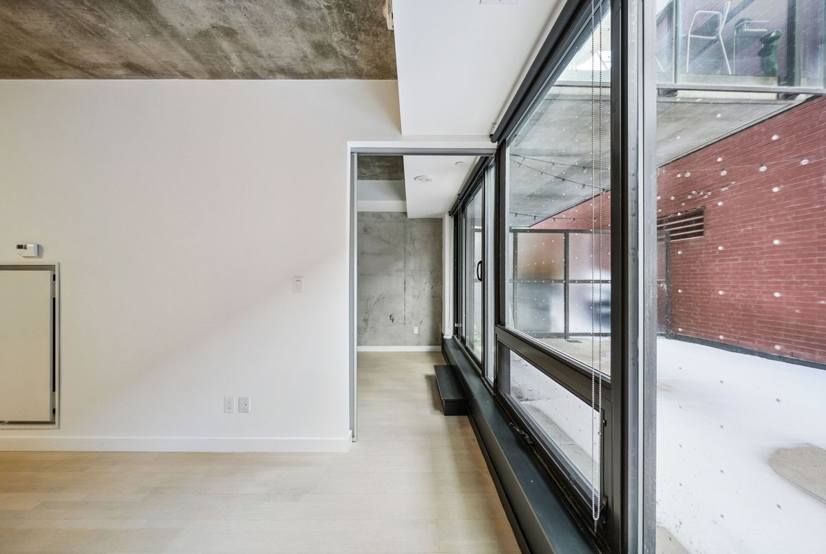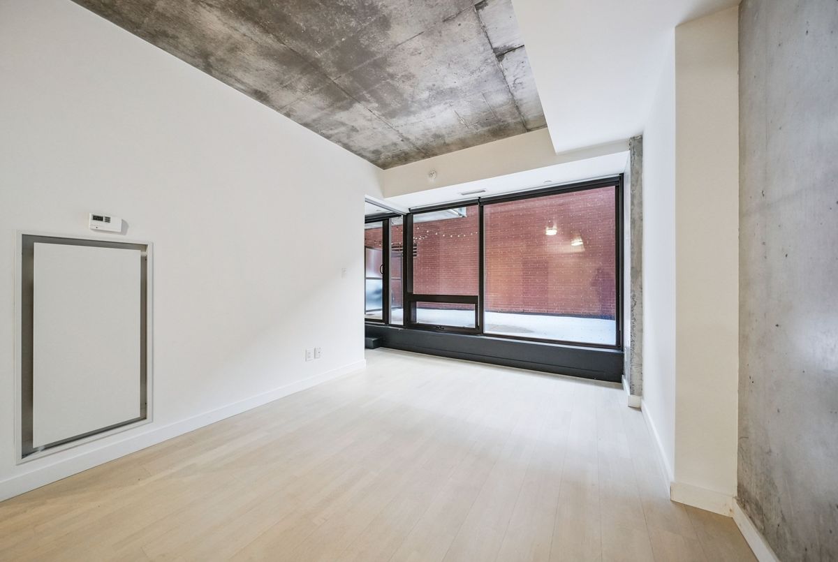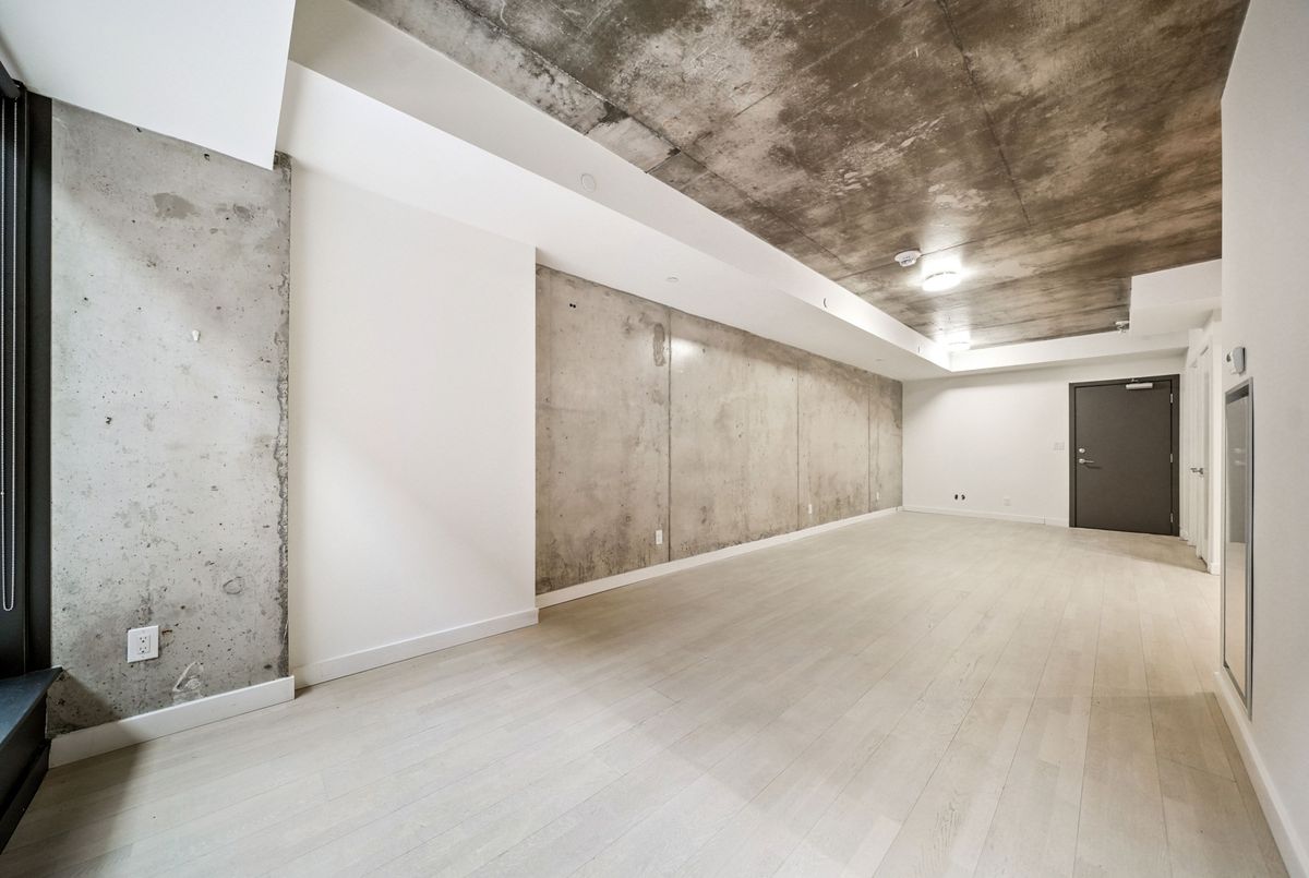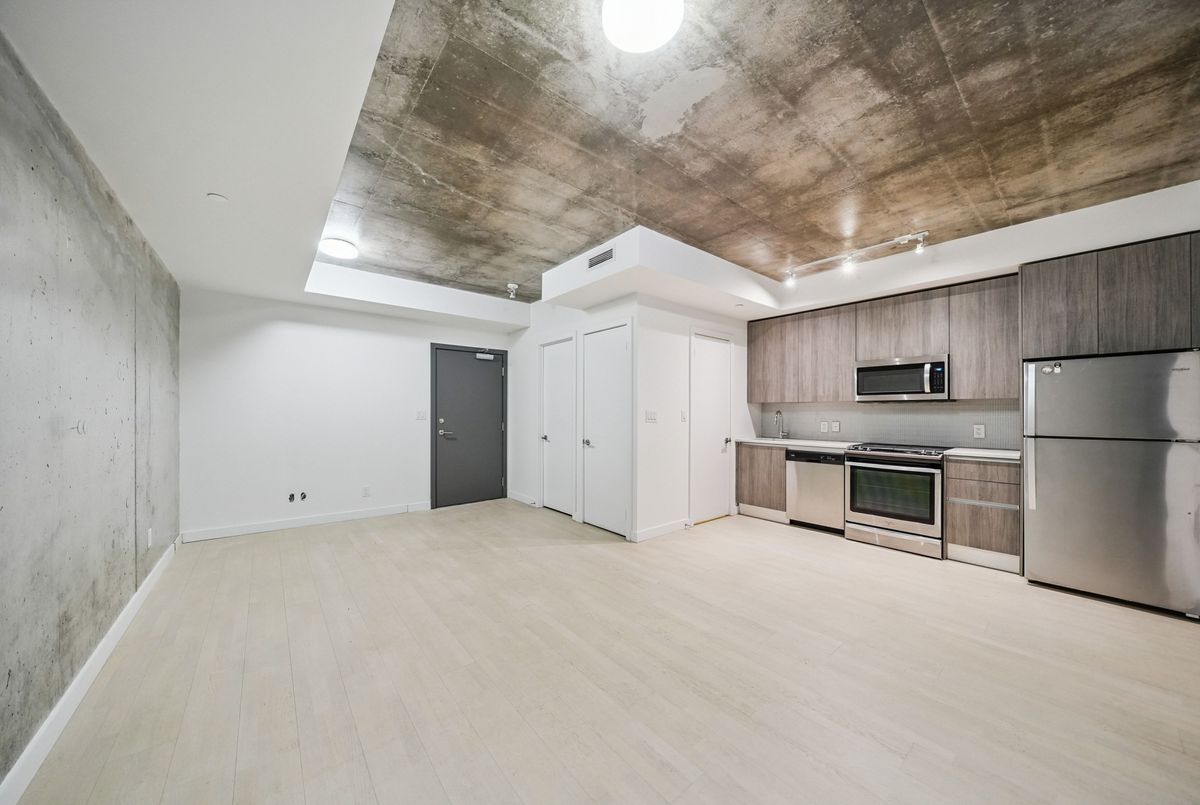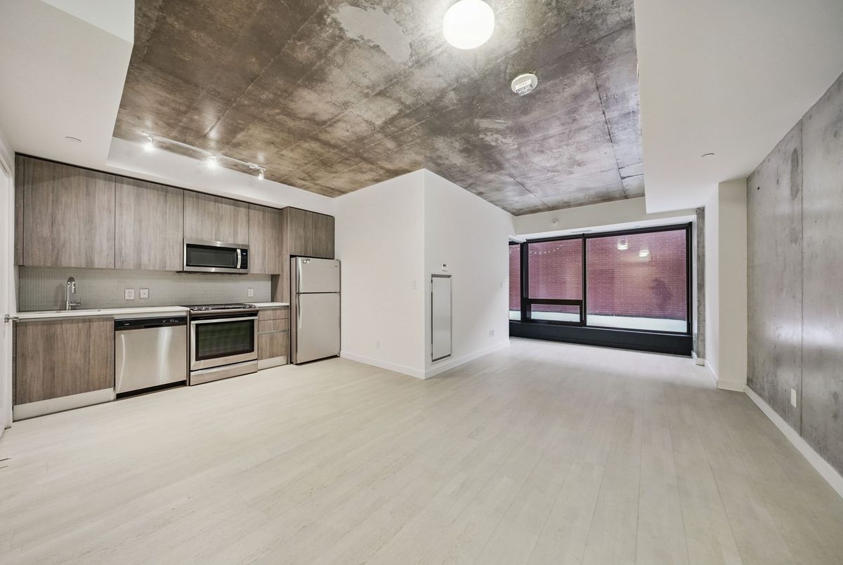 Stylish loft living! This thoughtfully designed suite offers nearly 700 sq ft of interior living space complemented by a rare 200+ sq ft private terrace, perfect for outdoor dining, entertaining, or creating your own urban oasis.The open-concept layout features exposed concrete ceilings and walls, wide-plank light flooring, and floor-to-ceiling windows. A sleek, modern kitchen is equipped with stainless steel appliances, ample storage, and enclosed in suite laundry. The private bedroom offers clean lines and a modern aesthetic. A four piece bath completes the space. Step outside to your oversized, terrace, an extension of your living area rarely found in the city. Additional features include a bike locker for extra storage. Located in steps to transit, cafes, restaurants, and shops, with easy access to downtown.
